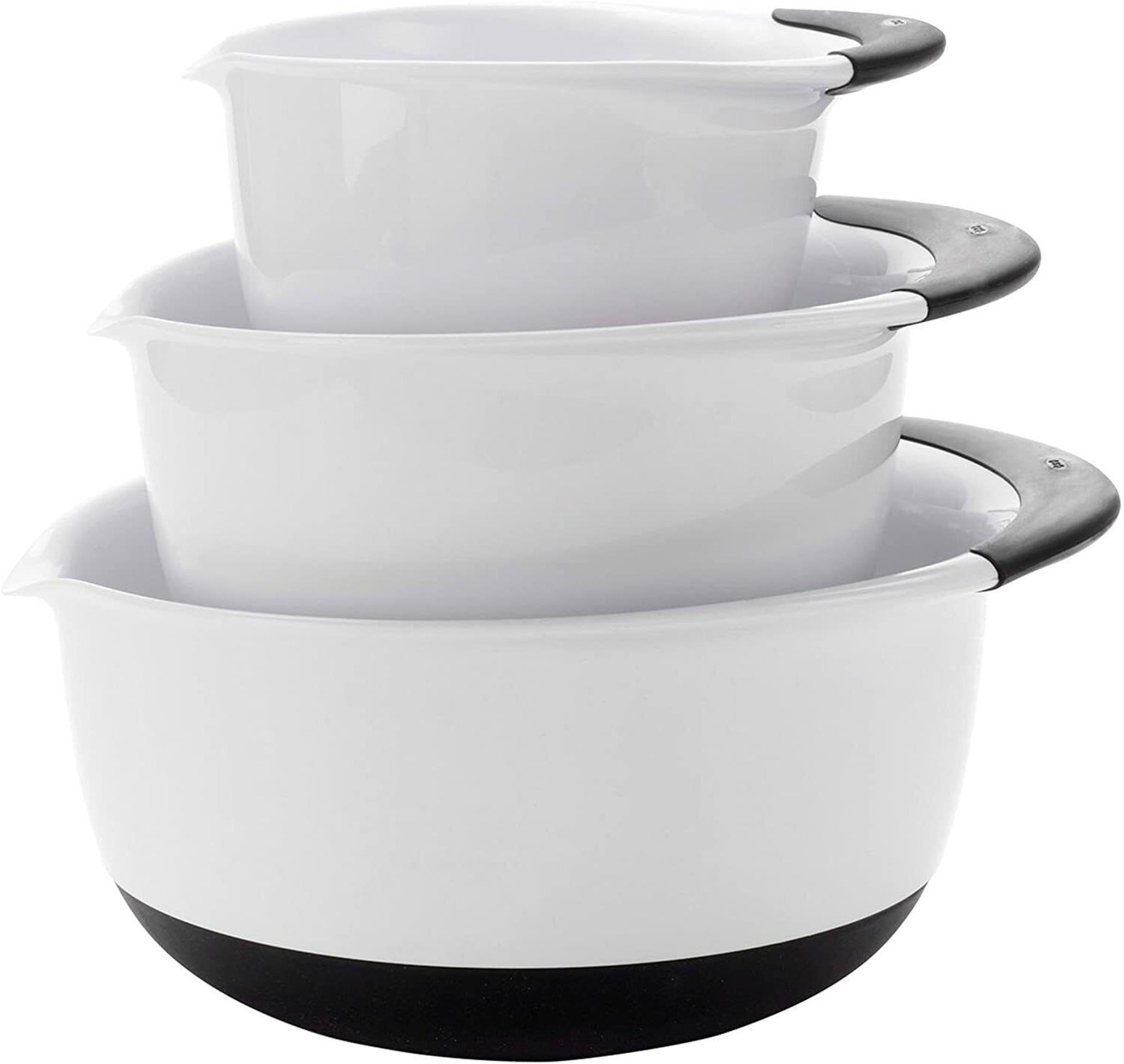 Non-slip bottoms ensure the Mixing Bowls stay put on countertops and feature a soft, comfortable handle that?s easy to grip. The wide lip and spout make it easy to pour ingredients. Bowls nest for convenient storage. Also available individually and in assorted colors.
