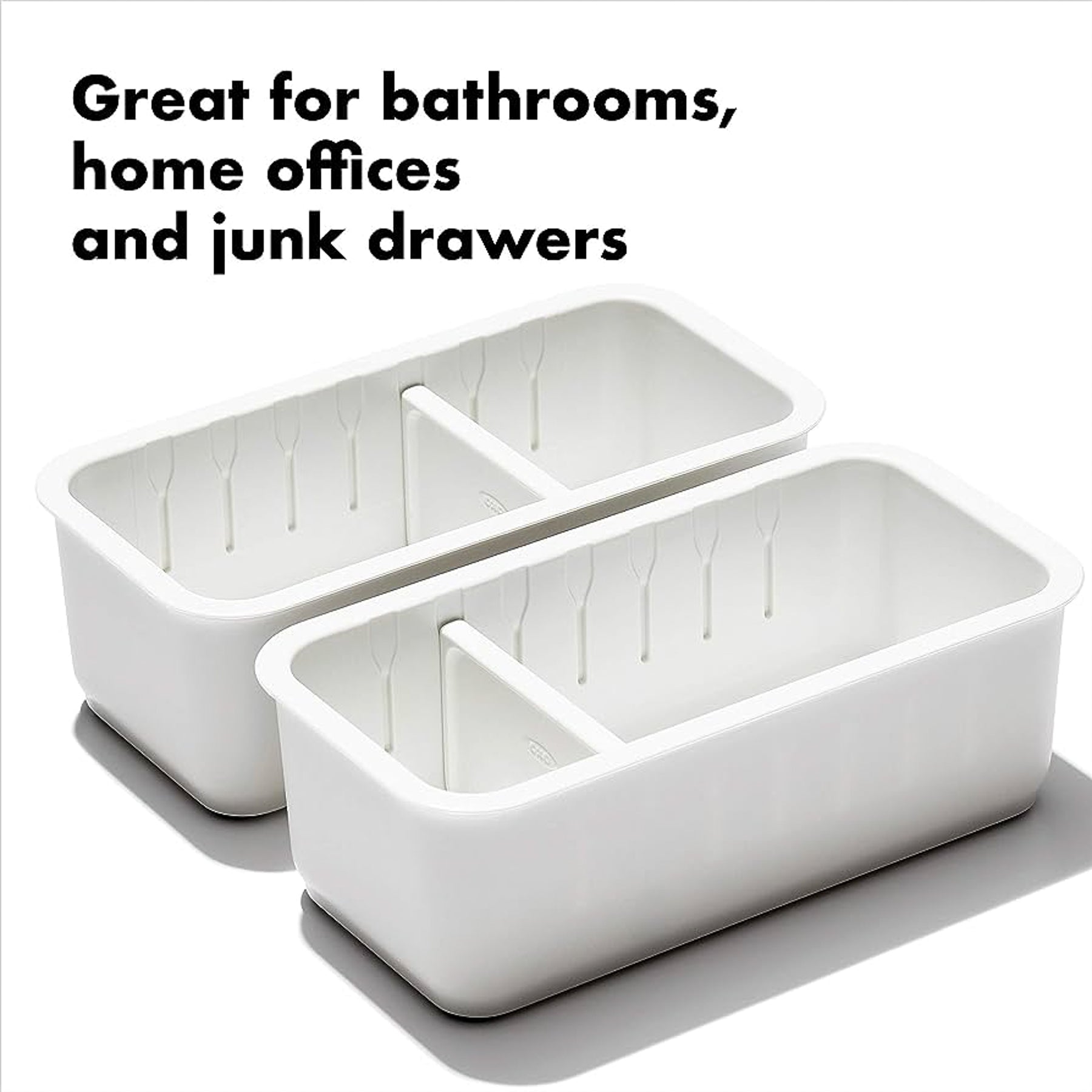 Organize office supplies and manage messy makeup drawers. The OXO Good Grips 2-Piece Slim Adjustable Drawer Bin Set helps you take control and tidy even the messiest drawers. Each Bin has a space-saving design that keeps items neat and easy to find. The removable, adjustable dividers let you customize the compartment sizes to declutter junk drawers, toiletries and more. Non-slip feet keep the Bins from shifting when you open and close drawers. Set includes: Two 3 in x 6 in/7.6 cm x 15.2 cm Bins with dividers.