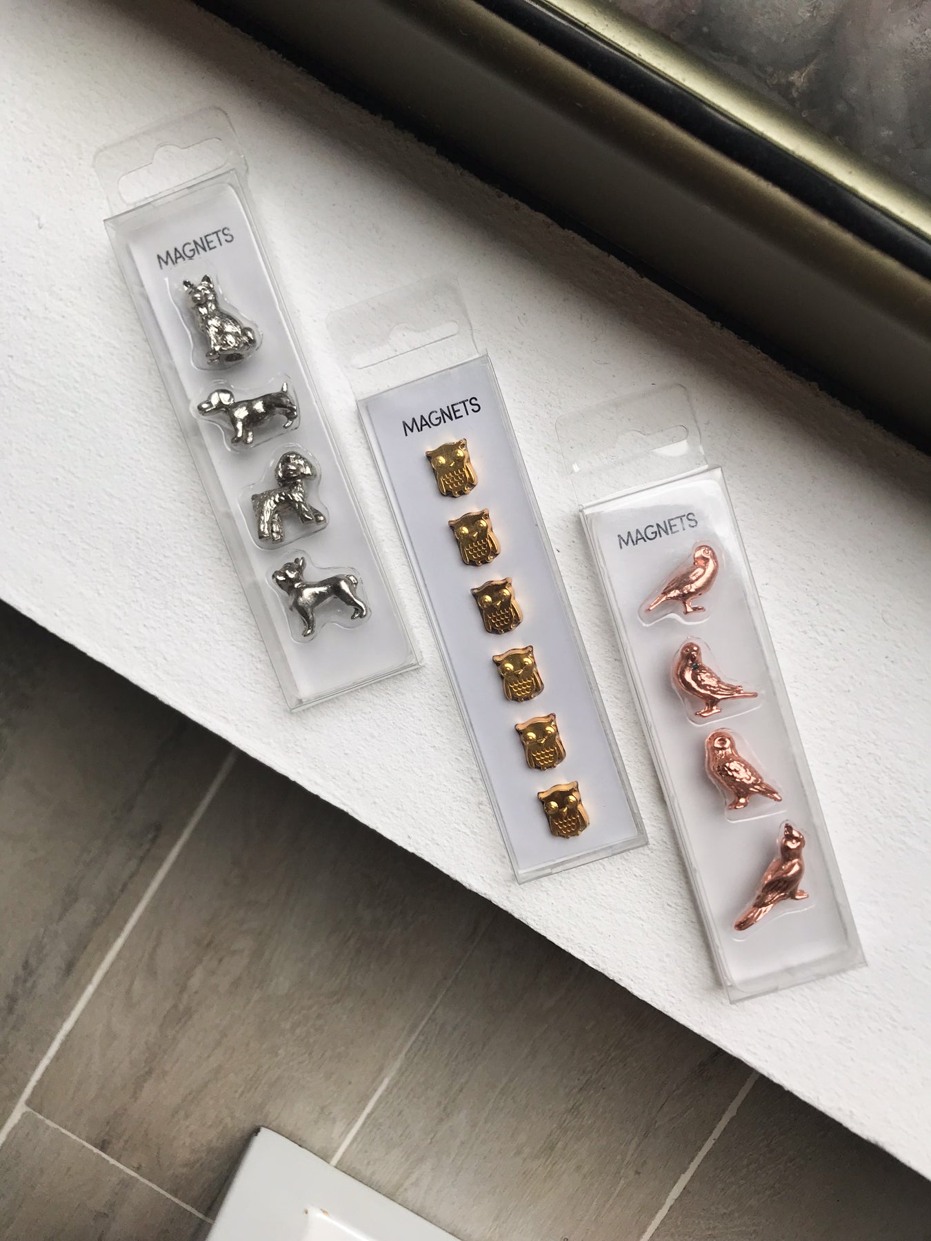 Solid cast metal pieces, backed by mighties® magnets, plated in silver, pewter, copper and gold. Each animal design comes in different quantities. Check picture for reference and quantity.