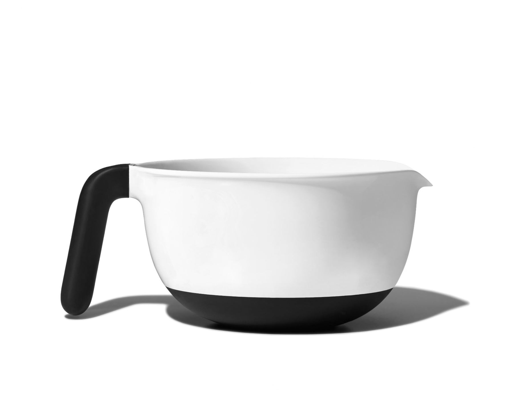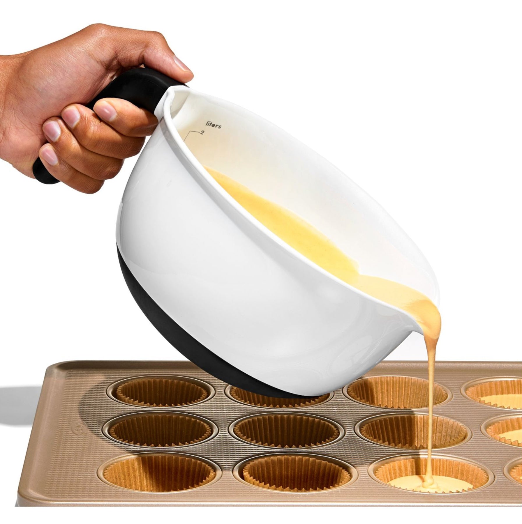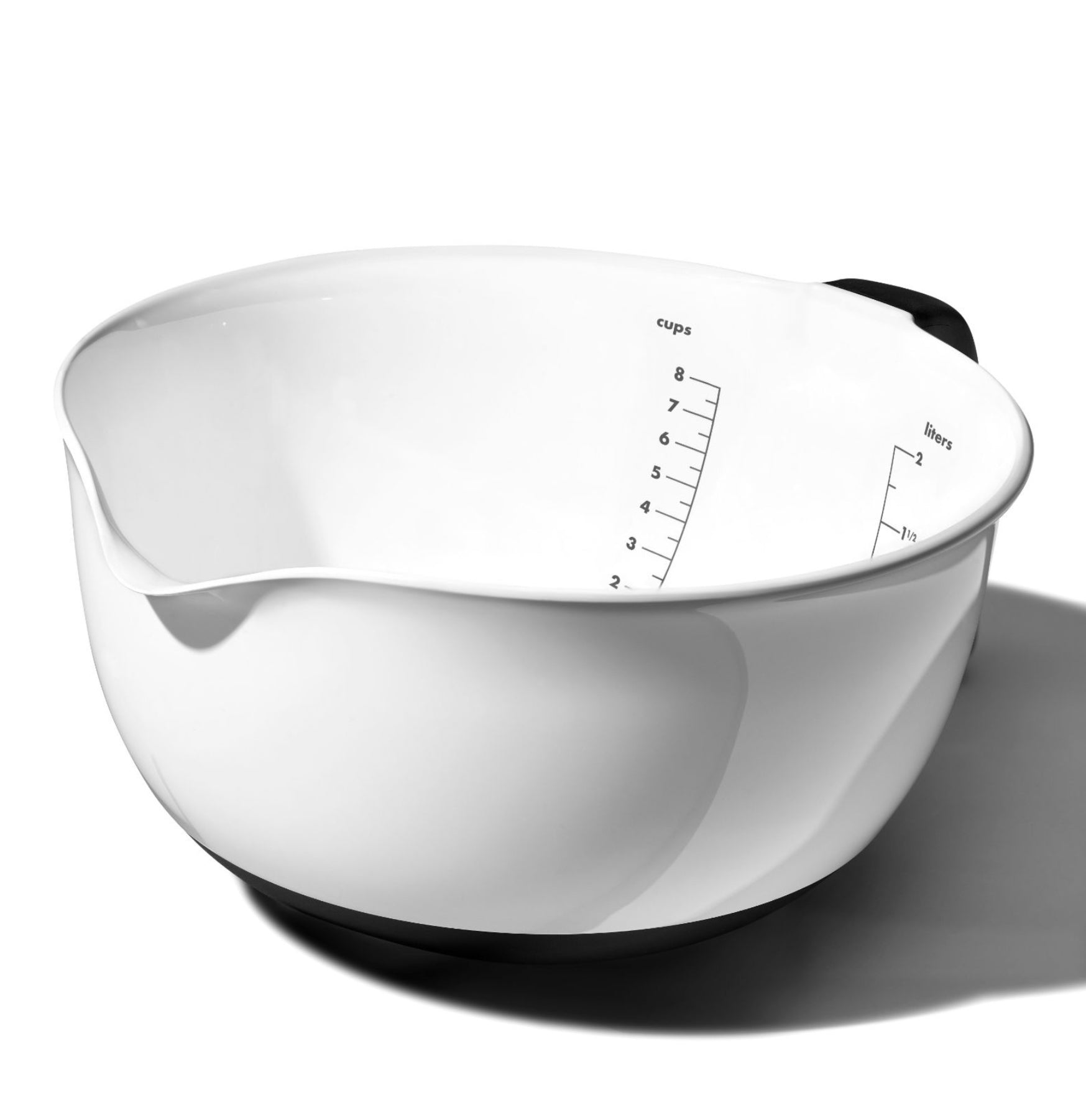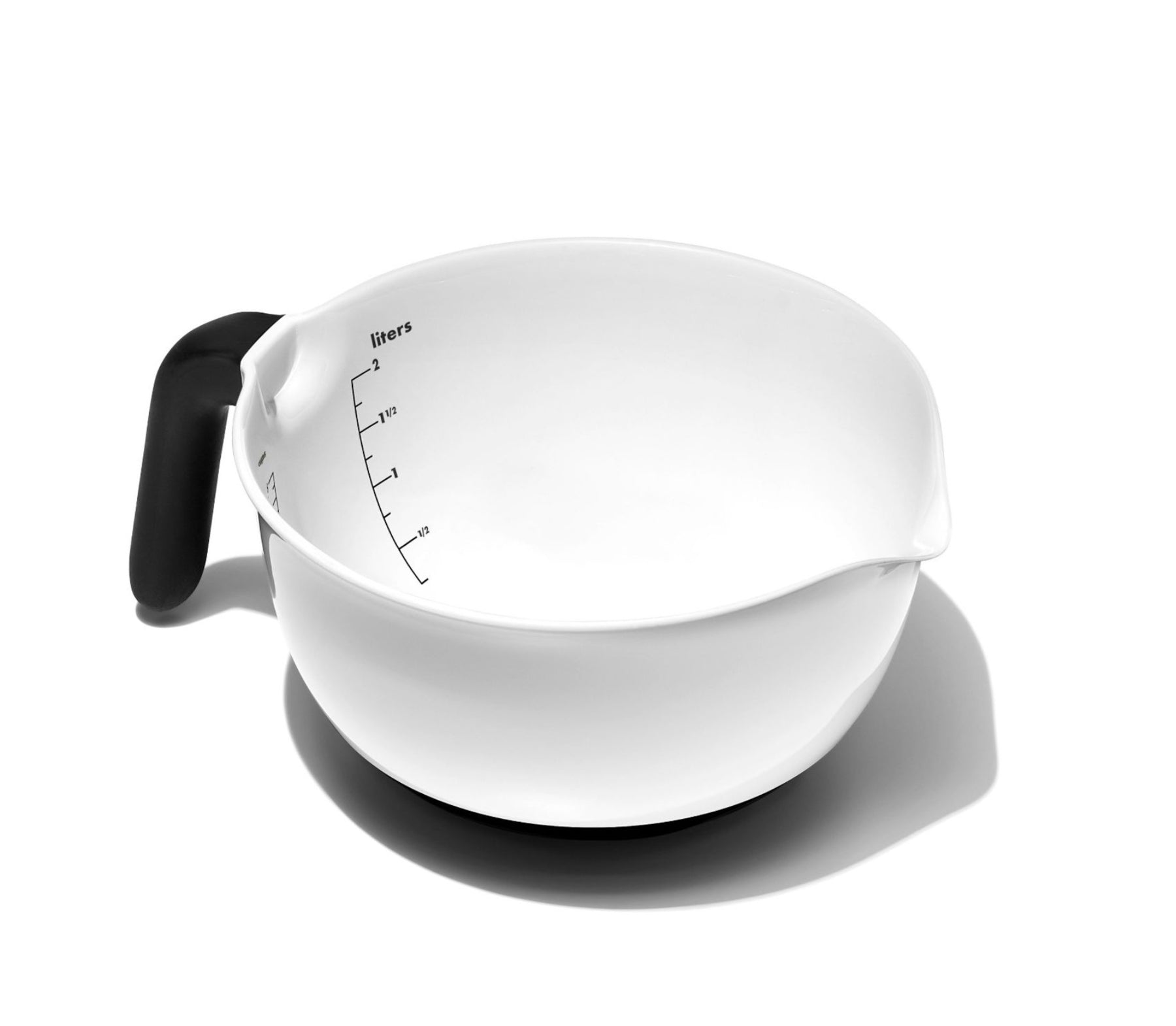 Measure, mix and pour with ease, all with the Batter Bowl. High walls prevent splatter, even when using an electric mixer, and the wide lip and spout allow for drip-free pouring. Bright red, permanent measurement markings are easy to read. 8-cup (2-quart) capacity.