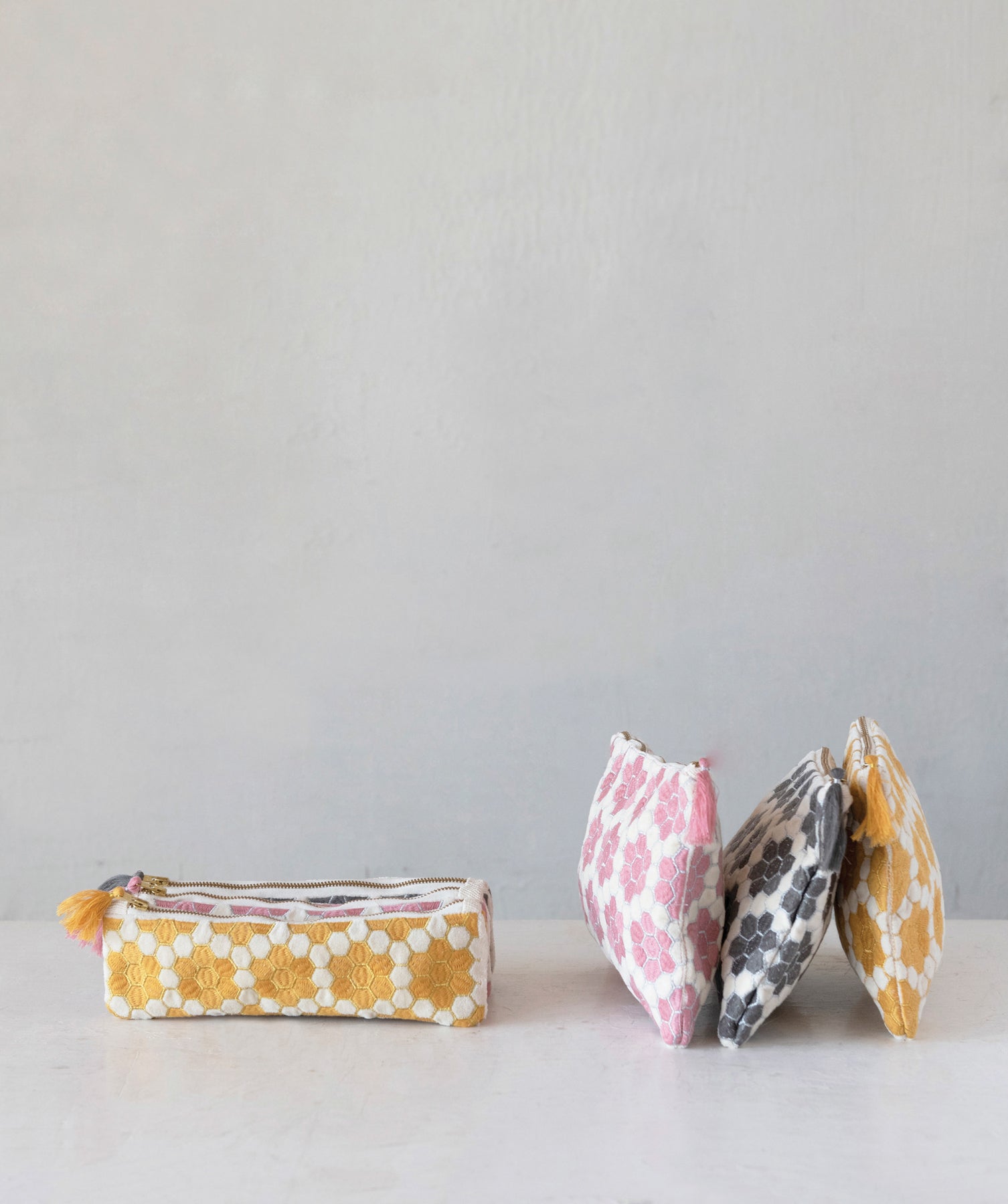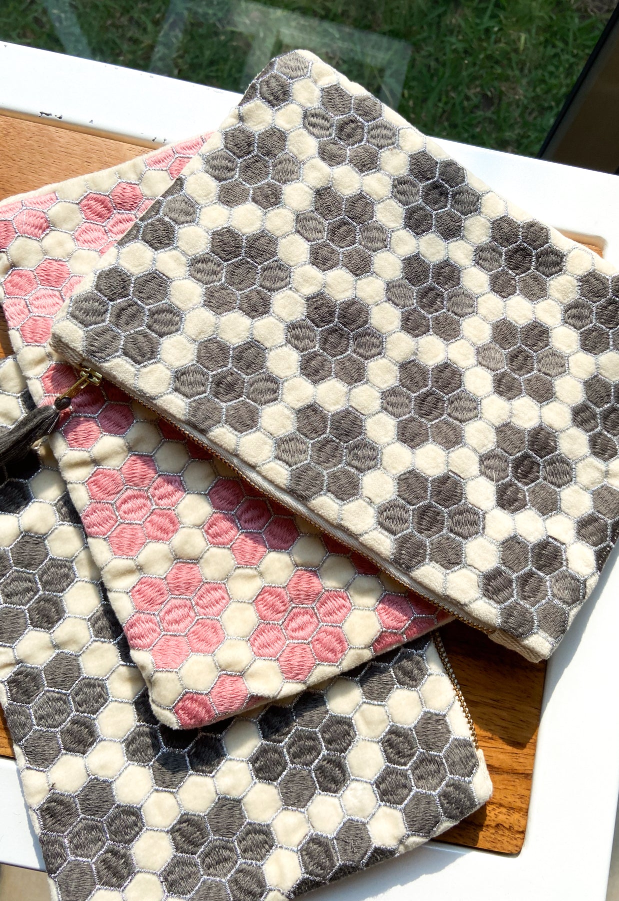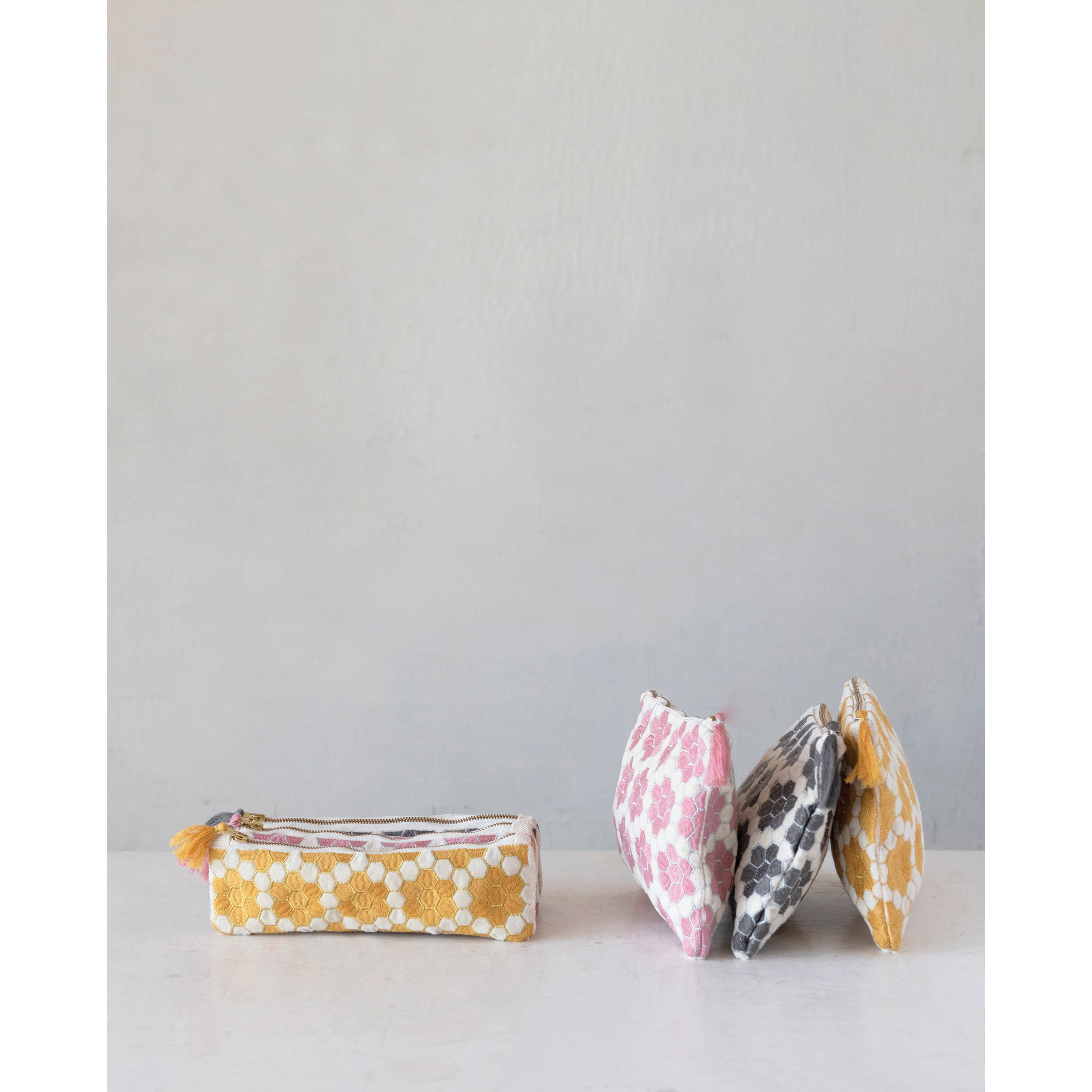 Flat Beehive design bags available in three colours! Golden Yellow, Pink and Gray!