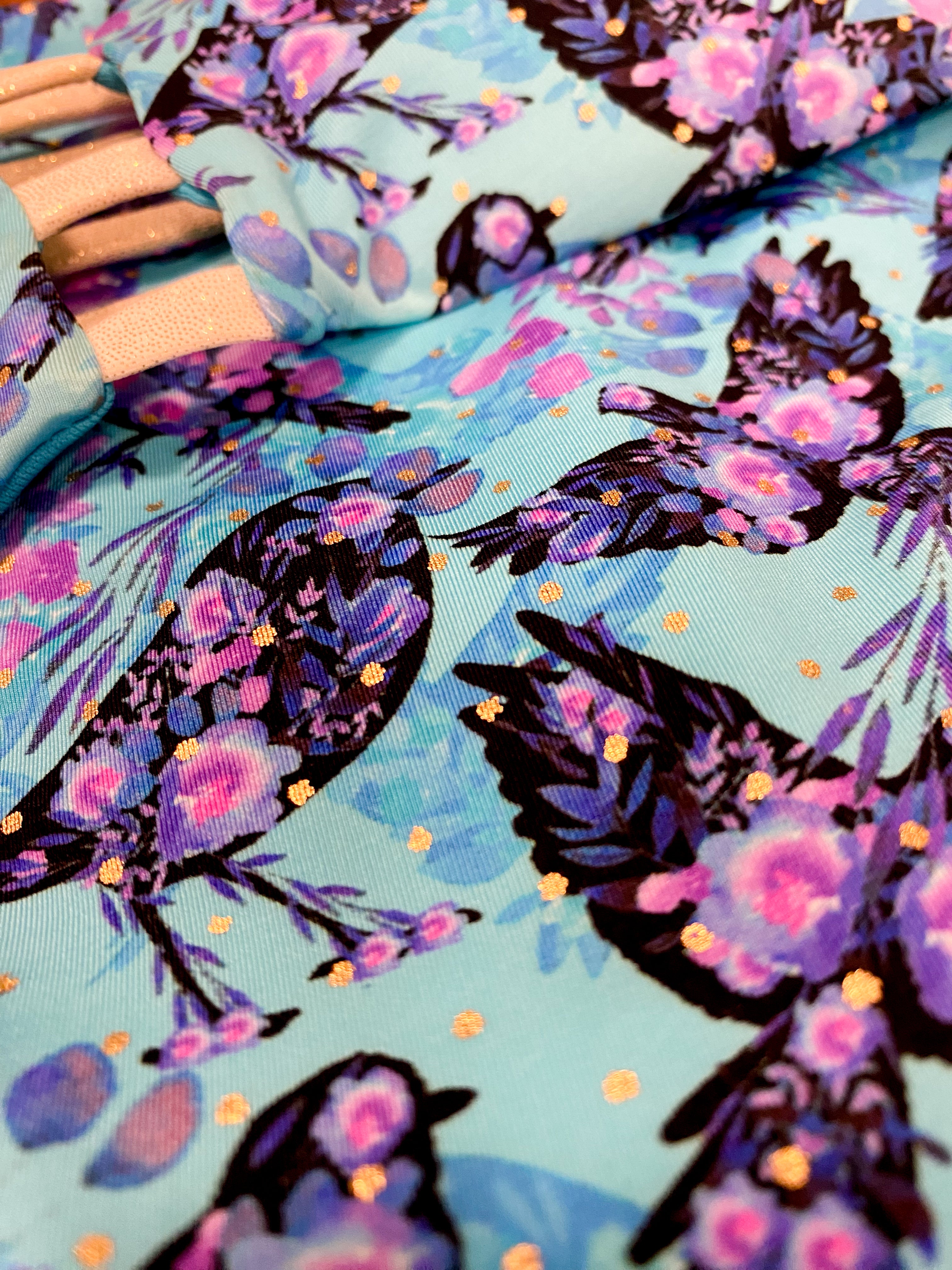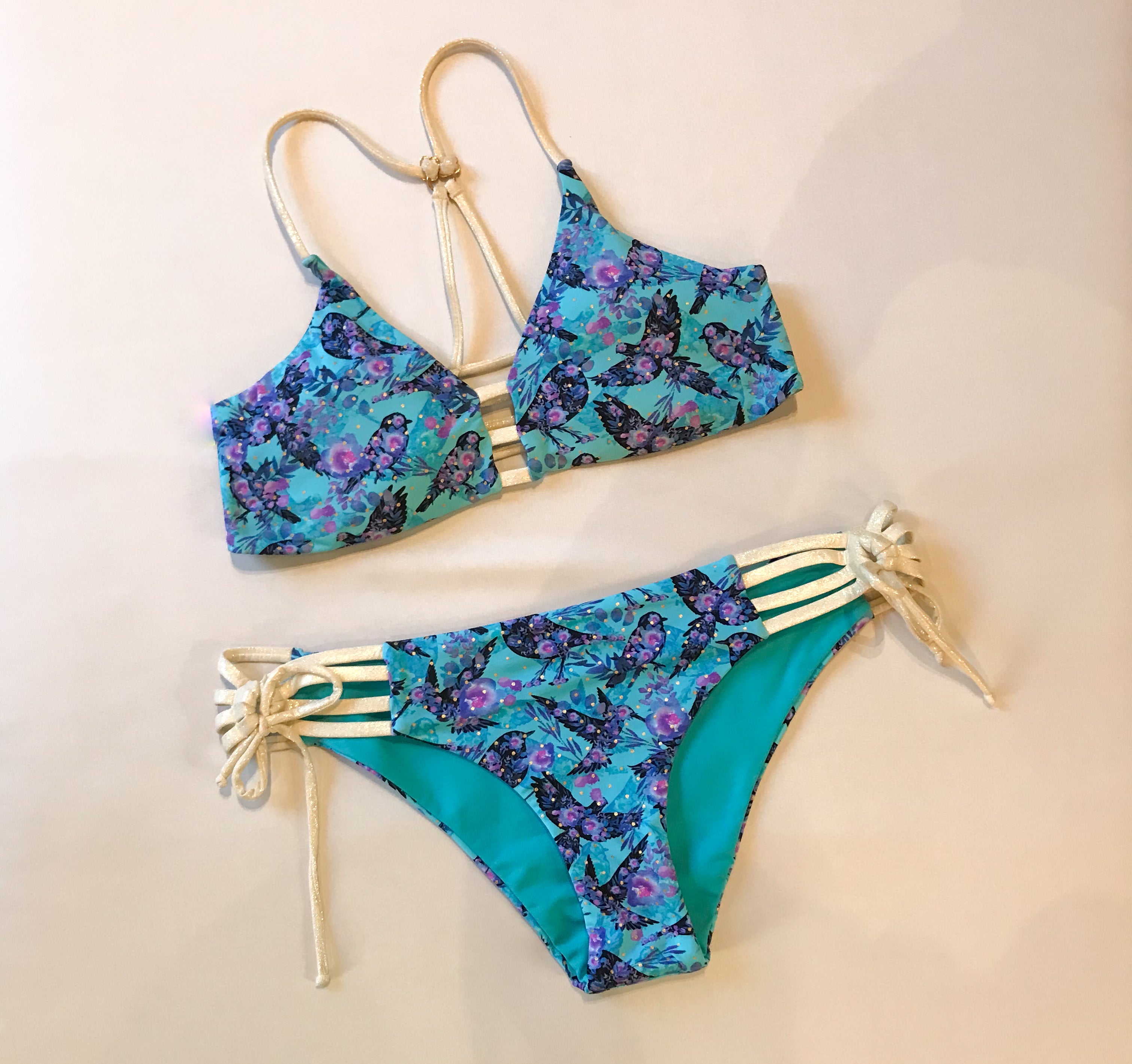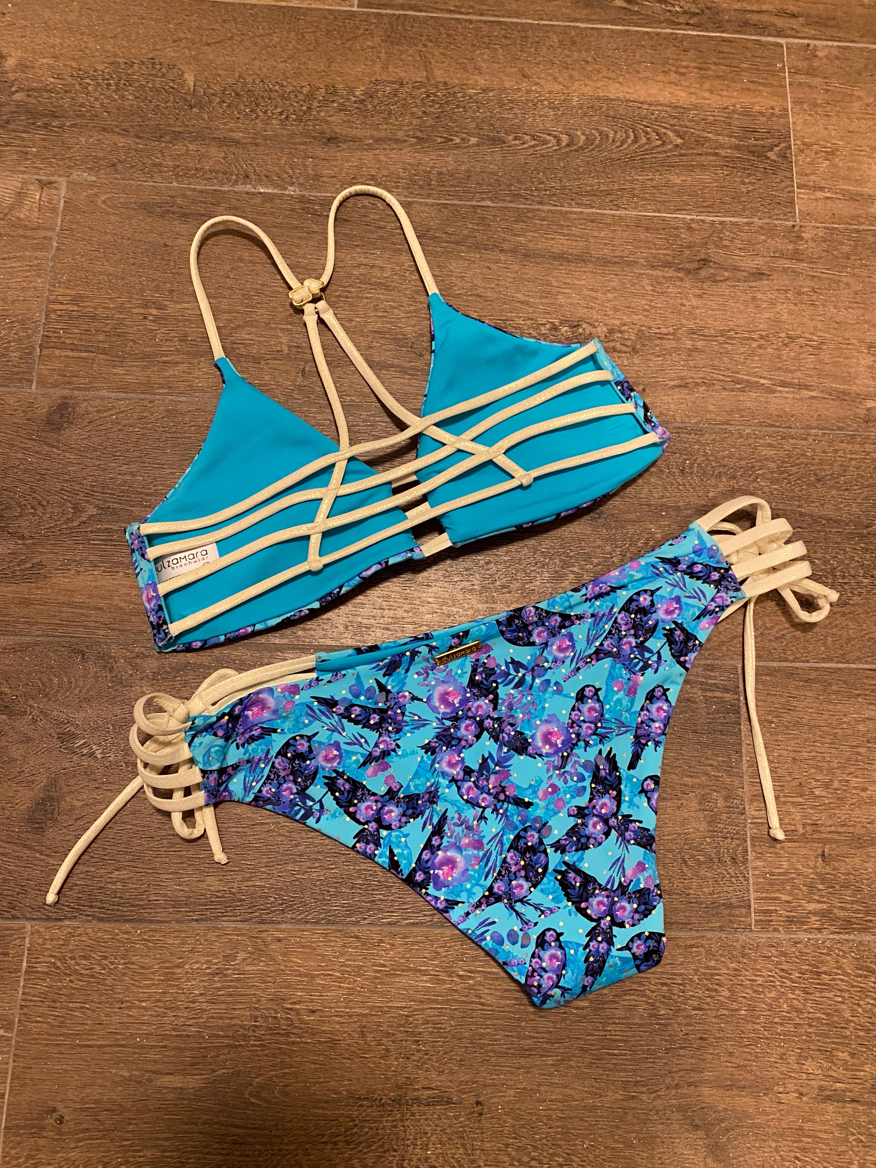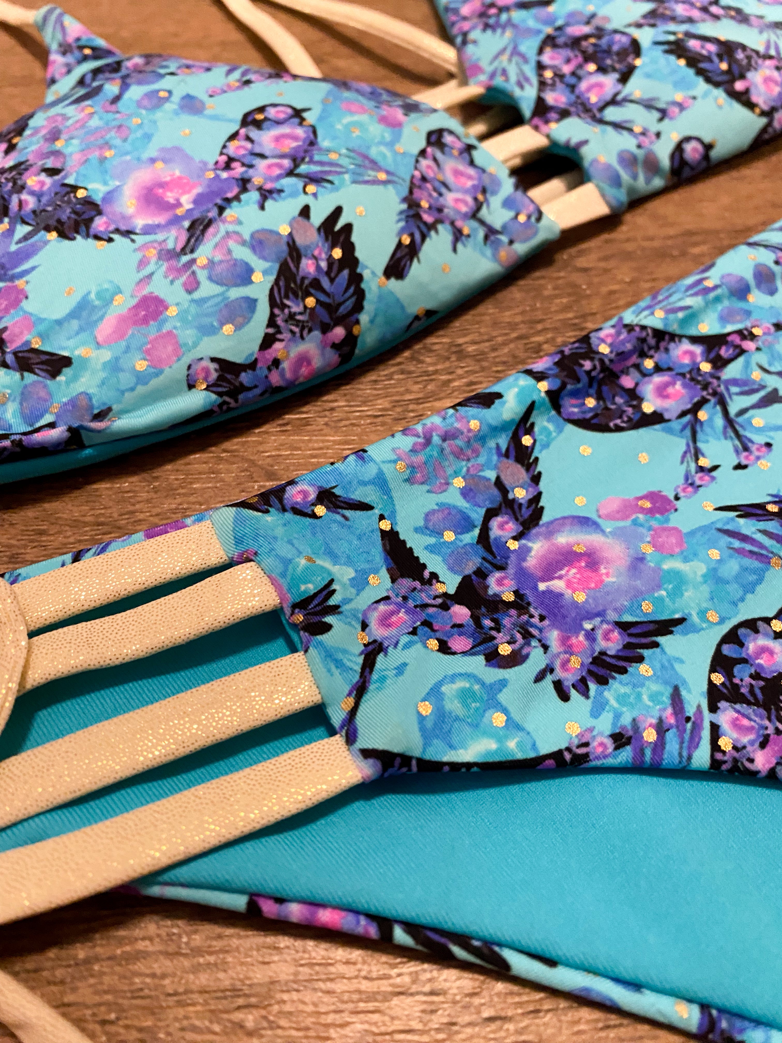 Swimwear set - Incluye bottom y top. Tela con estampado de aves en colores aqua y morado. Tirantes en color Ivory satinado.