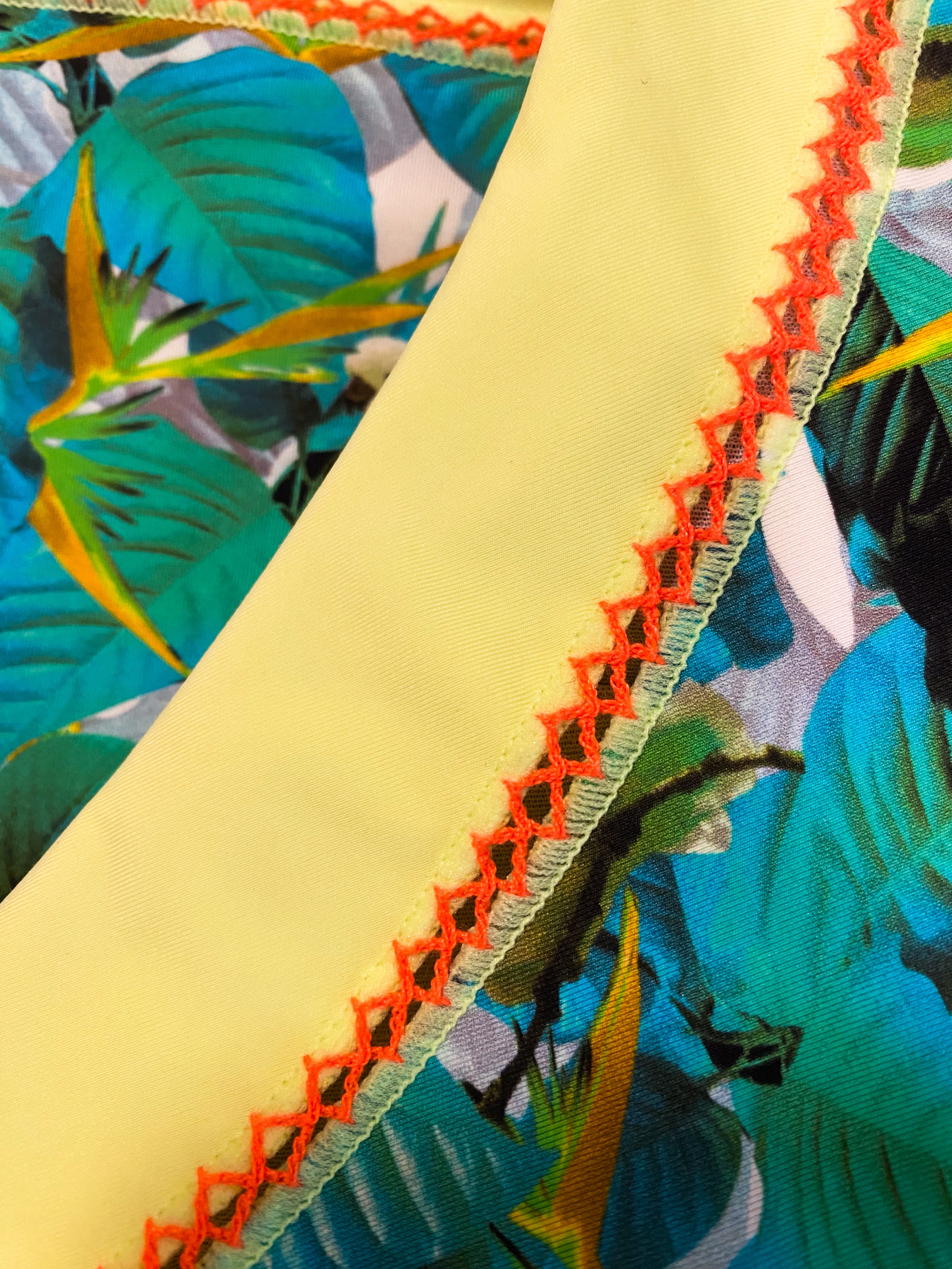 Swimwear set Colombiano - Bottom y top. Tela con estampado tropical, top formato sport, con bordado naranja.