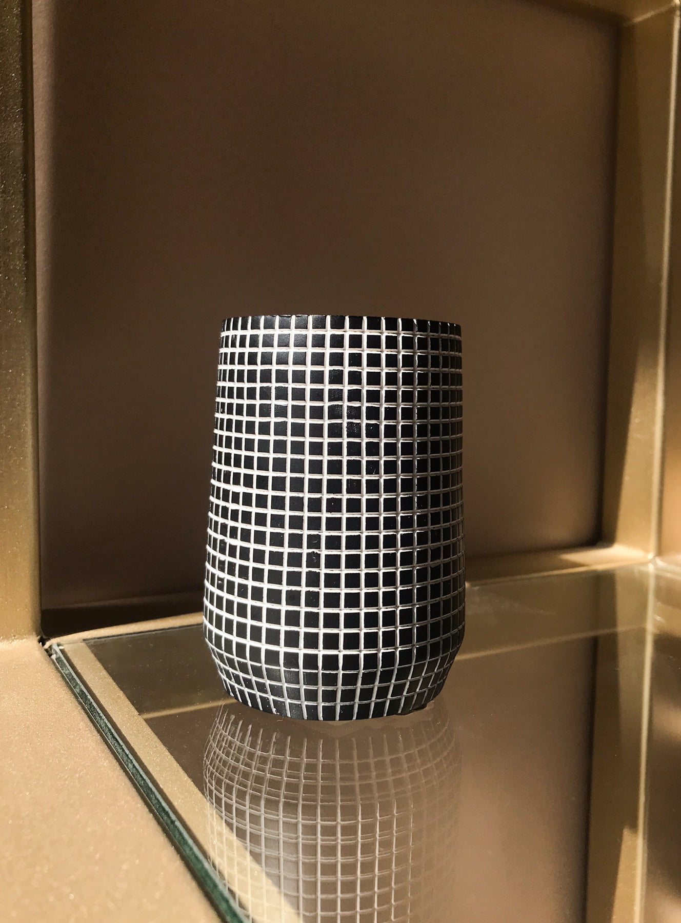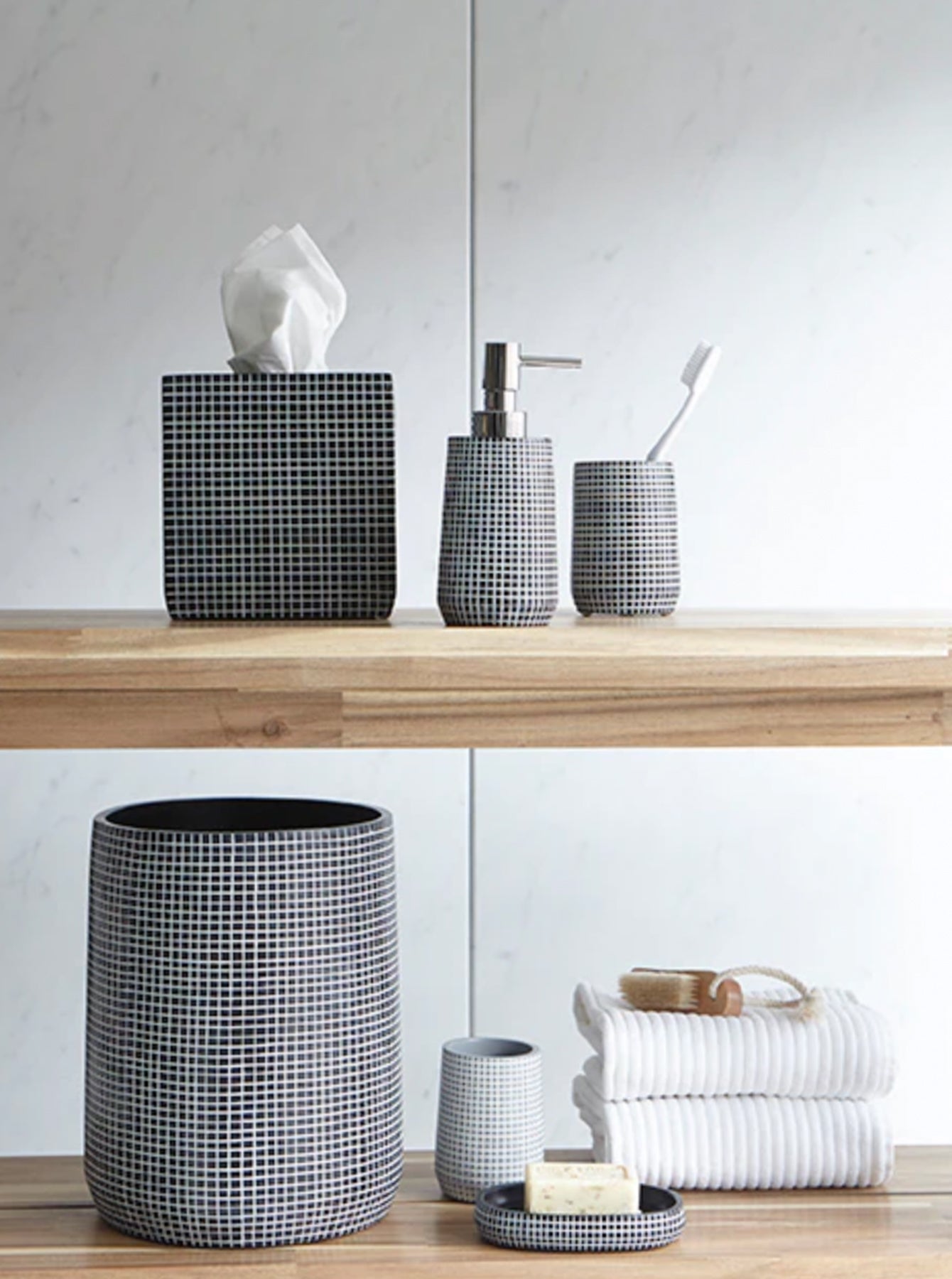 Bath tumbler in an artesanal textured Black and White pattern. Tumbler measures 10.5cm high x 6.5 wide.