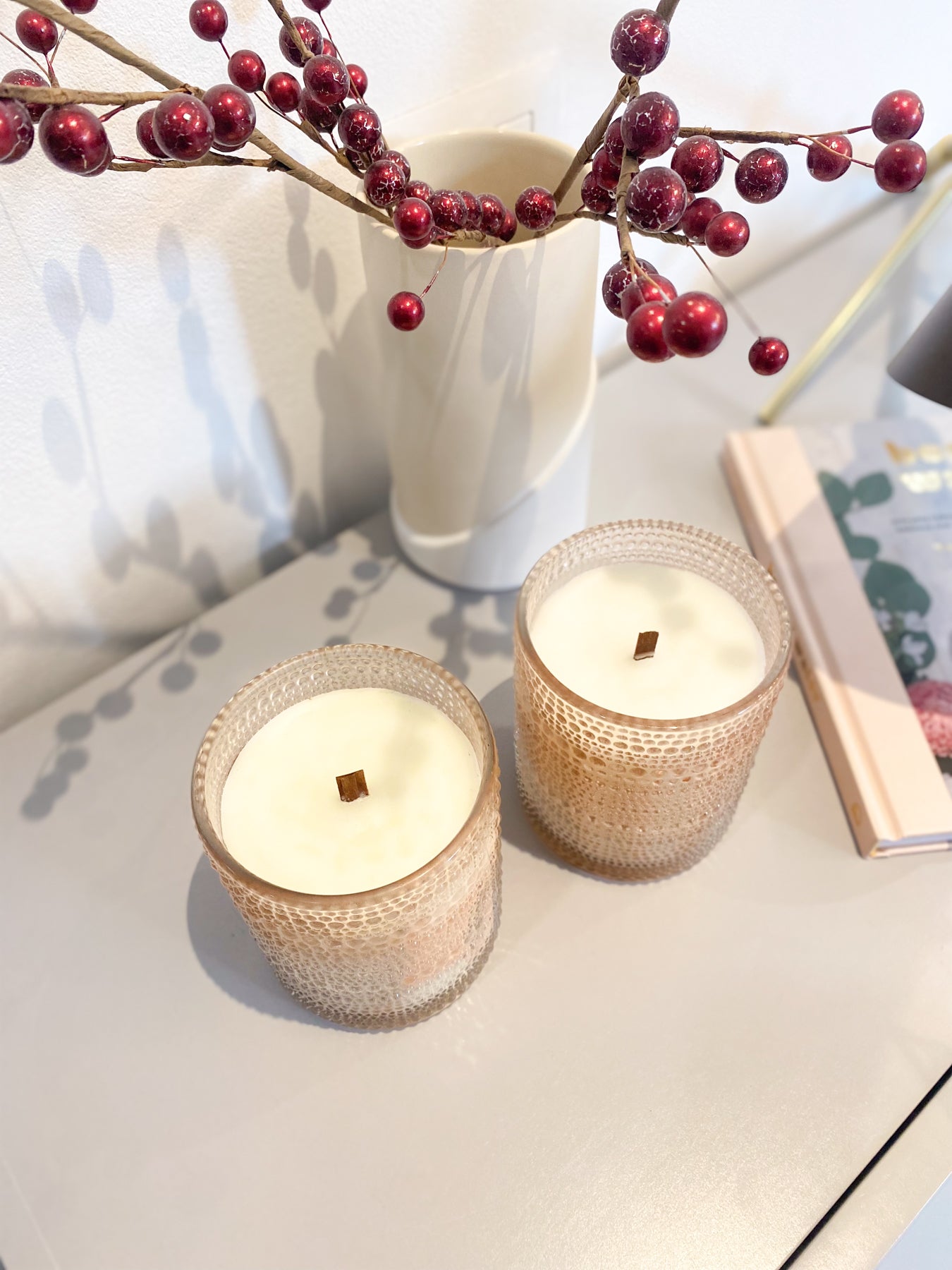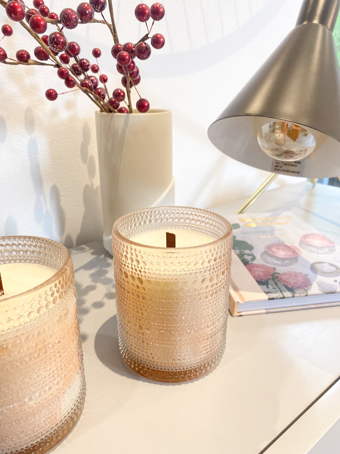 Candela con envase rosado texturizado. Small dotted textured pattern. Glass container.