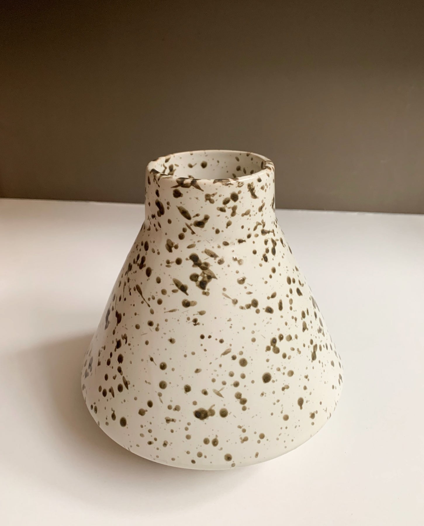 Splattered Olive Green Paint over Ceramic Vase. Dimension: 17cm h x 17cm w