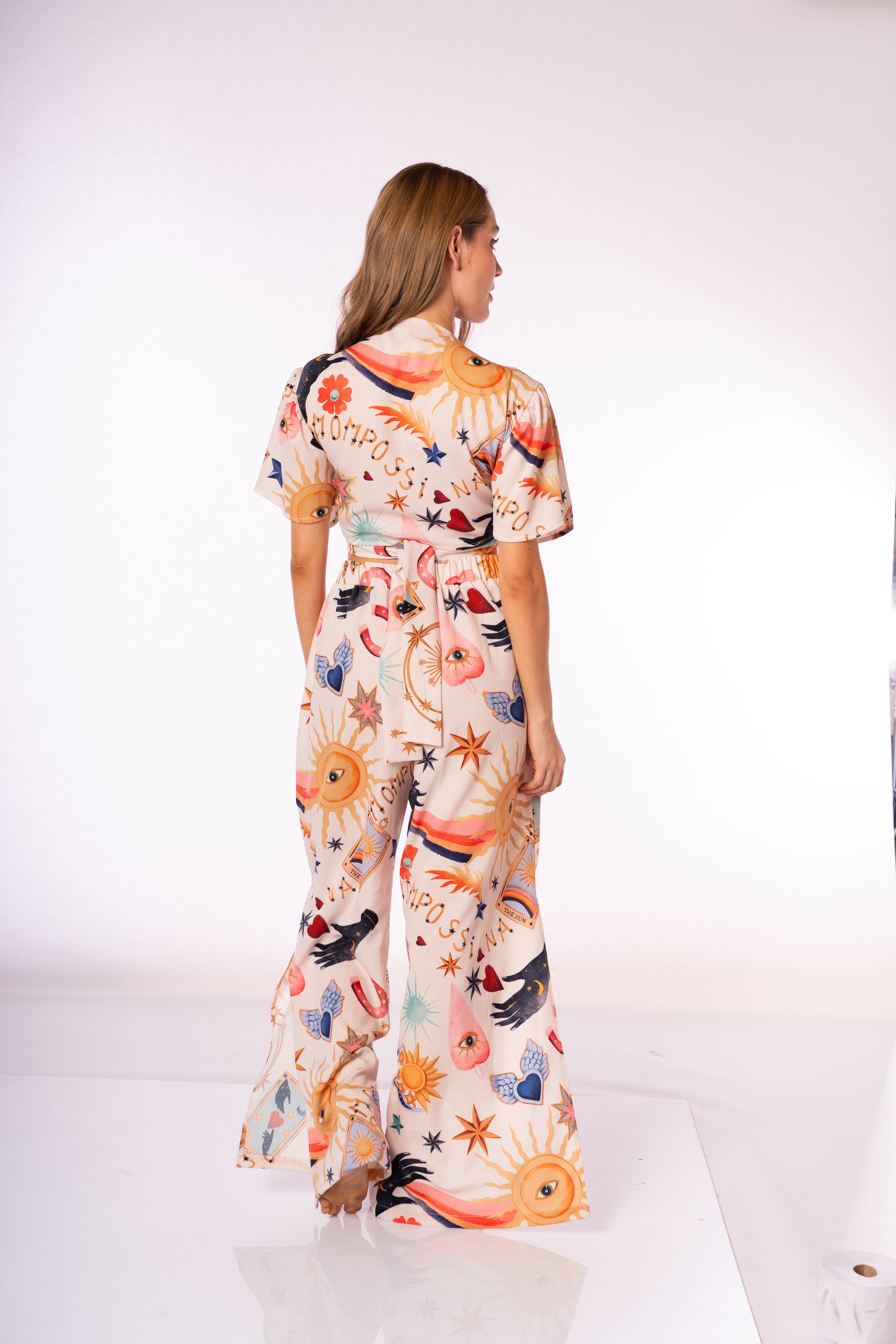 Crop top con tiras cortas alrededor de la cintura. Manga corta. Silueta amplia. Estampado exclusivo Mompossina