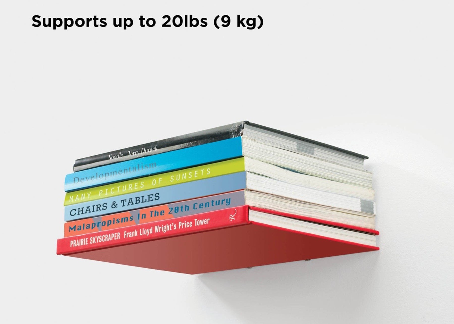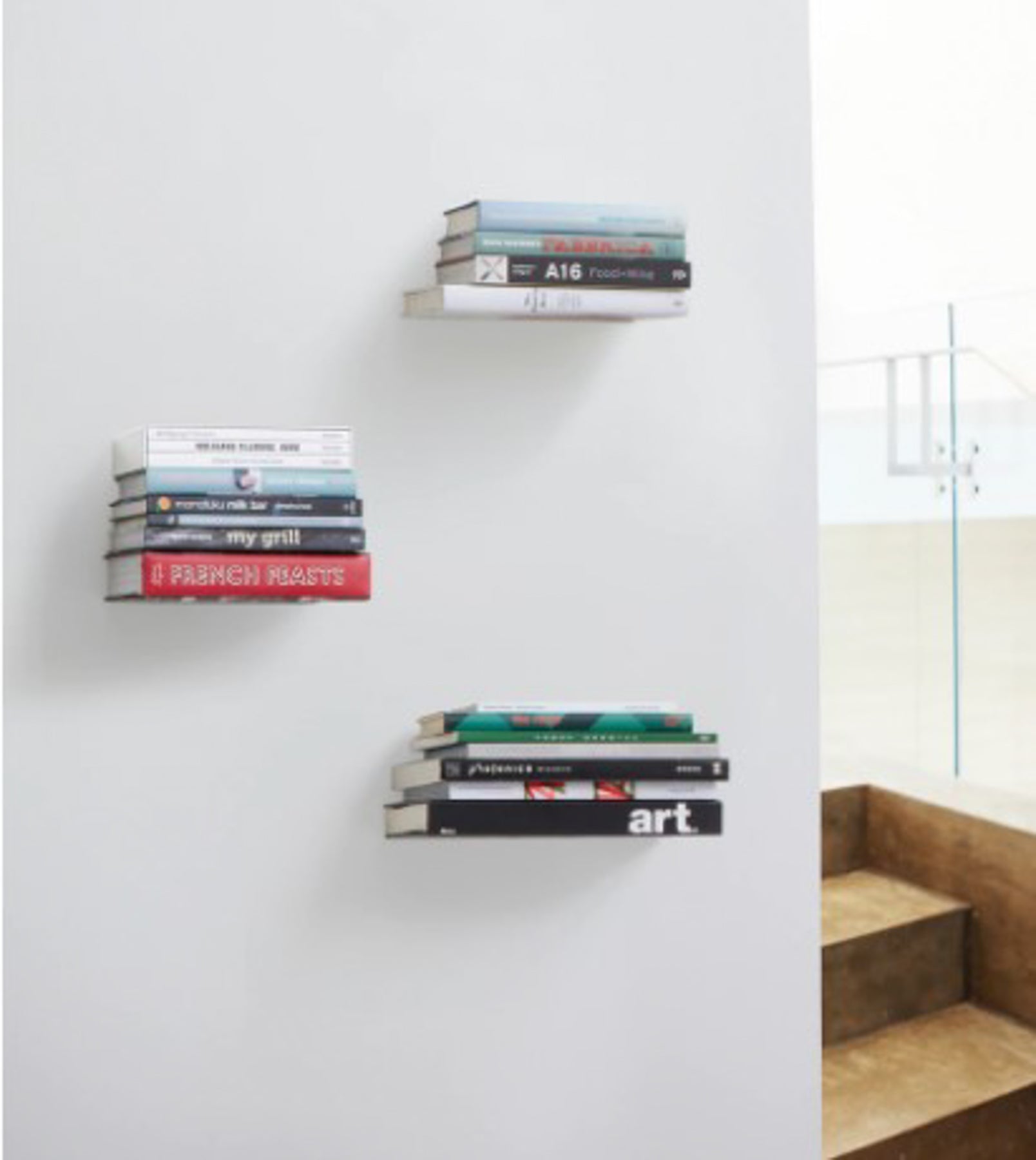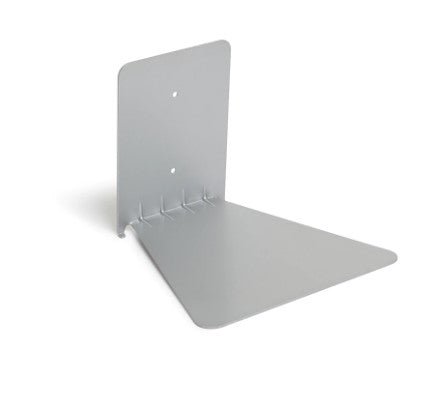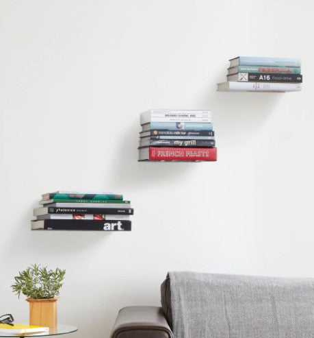 The Conceal wall shelf is a floating bookcase that become invisible once stacked with books. Attach it to your wall (using the included mounting hardware) then slide the sturdy metal shelf between the back cover and pages of a book to create a base for additional books to be stacked upon. Once you’ve secured the back cover into the holding lips, place additional books on top until the sturdy metal shelf is hidden from view. Your books will appear to be floating on the wall!