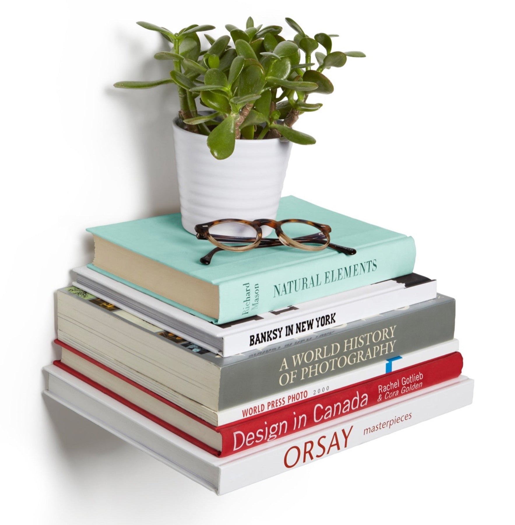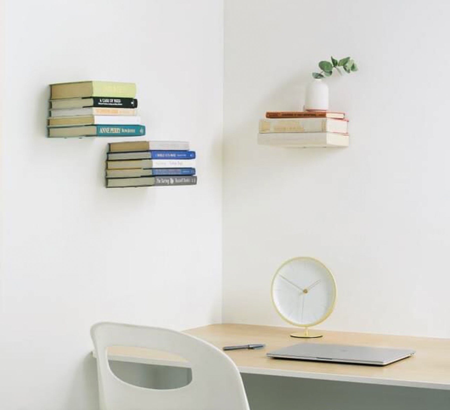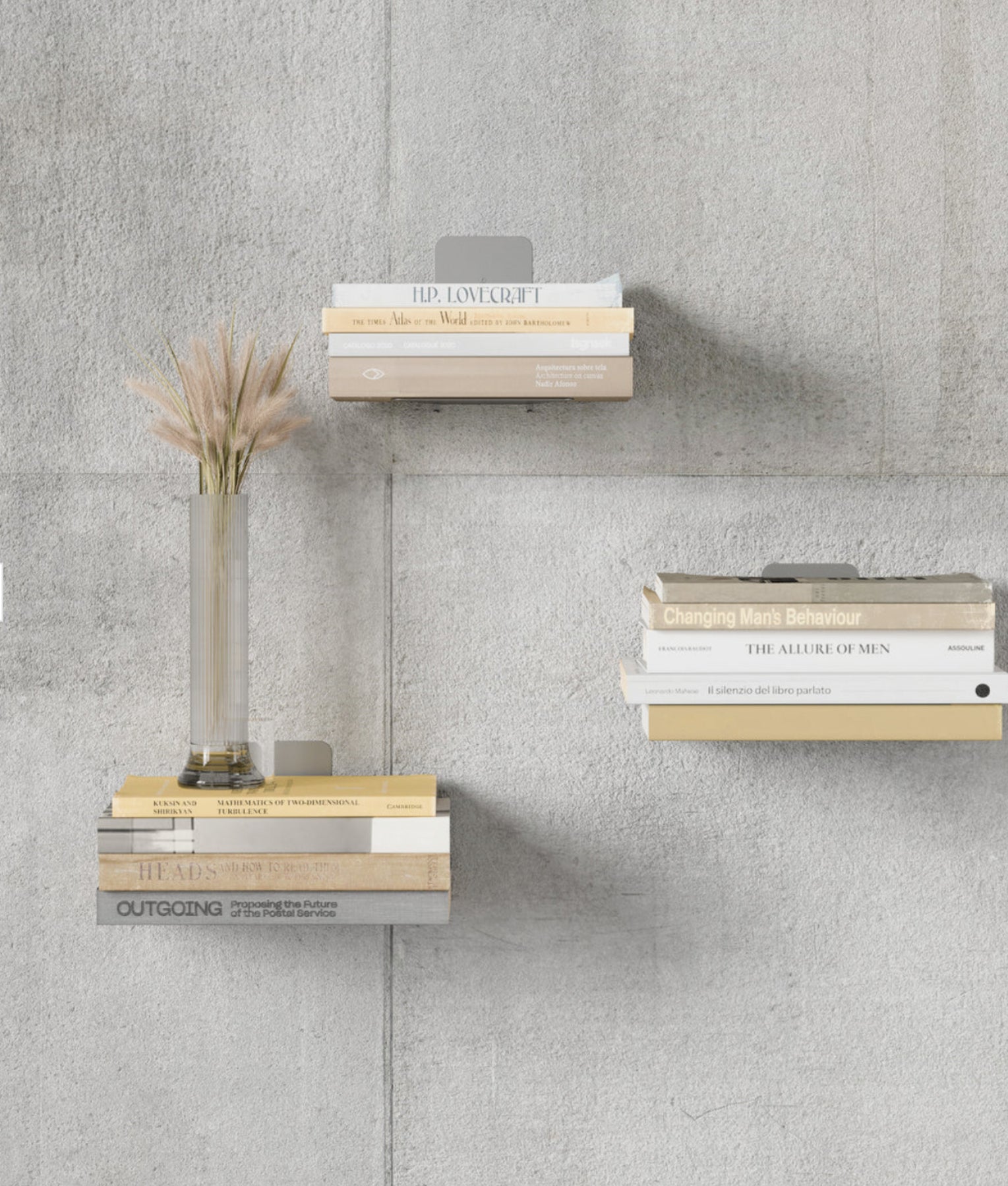 The Conceal wall shelf is a floating bookcase that become invisible once stacked with books. Attach it to your wall (using the included mounting hardware) then slide the sturdy metal shelf between the back cover and pages of a book to create a base for additional books to be stacked upon. Once you’ve secured the back cover into the holding lips, place additional books on top until the sturdy metal shelf is hidden from view. Your books will appear to be floating on the wall!