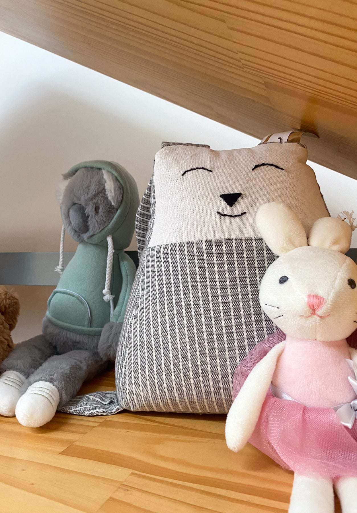 Beautifully crafted doorstopper for your kids room. Place this heavy weight gray and white bunny doorstopper right in front of the doors, so that you can avoid any accidents :) from doors closing up on your little ones!
