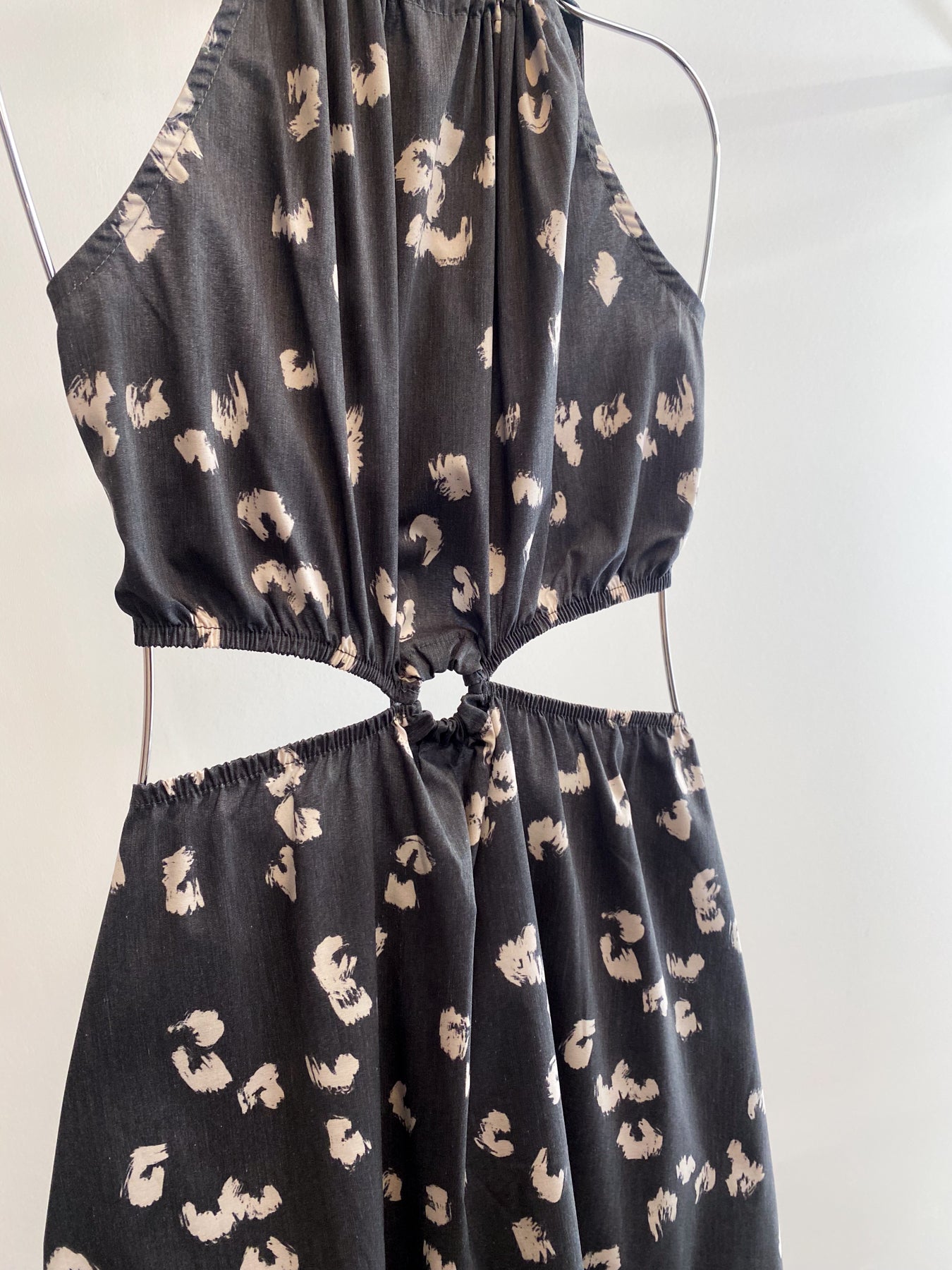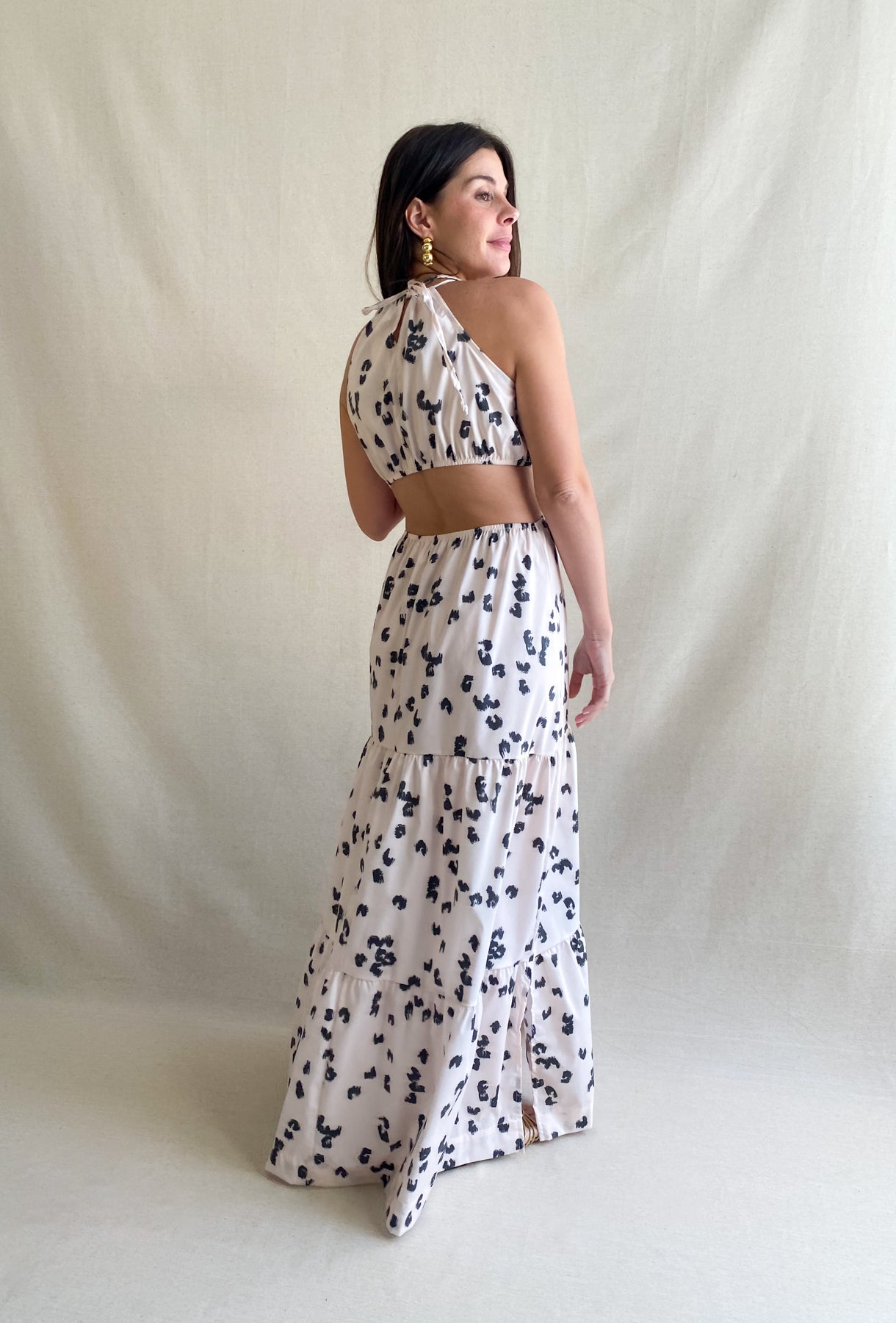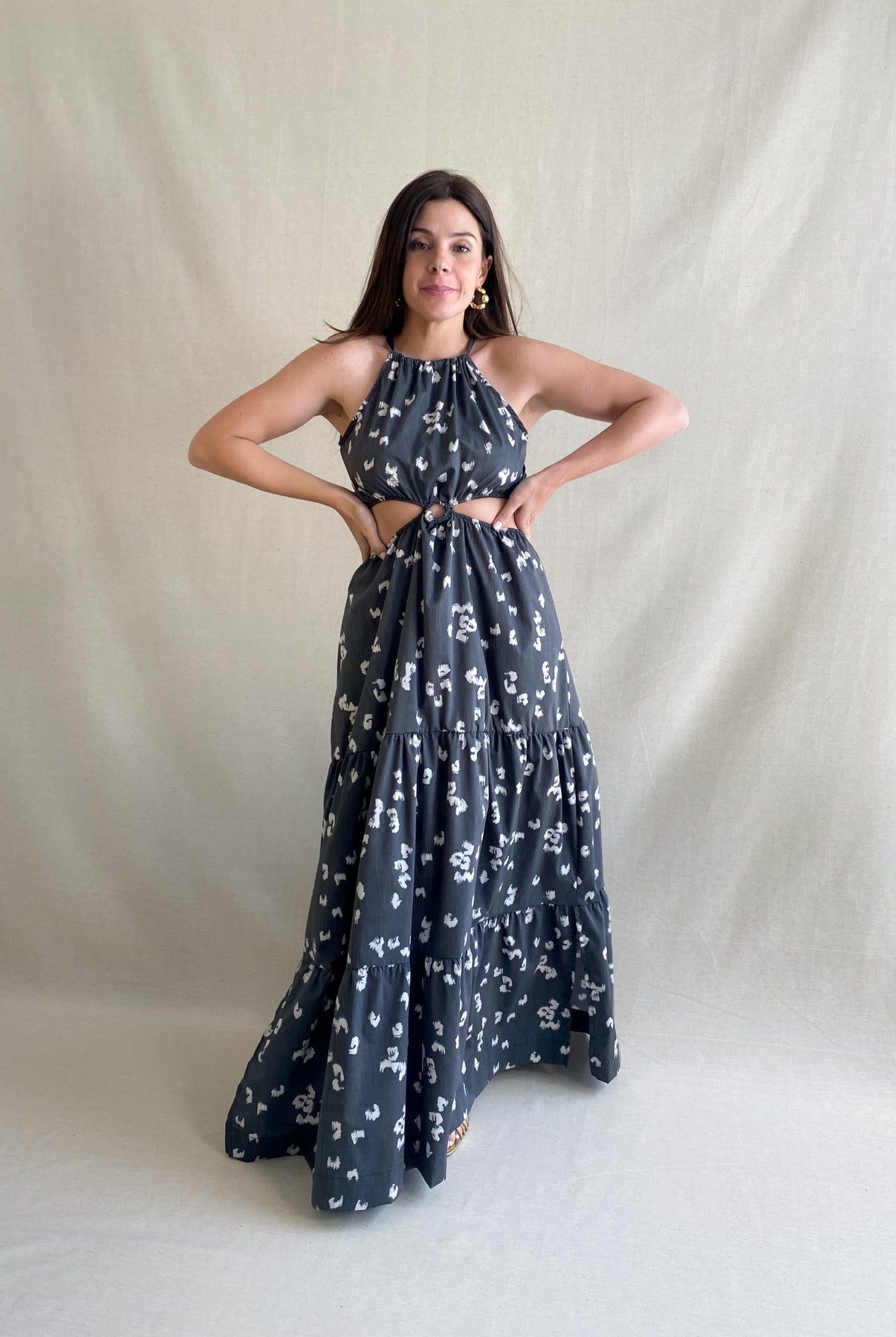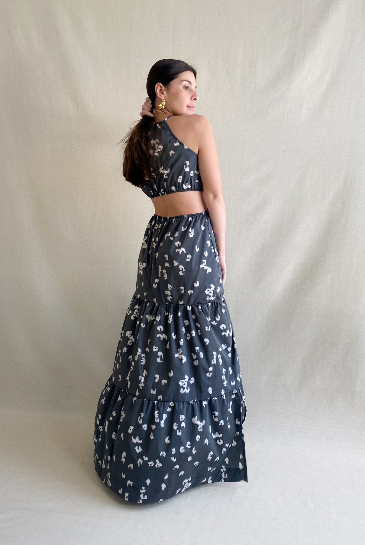 Vestido largo, casual, hecho de algodón. Silueta ceñida en busto, amplia en tronco