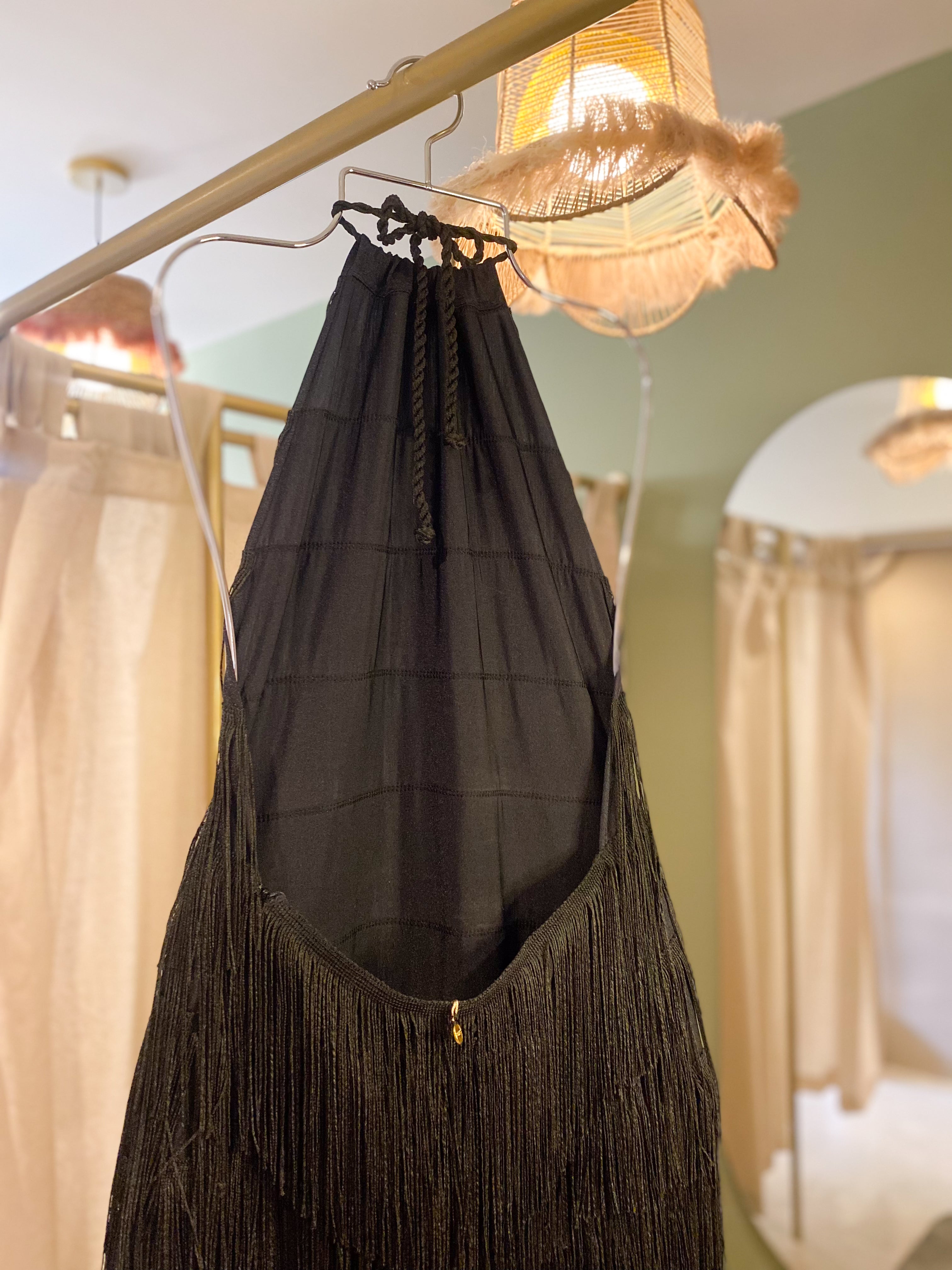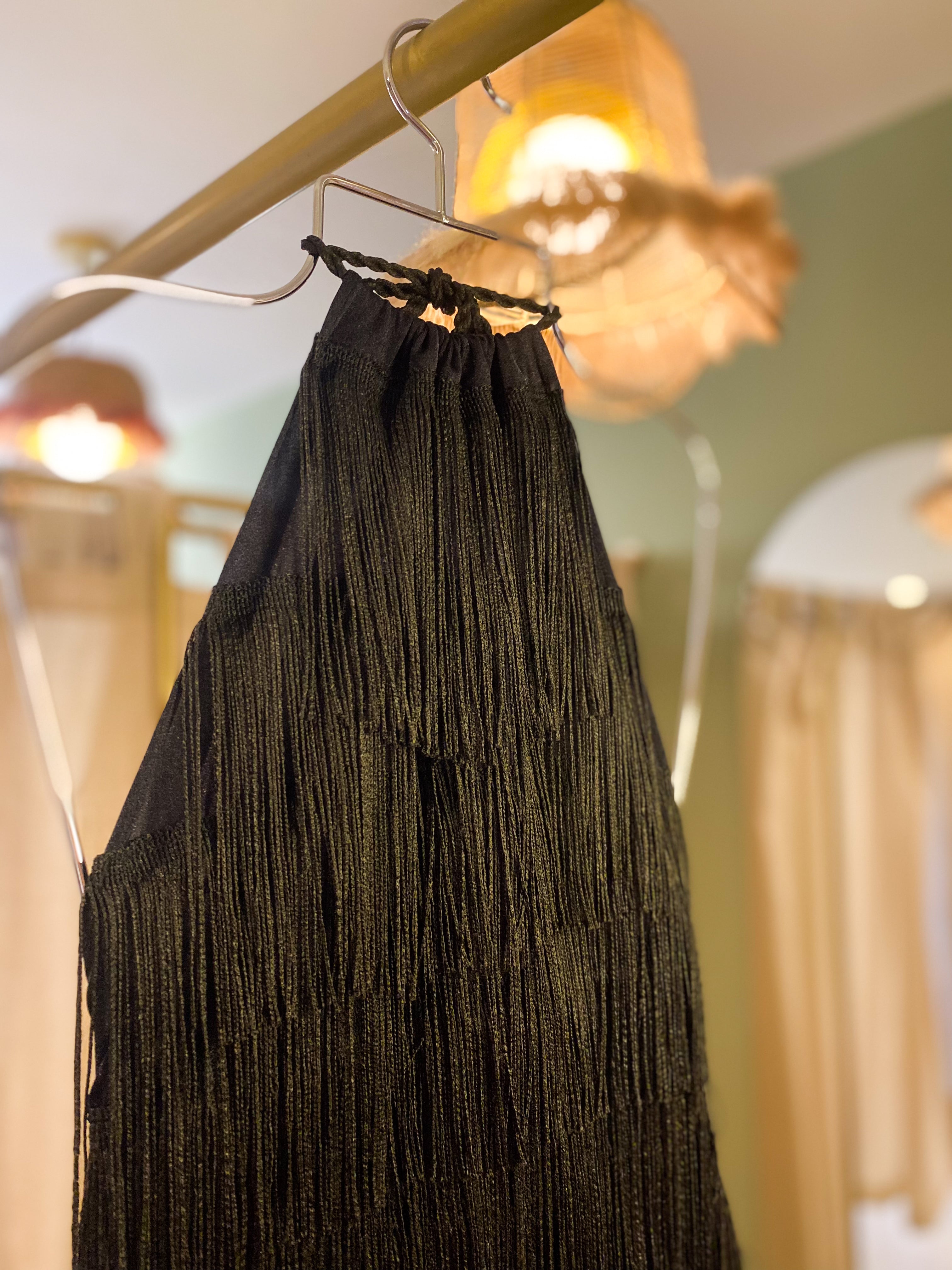Unitalla - Negro. Te presentamos un vestido largo con una silueta semi-ajustada que combina comodidad y estilo. Su corte recto superior es halagador para todo tipo de figuras ya que no descubre bustos, disponiendo de una apariencia más estilizada junto con nuestros trenzados hechos de manera artesanal. Este vestido está confeccionado con un tejido suave al tacto y propiedades de elongación. Además, está complementado con hilos que aportan un toque luminoso y deslumbrante. Una elección perfecta para diversas ocasiones especiales y para acaparar todas las miradas.