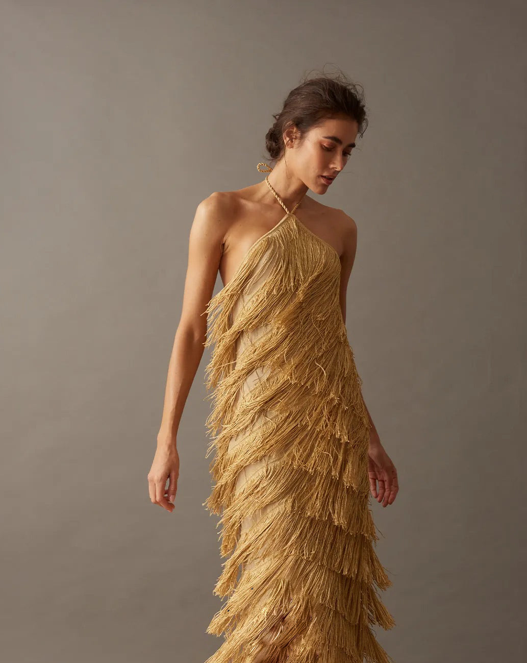 Vestido largo semi-ajustado, con un elegante cuello halter sostenido con una de nuestras técnicas de hilado, en la parte posterior posee un escote recto llevándote a una elegancia veraz. La tela de nuestro vestido está compuesta de lycra interior, lo que permite un tacto cómodo y suave, además de que posee un look de elongación por su formato único!