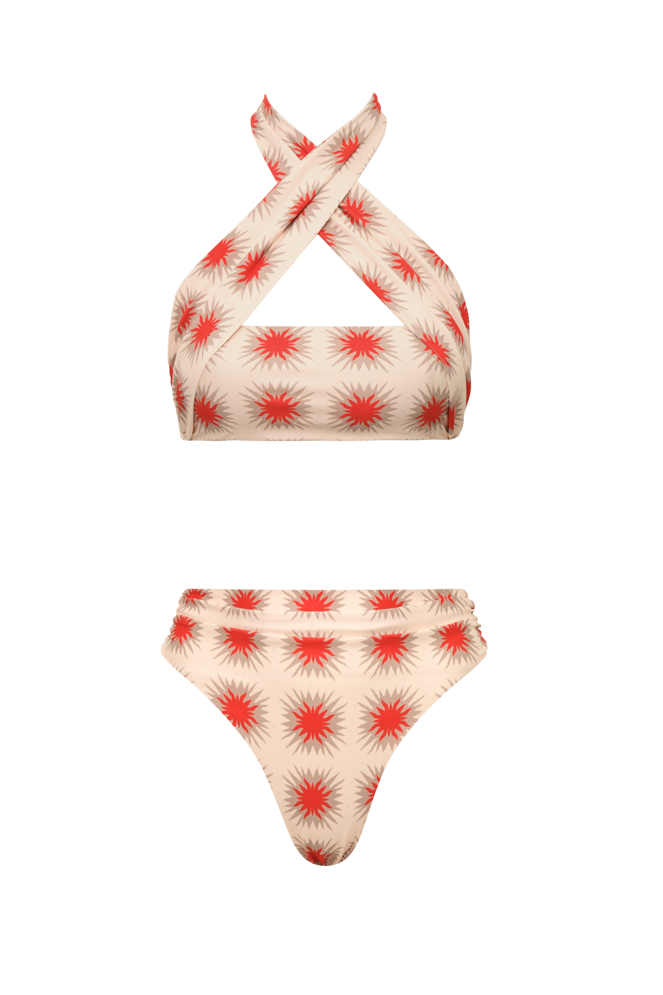 High-Waisted Bikini Bottom with ruched waist details that create a flattering silhouette, offering more coverage around the abdomen and enhancing the figure.