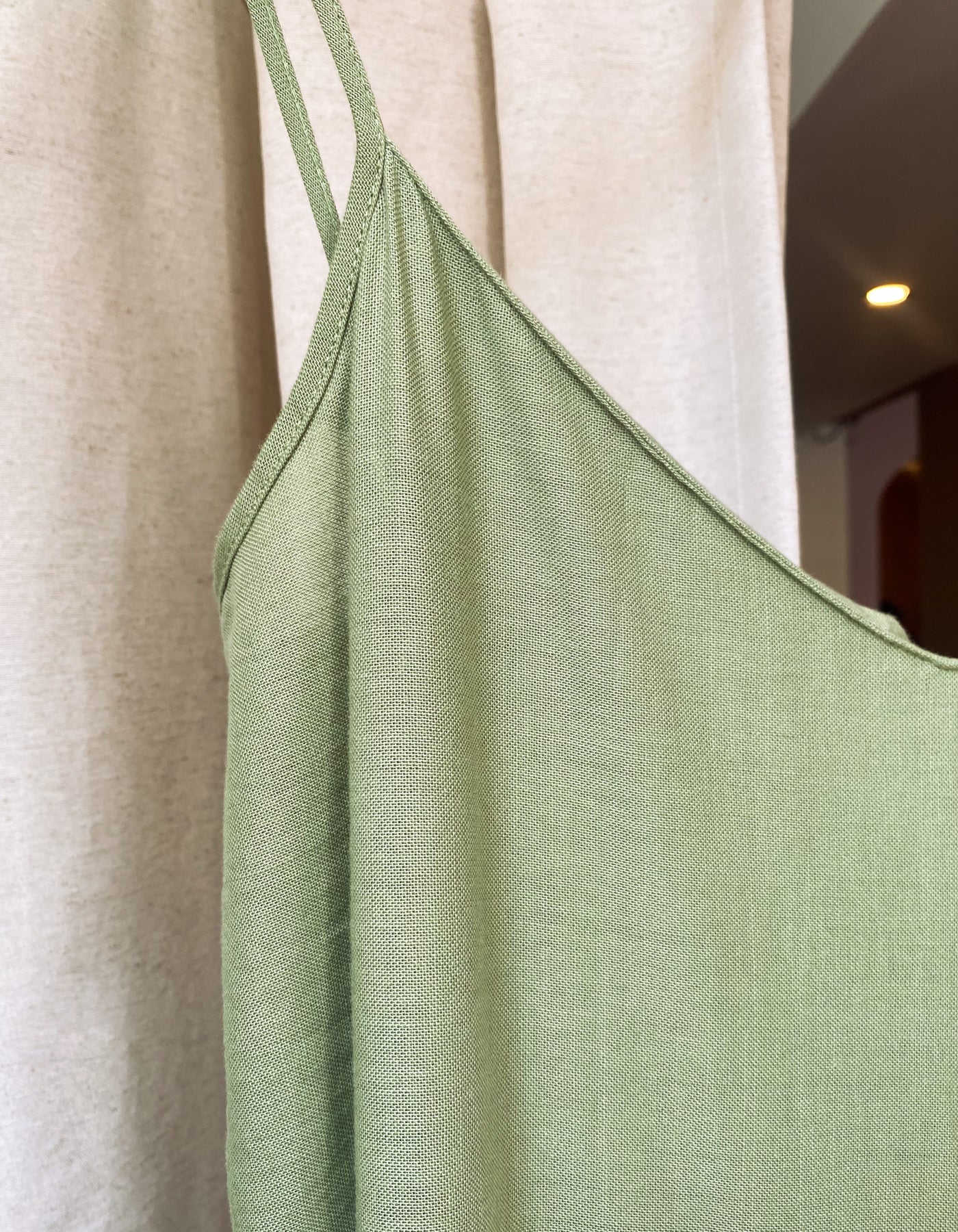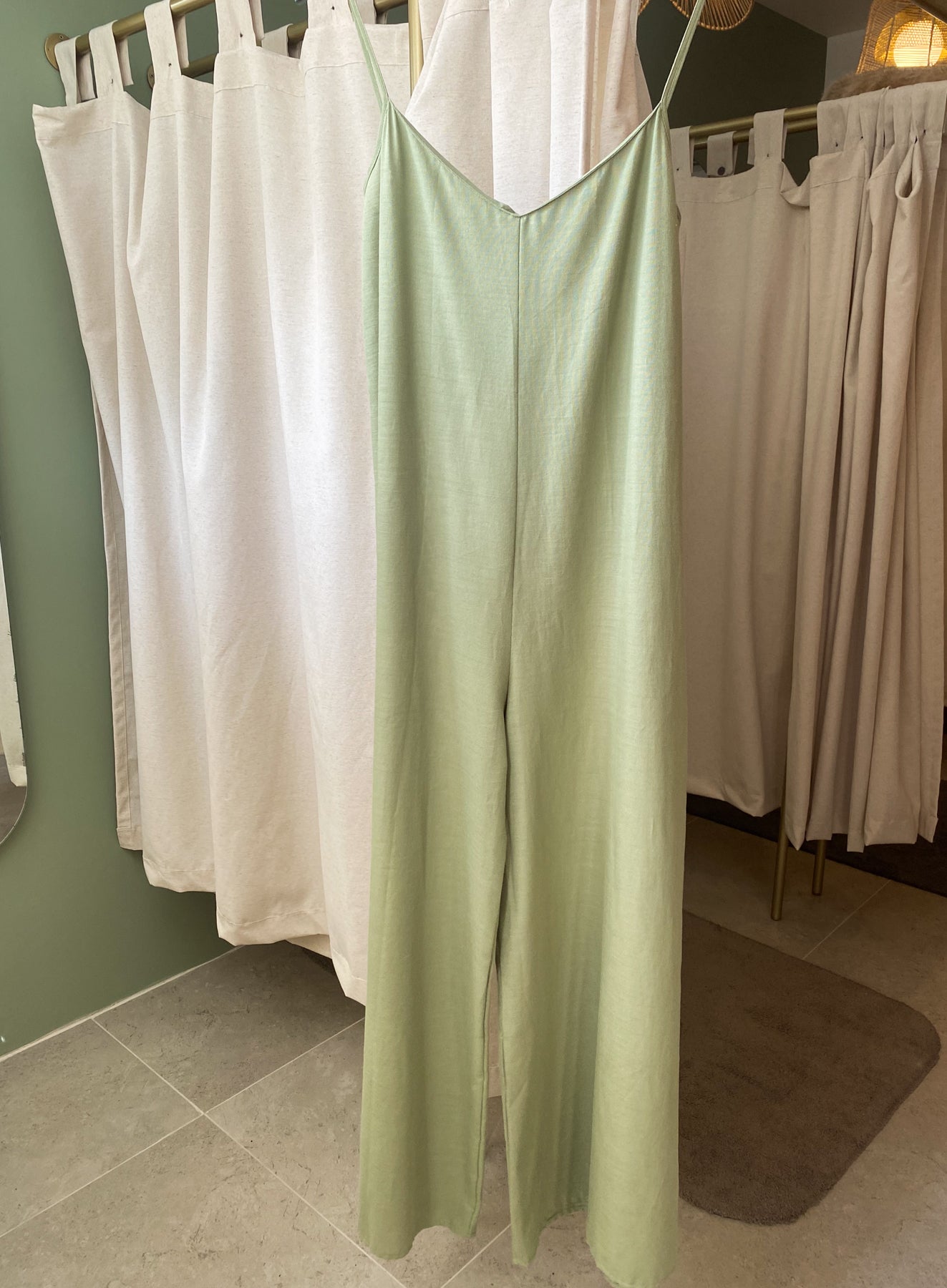Un jumpsuit clasico. Lino verde en estilo oversize para que te veas fresca y comoda!