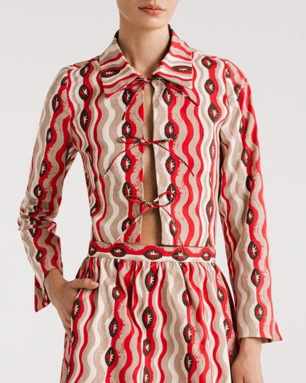 Crop Long Sleeve Shirt, fitted at the waist, featuring a classic collar with lapels and a front closure with bow details.