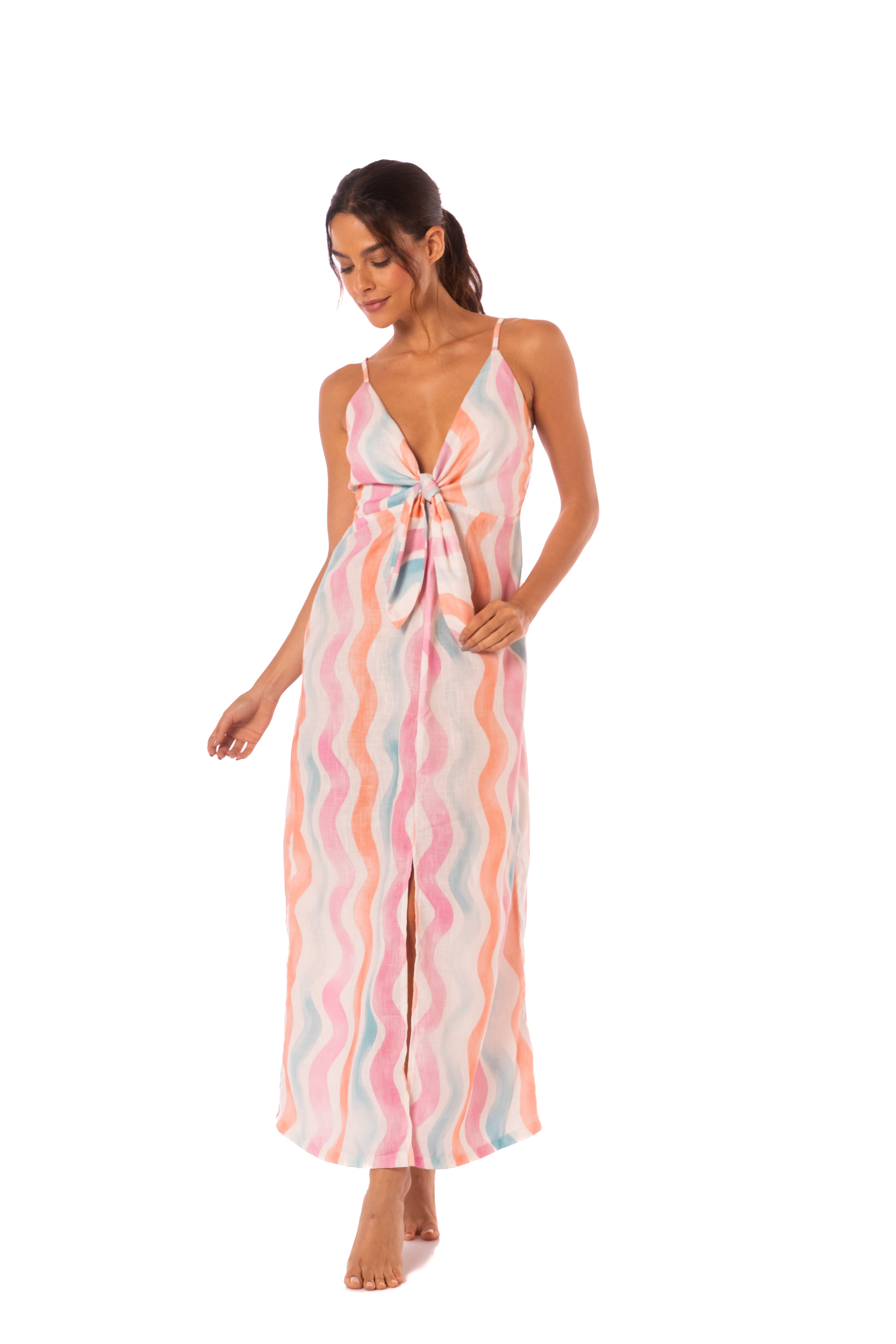 Long dress, adjustable straps, knotted in the front, exclusive print.