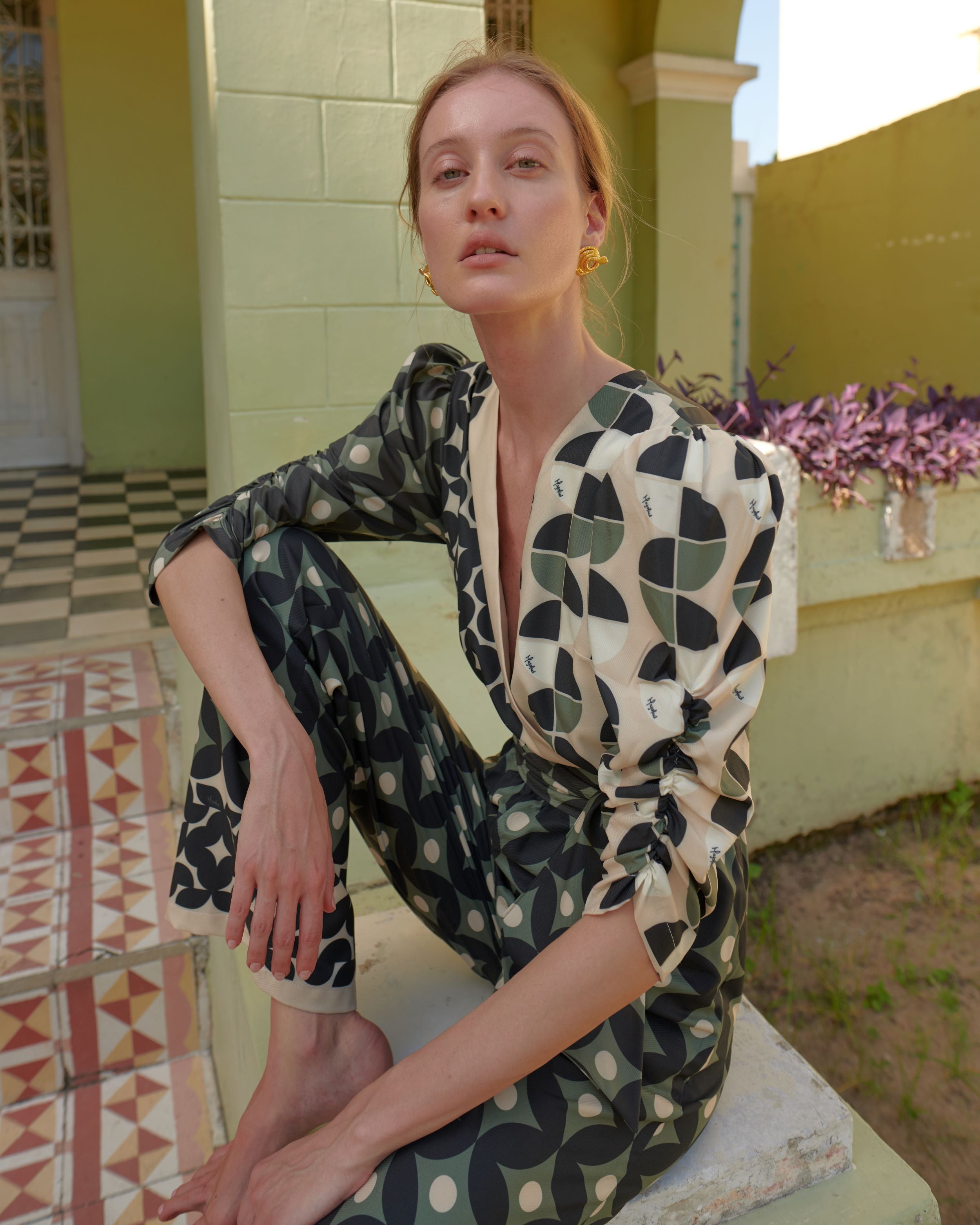 FLOWY JUMPSUIT CINCHED AT THE WAIST. CROSSED NECKLINE, LONG SLEEVES. THE PERFECT OUTFIT FOR A NIGHT OUR, OR FOR A CLASSY AND FASHION FORWARD WORK OUTFIT.