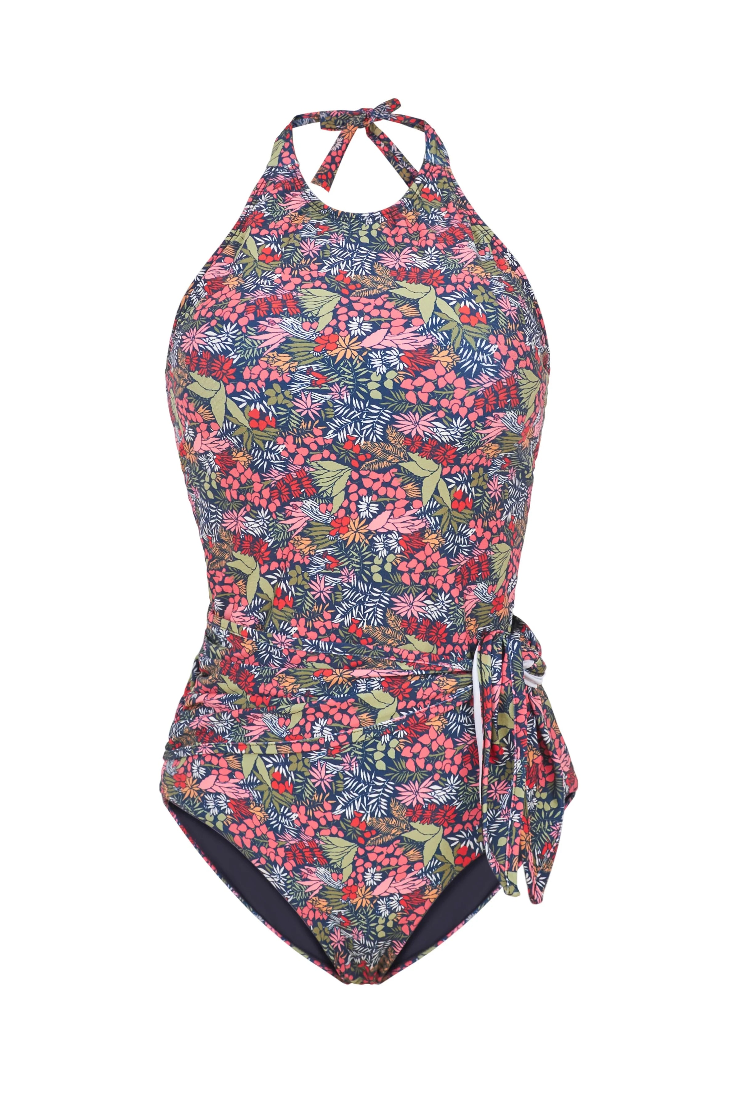 Designed with just the right amount of coverage and contouring, this high-neck suit draws the eye and cinches the waist with a side-sweeping knot tie.