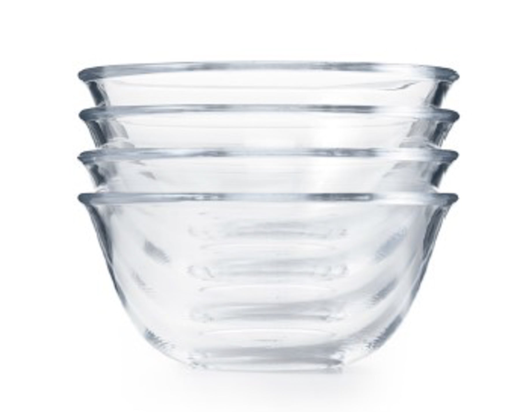 OXO Good Grips Glass Bowls are made of oven-, freezer- and microwave-safe borosilicate. That means they can be heated from 32 F (0 C) to 450 F (232 C) without shattering. Generous rims allow for easy handling when mixing, pouring and cleaning, plus the glass won’t absorb odors or stains. Ready to wrap up? Our Bowls nest for simple storage. Each 4 Piece set contains 4 (four) 10 Ounce Glass Prep Bowls Borosilicate GlassOXO’s Glass Bowls can withstand a temperature change from 32 F (0 C) to 450 F (232 C) without shattering. They’re also stain and odor resistant. Above the CurveWide, curved rims provide easy handling while mixing, pouring and cleaning. Easy on the EyesOXO’s elegant design offers kitchen-to-table appeal. Versatile VesselsEach Bowl is oven, freezer and microwave safe. Space SaverWhen you’re finished, OXO Good Grips Glass Bowls nest for safe storage. Good TipKeep hot Bowls off cold or wet surfaces. We recommend placing hot items on a trivet, dry potholder or dishcloth until they've cooled down.