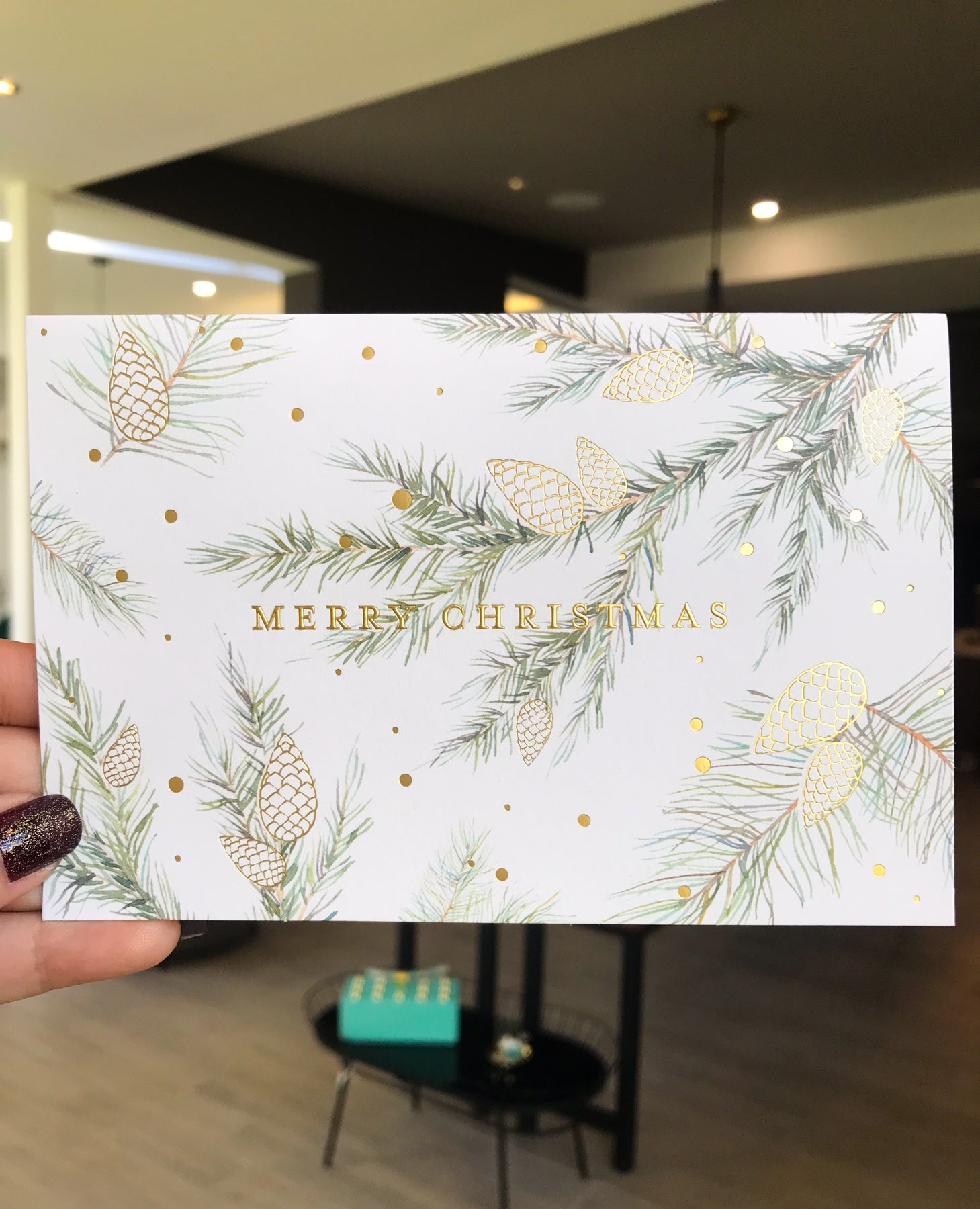 Wish friends and family a very Merry Christmas with these attractive and rustic cards, designed with pine tree branches and golden pinecones. Comes with 15 Christmas greeting cards, 15 envelopes, and 1 keepsake box. Holiday cards measure 4'' W x 6'' L.
