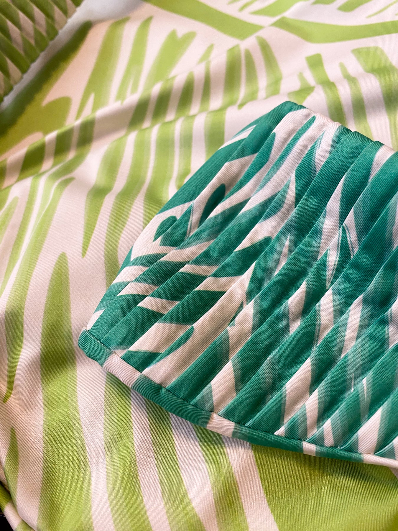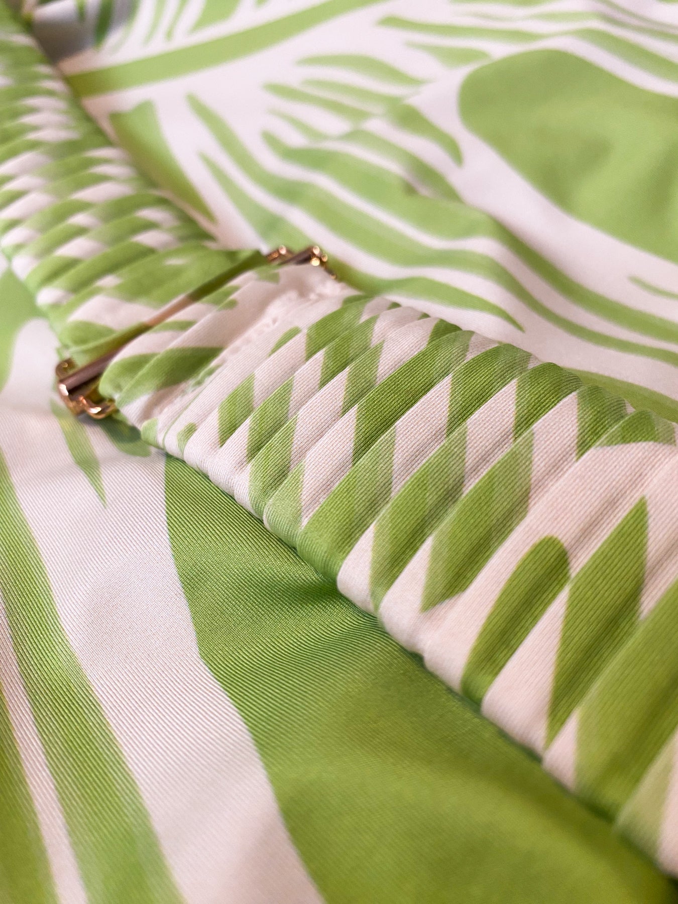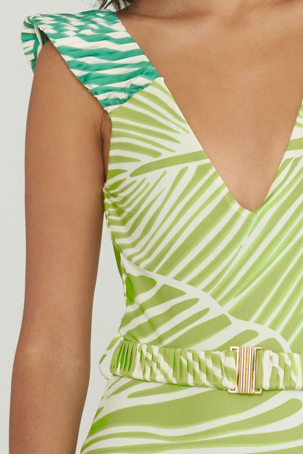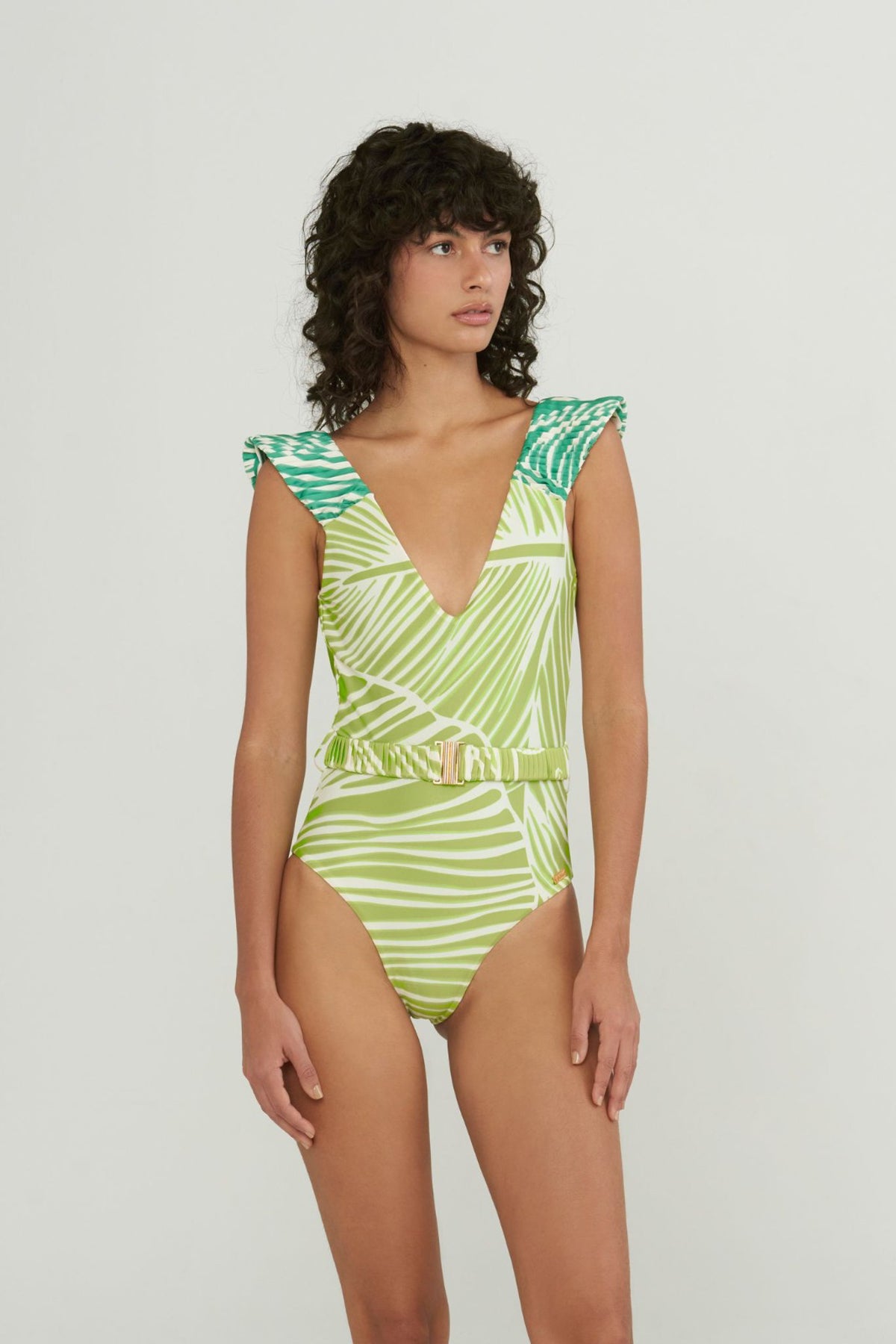 One-piece con el estampado Iguana. Características: Enterizo escote en v, con detalle de plisado en hombros, cinturón plisado con herraje, copas removibles.