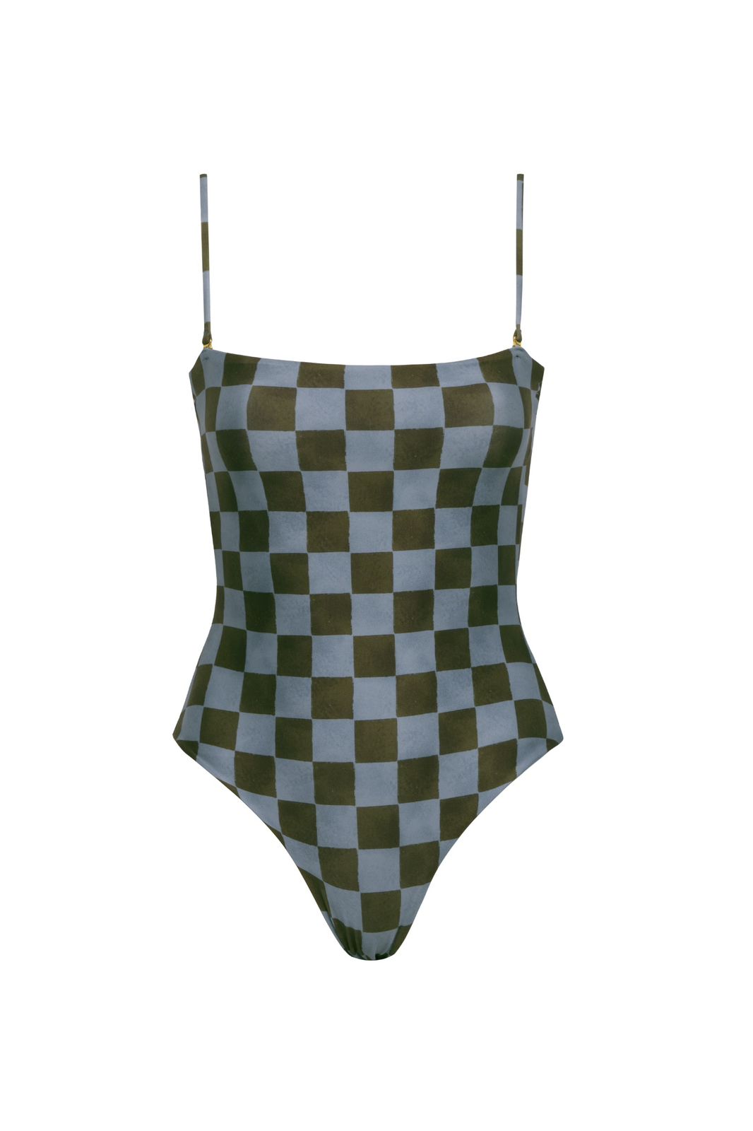Stylish one-piece swimsuit in a checkered blue pattern, featuring a straight neckline and removable straps. Includes removable padding for customizable comfort and style.