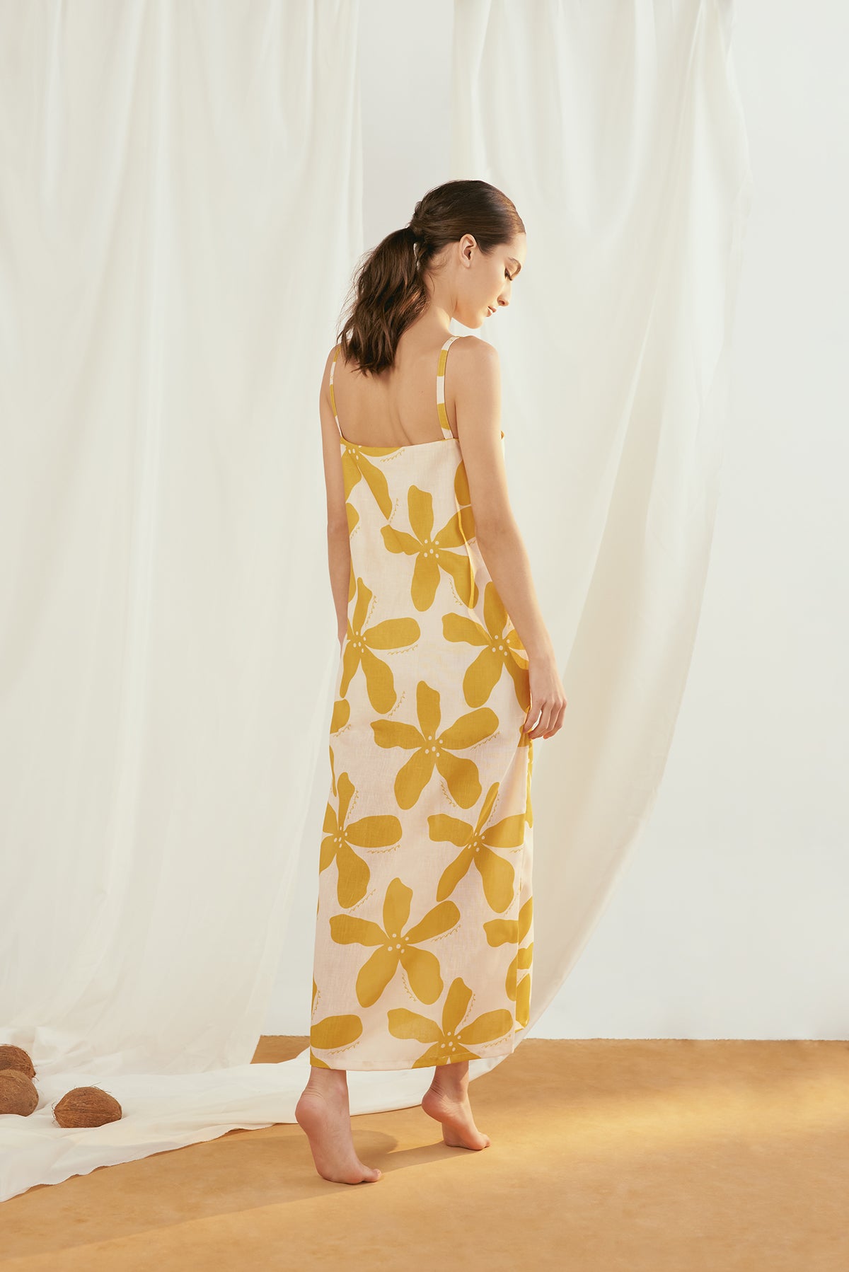 Vestido largo cuello recto con tiras en los hombros y abertura a los costados estampado de flores verde limón