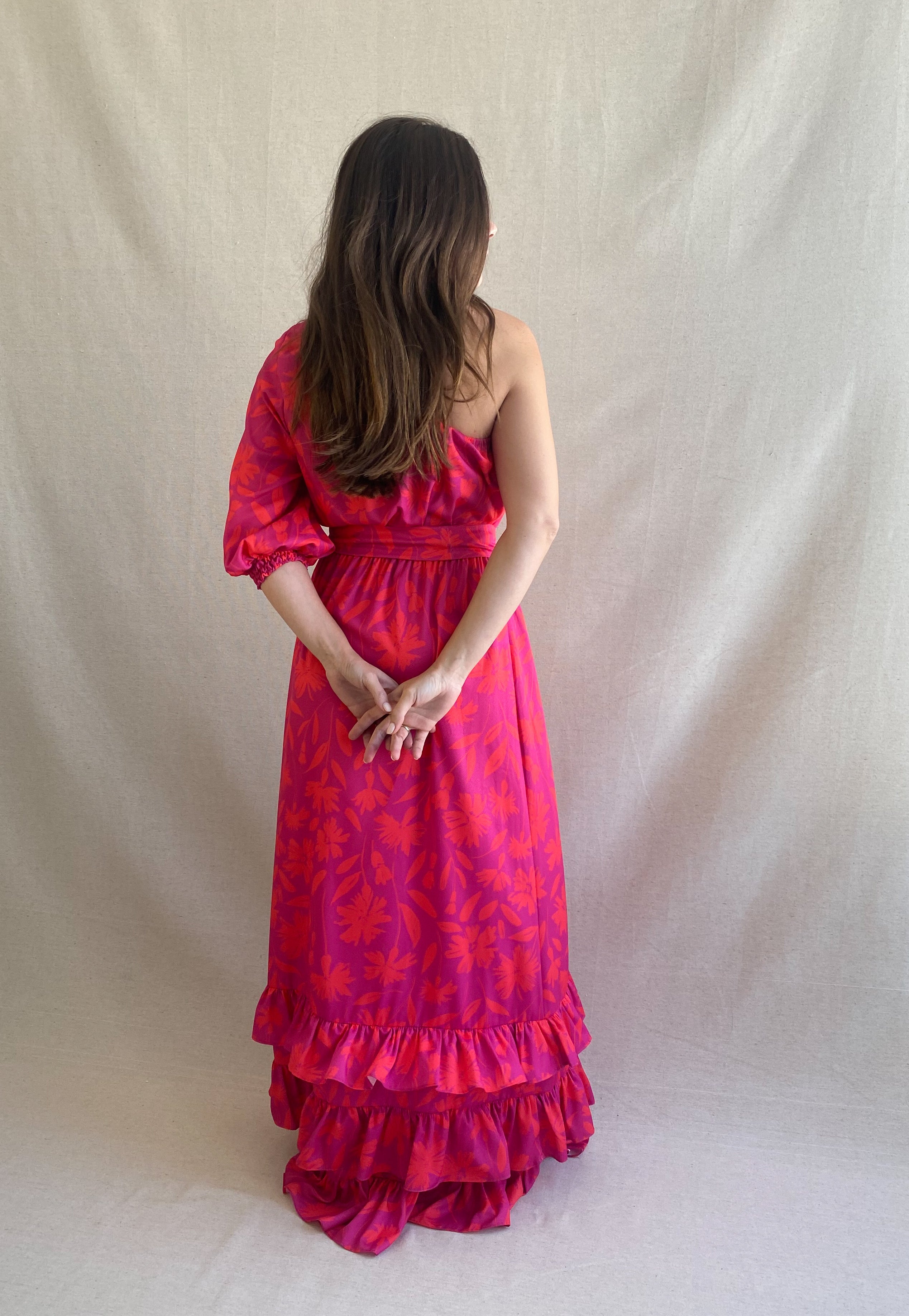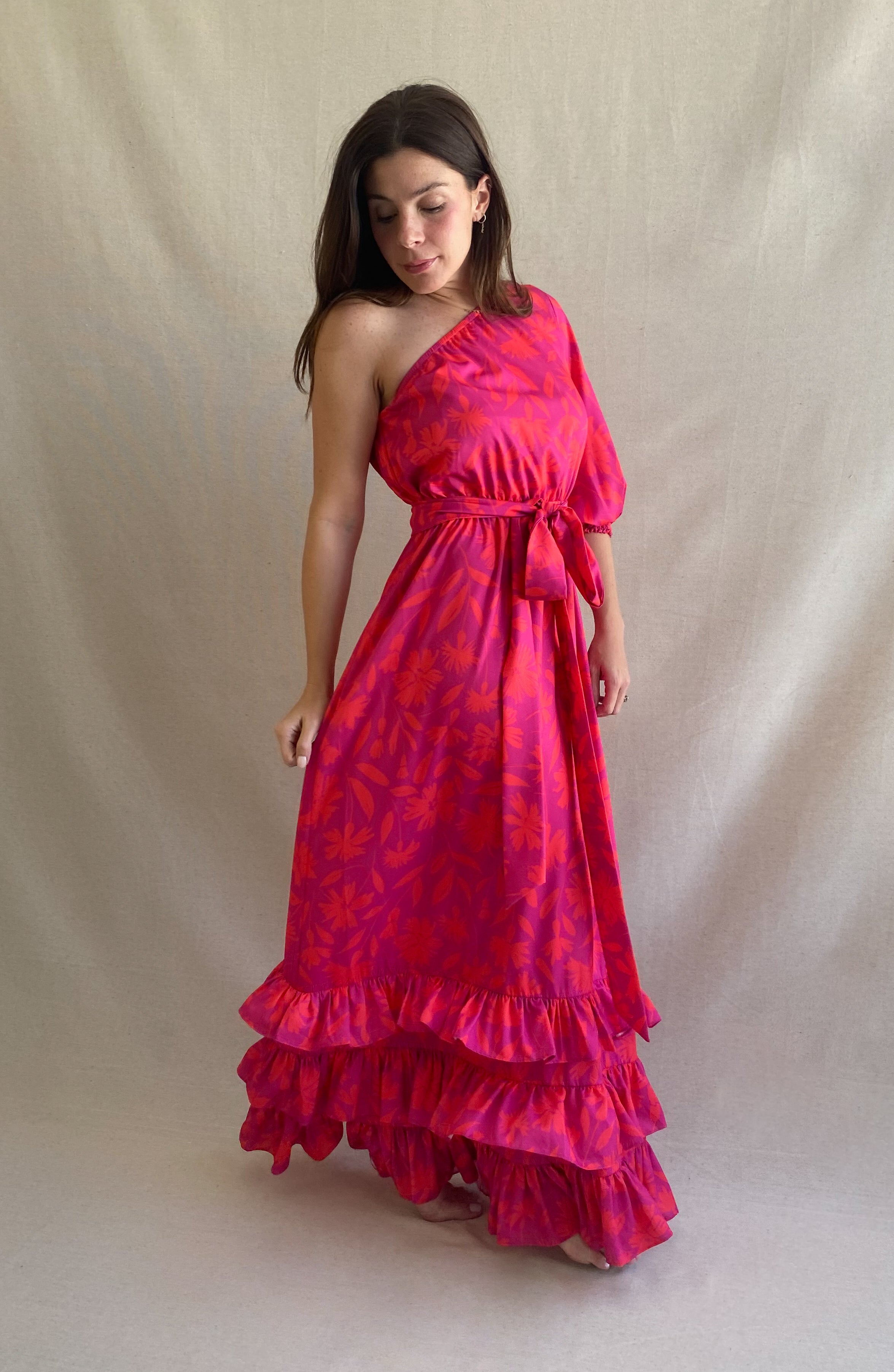 LORENA VESTIDO UN HOMBRO MANGA LARGA ROSA