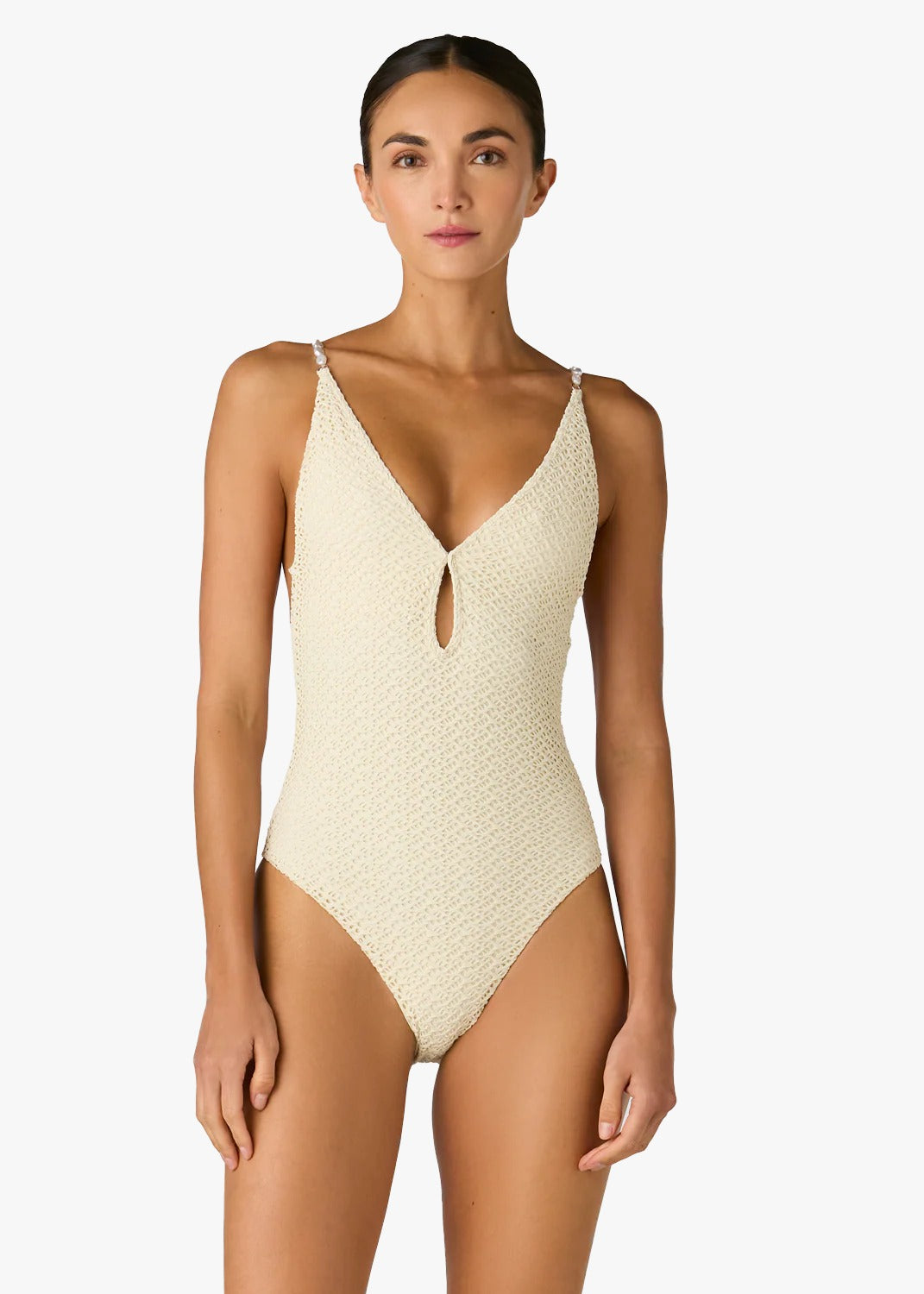Lucia one-piece swimsuit, crafted in crochet with a unique touch of pearls on the straps. This standout piece is designed to enhance your figure, offering a silhouette that perfectly blends elegance and uniqueness