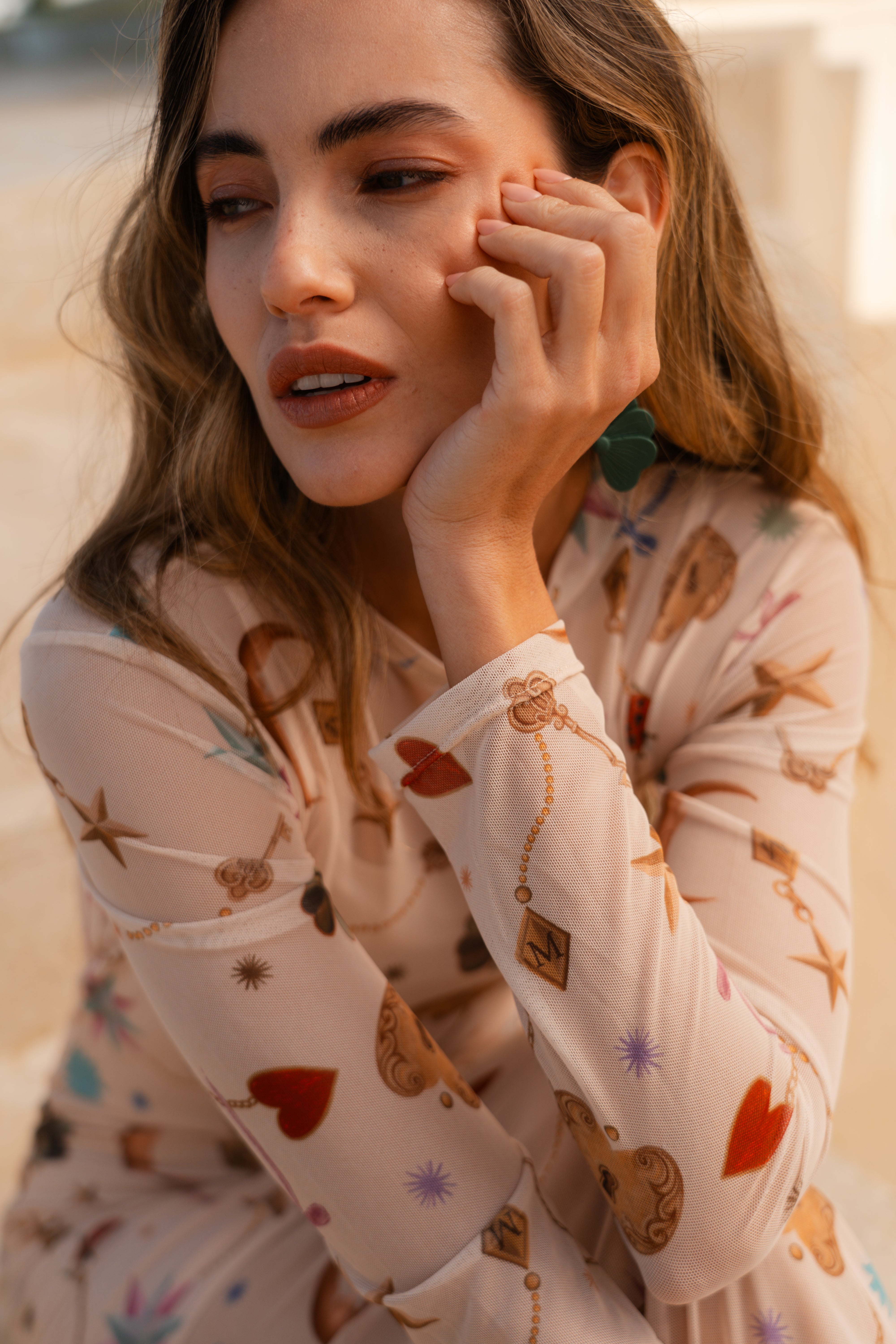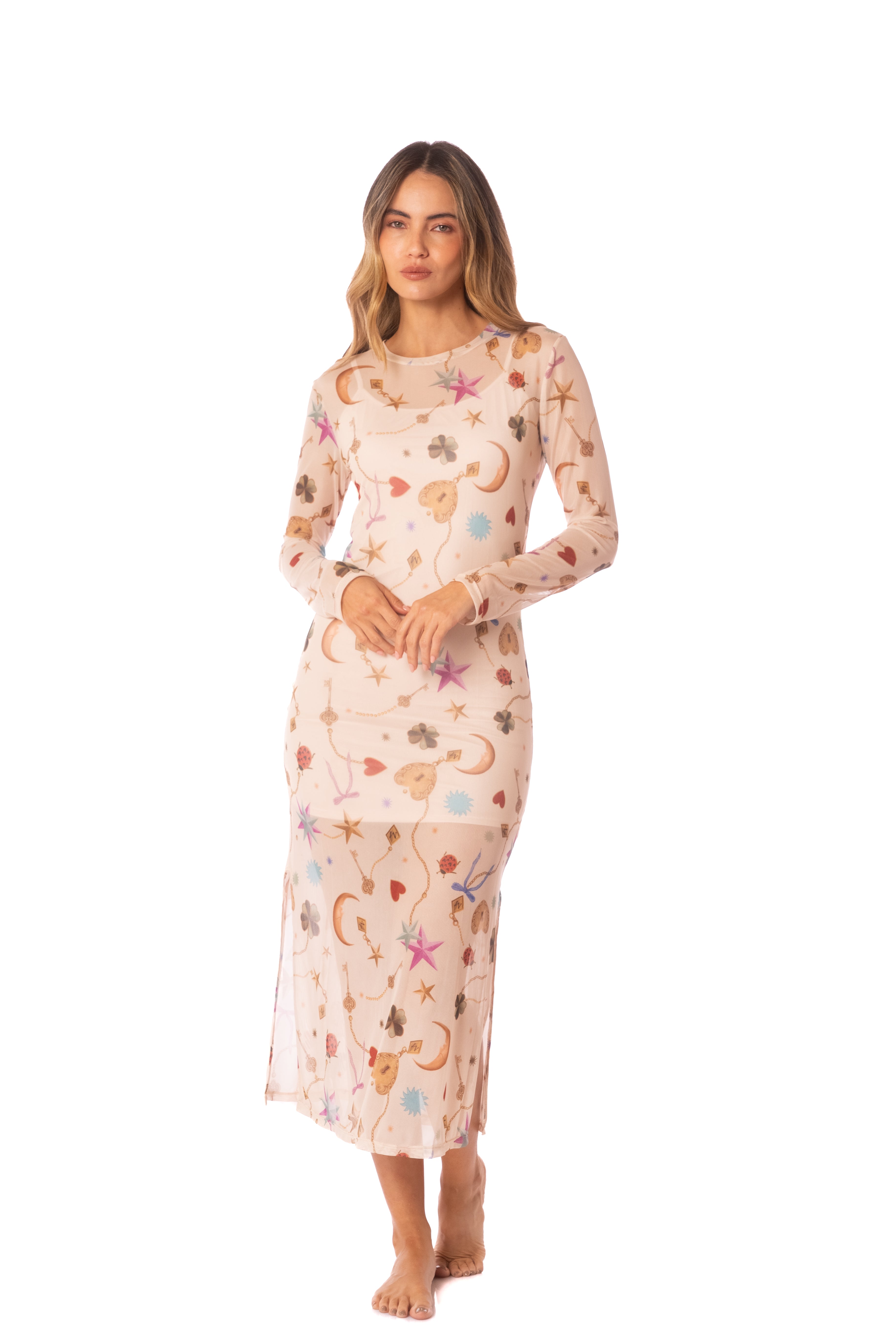 Vestido manga larga en Mesh (malla transparente) con estampado de amuletos, buena vibra, magia y color para tu día a día, puedes combinarlo con nuestros vestido de baño para crear un outfit único y muy cool. La tela es super cómoda y fluida.
