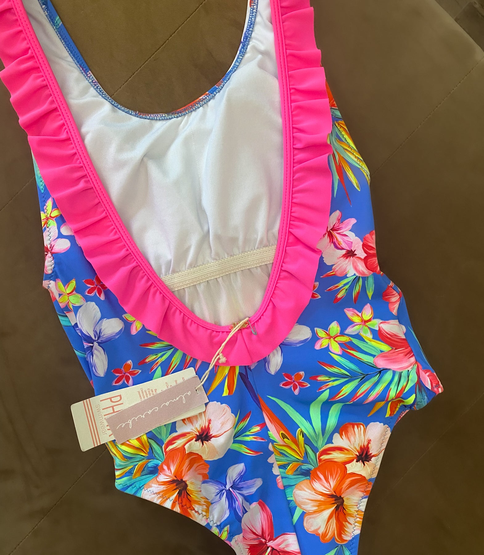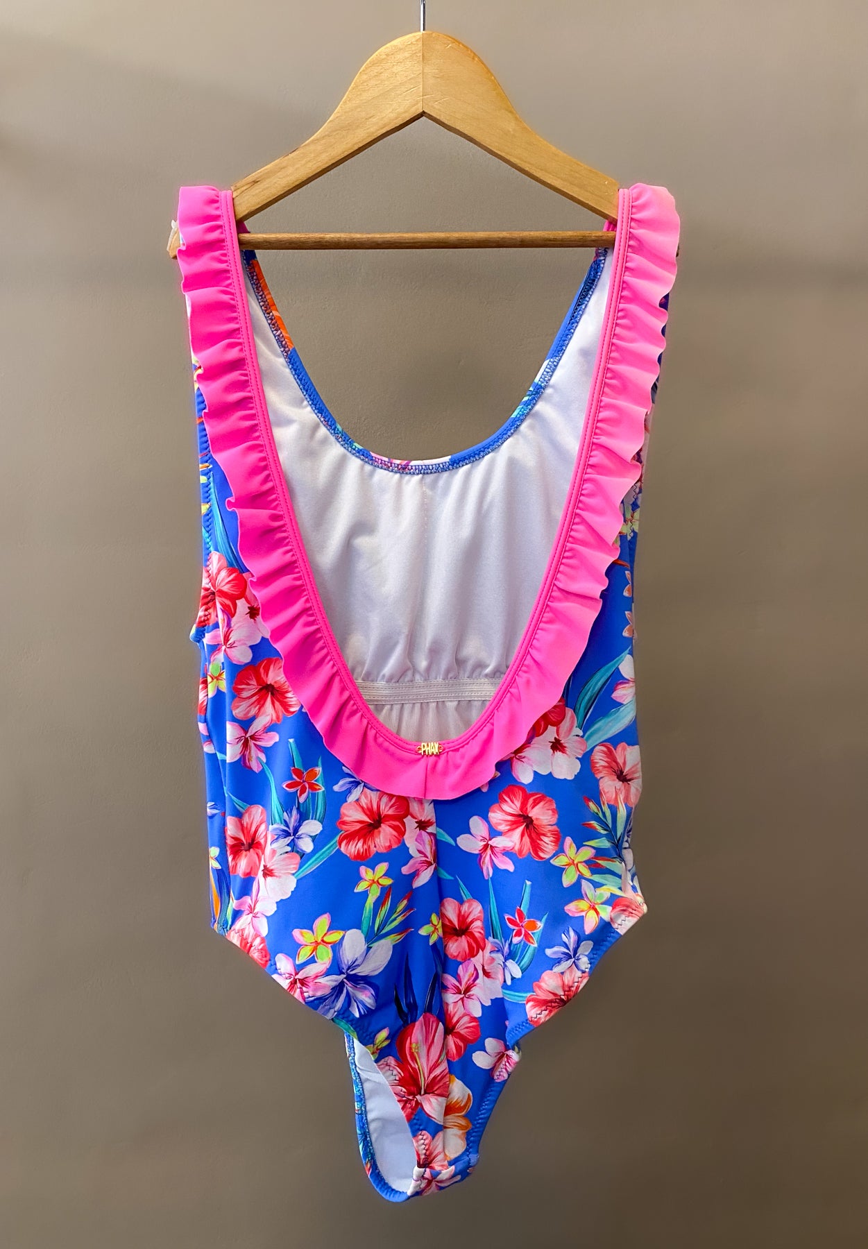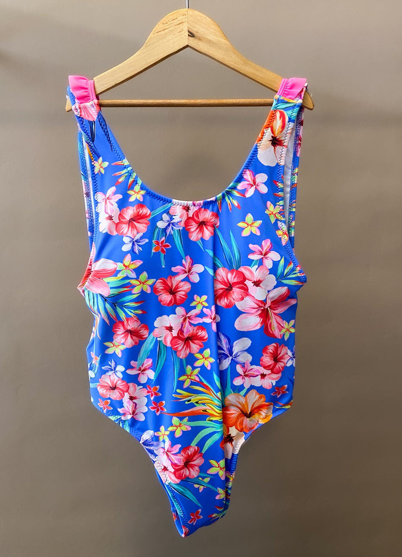 Entera Floreada Con Espalda En U Con Detalle rosado alrededor de la espalda.