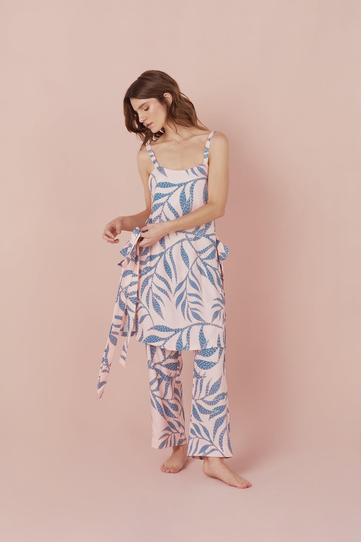 Blusón sin mangas con ajuste a los costados estampado en tonos rosa palo y aguamarina