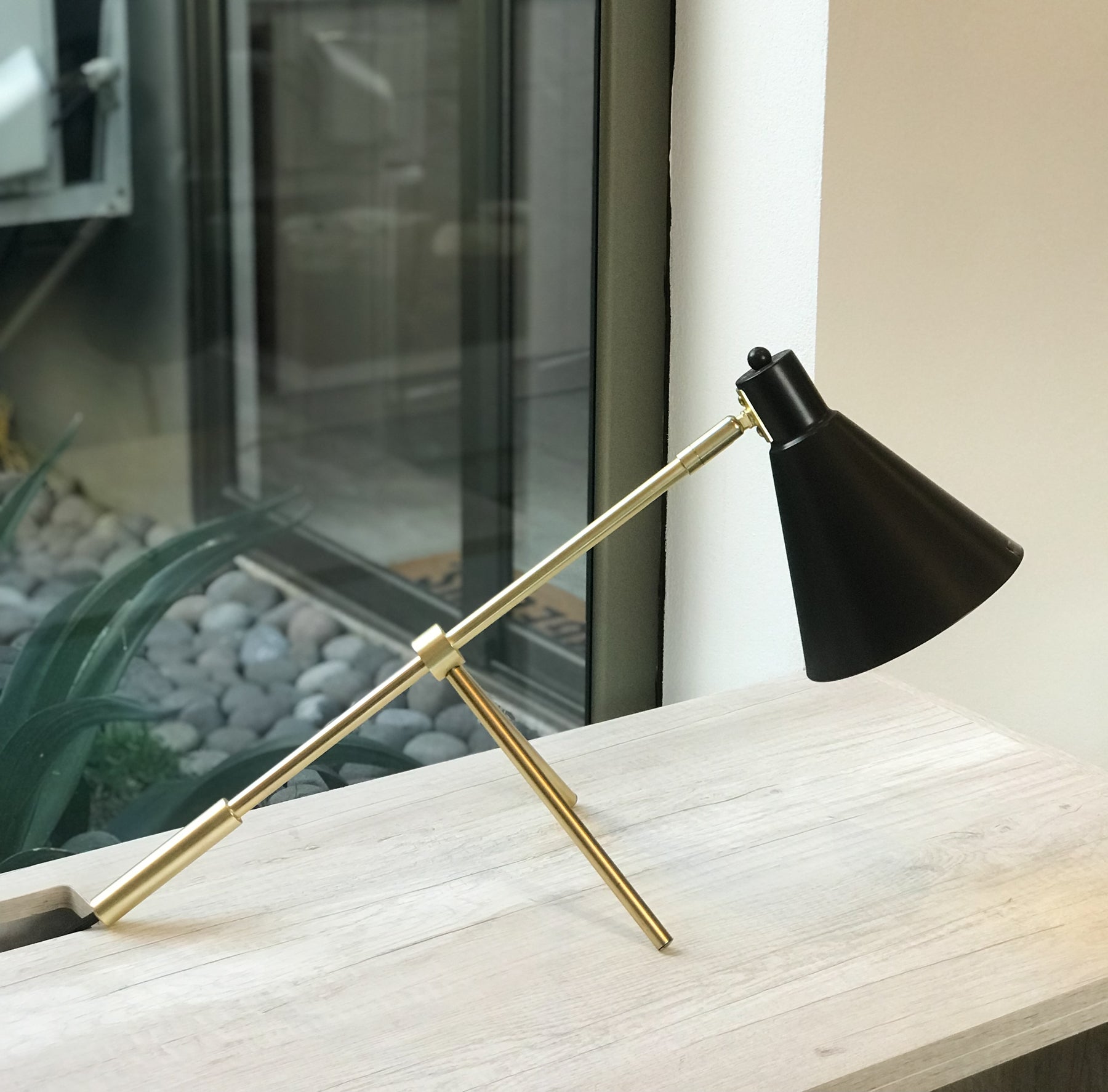 This is the sexiest table lamp you will ever lay your eyes on! Dark Brown metal sahde with a matte gold body, its look is just incredible! Measures 23.5" long x 9" wide x 13.5" high.