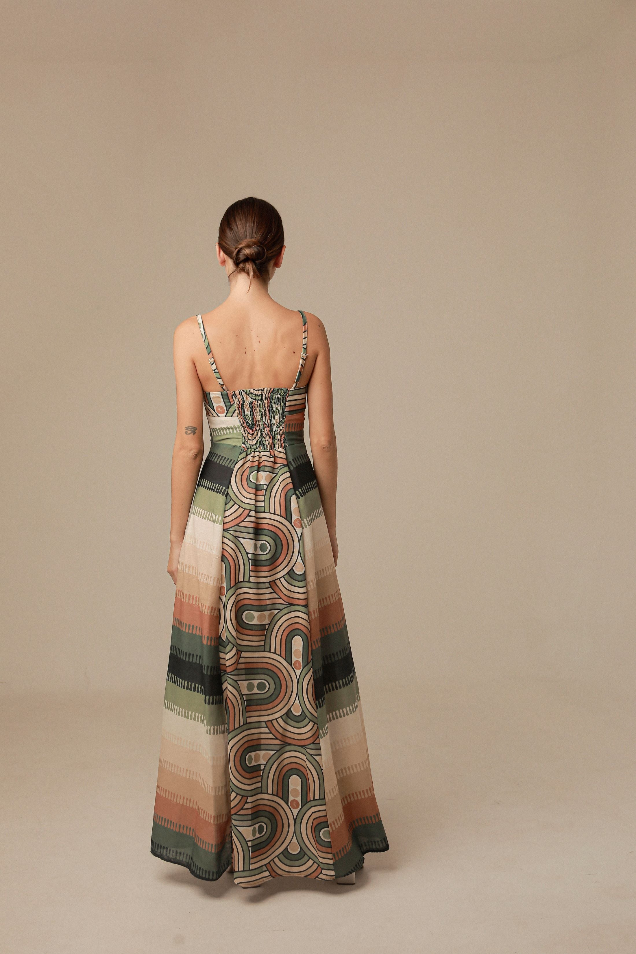MAXI DRESS ADJUSTABLE STRAPS, LOW NECKLINE IN THE MOST BEAUTIFUL PRINT AND TEXTURED FABRIC.