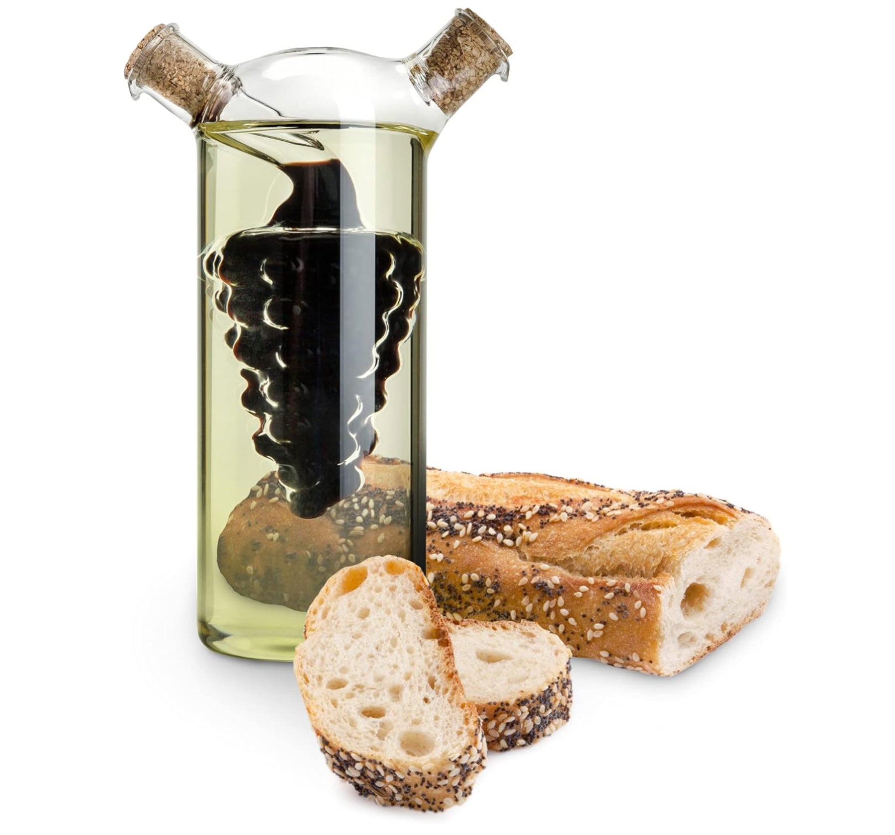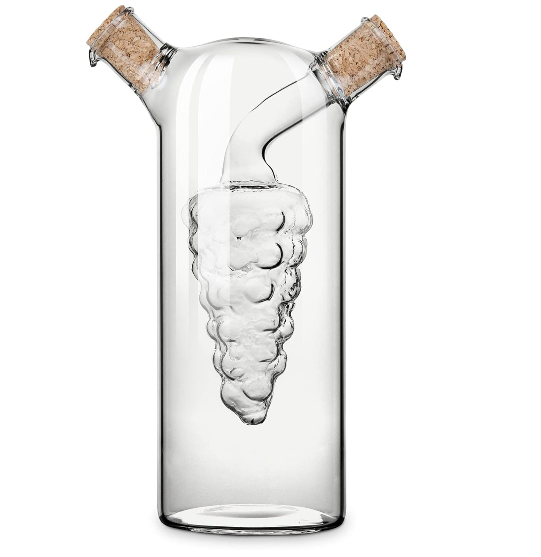 Elegant and unique, our hand-blown Napa Oil & Vinegar Cruet holds golden olive oil in its outer chamber and dark vinegar in a glass grape cluster within. Pour either from opposing sides, cork the spouts and let the carafe stand alone as an eye-catching centerpiece or counter topper.