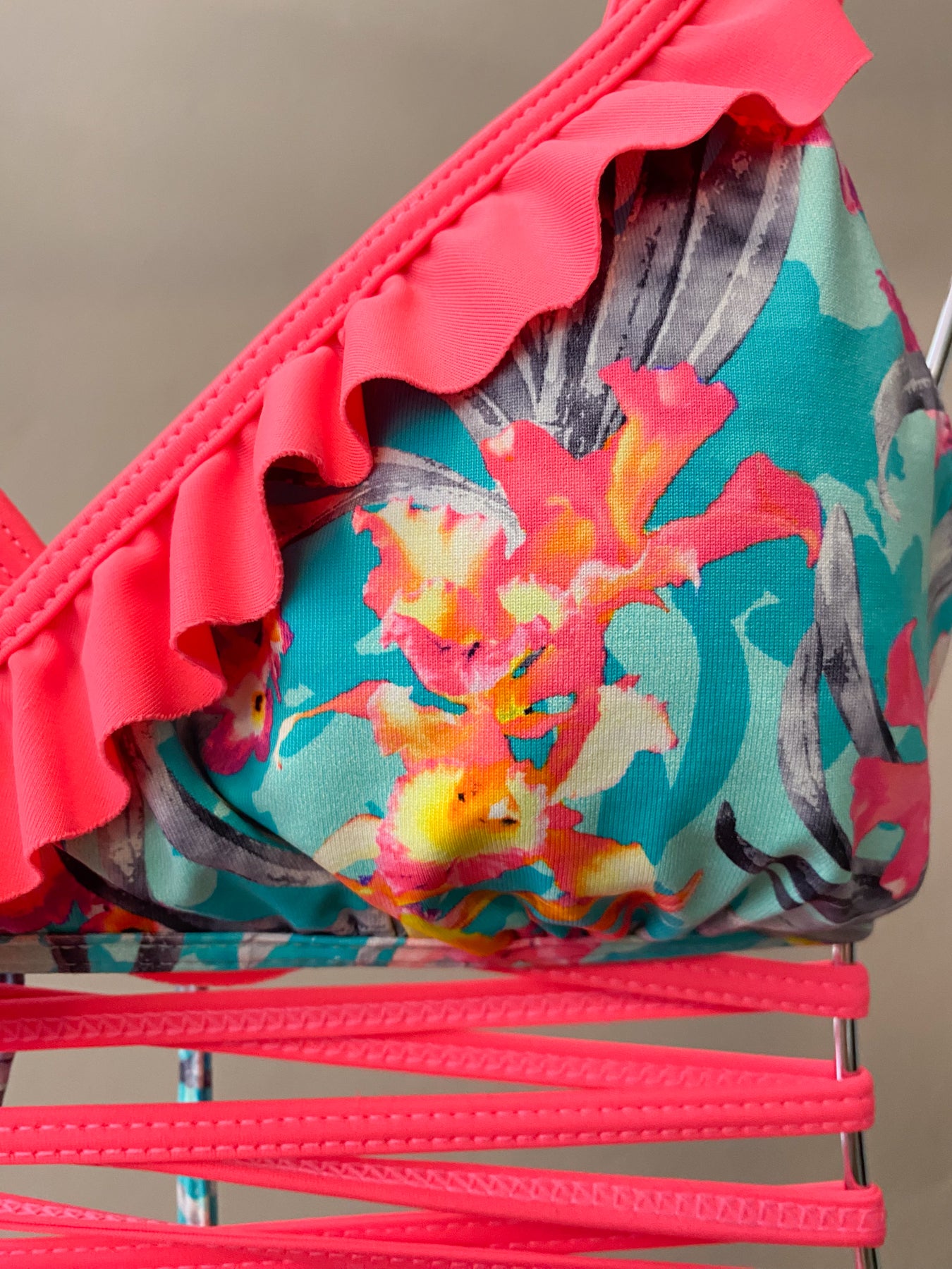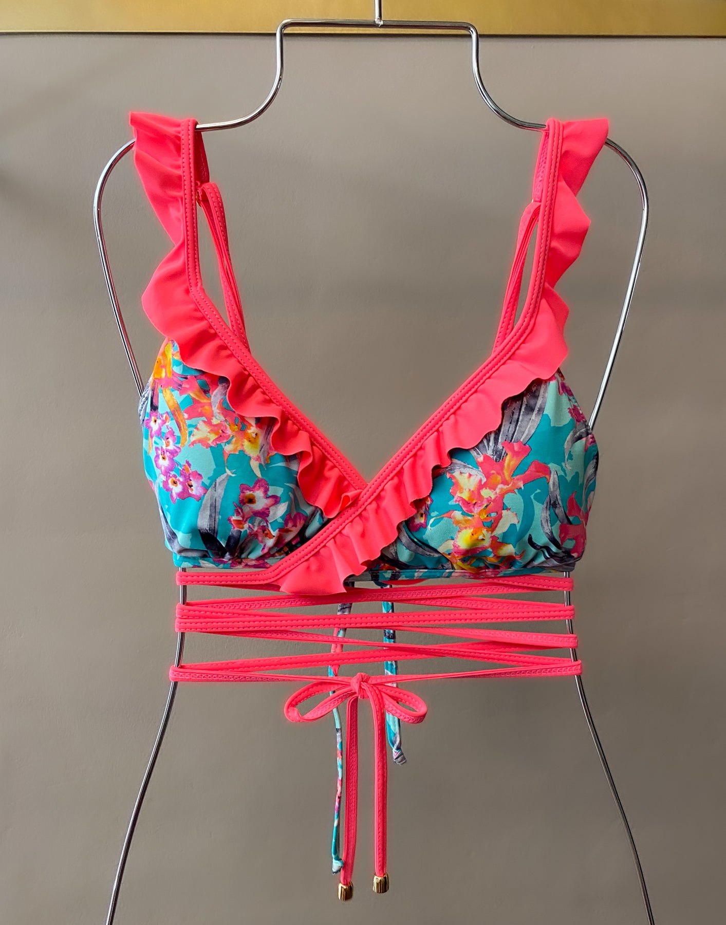 Top floreado multicolor enh fondo turquesa con pitas rosadas neon. Excelente pieza si deseas amarrarla en la cintura o abajo del busto. Frente traslapado.