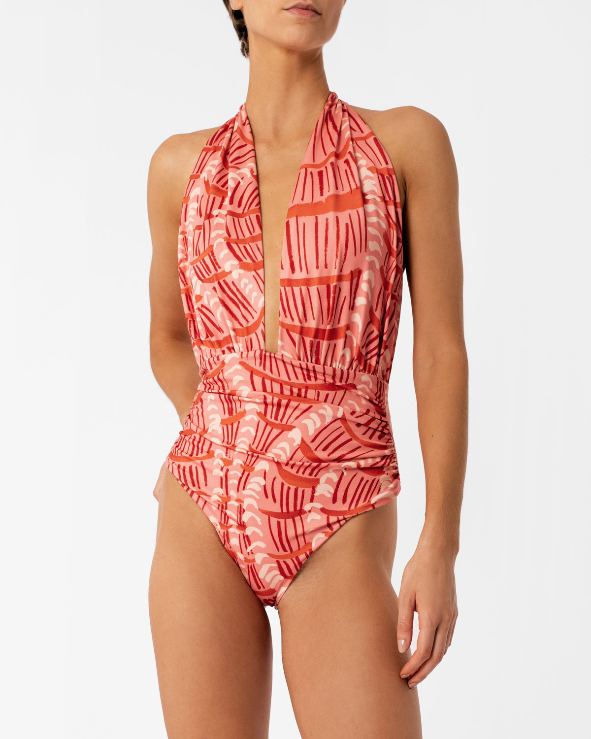 Traje de baño entero tipo halter ajustable, con escote pronunciado en V que lo hace sofisticado