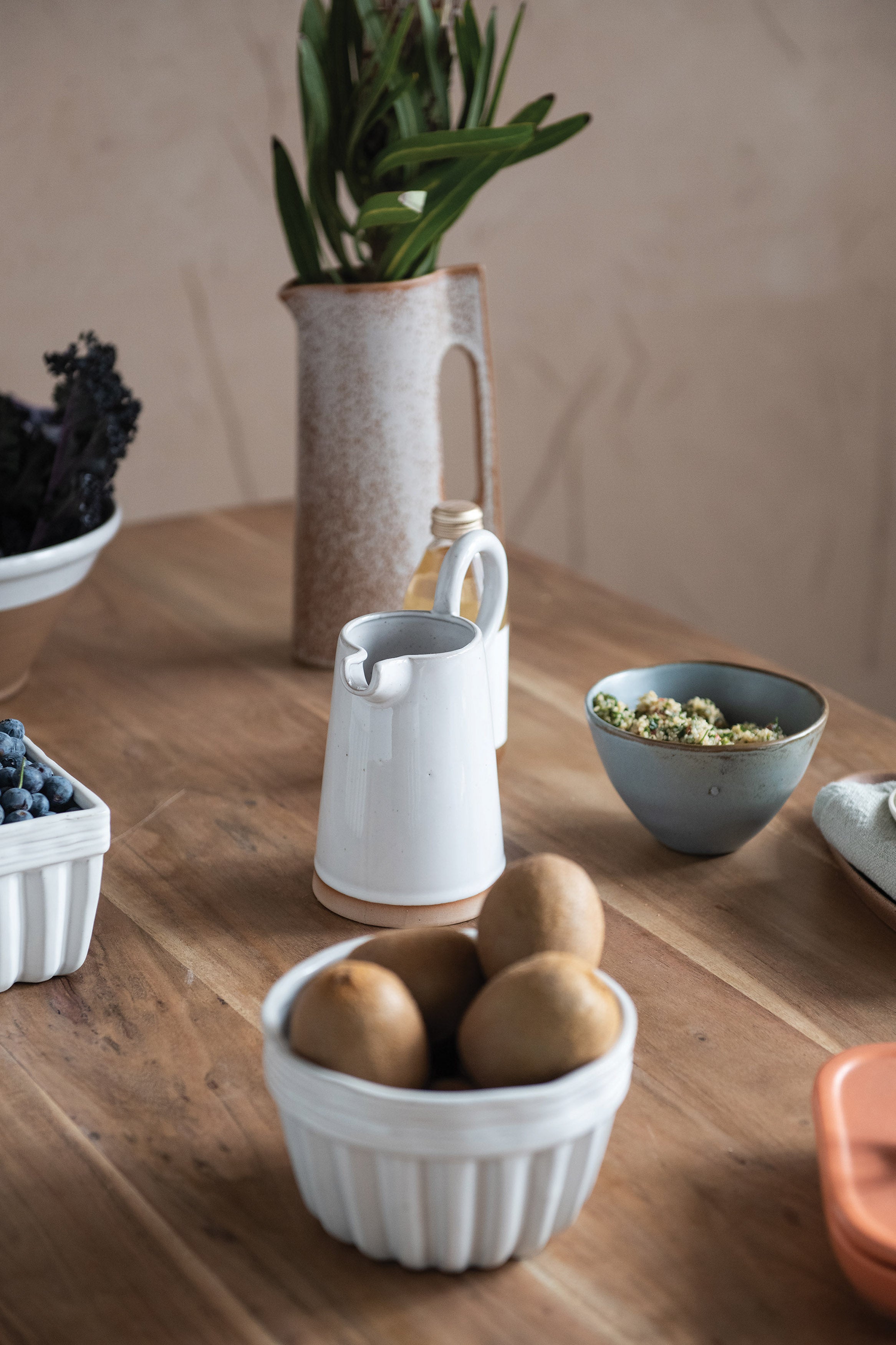 Here's our Stoneware Pitcher w a traditional reactive Glaze finish in White. This stoneware pitcher adds style to any kitchen. Measures 7" high.