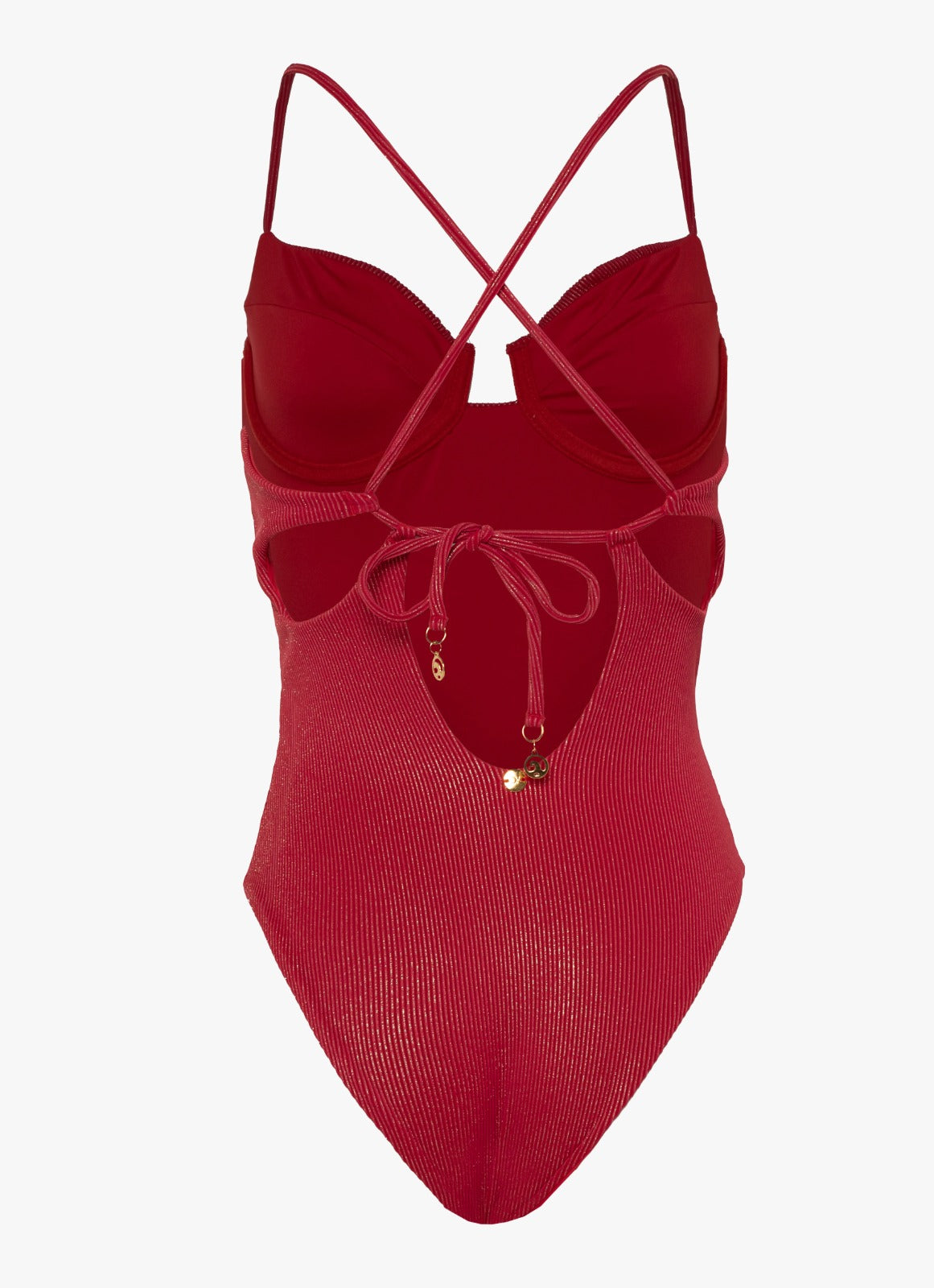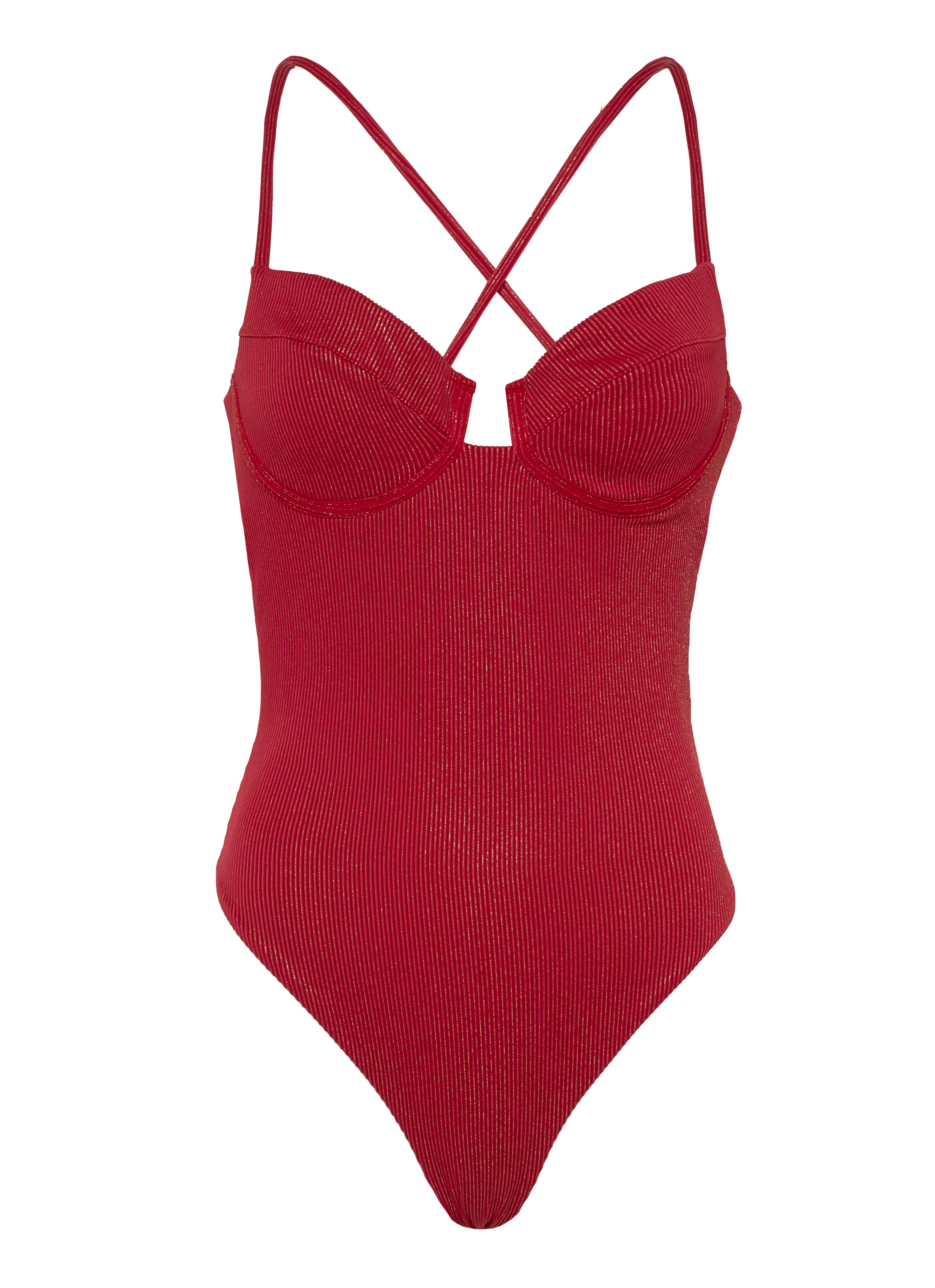 Classic One Piece. Underwire. Open Back. Textured Fabric. Ribbed / Shimmer. Adjustable straps. Back Tie Closure. Moderate Back coverage. Color: Red.