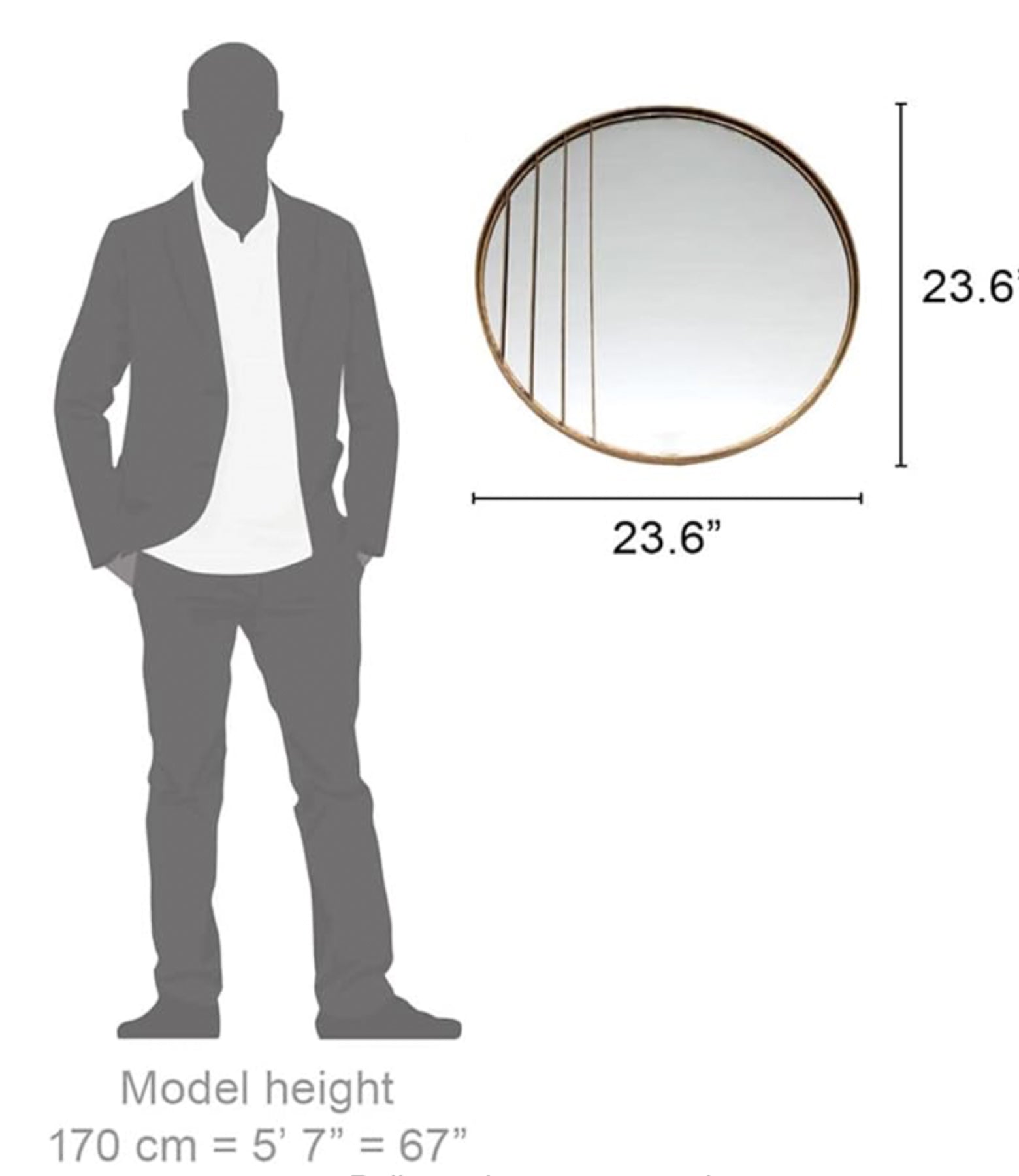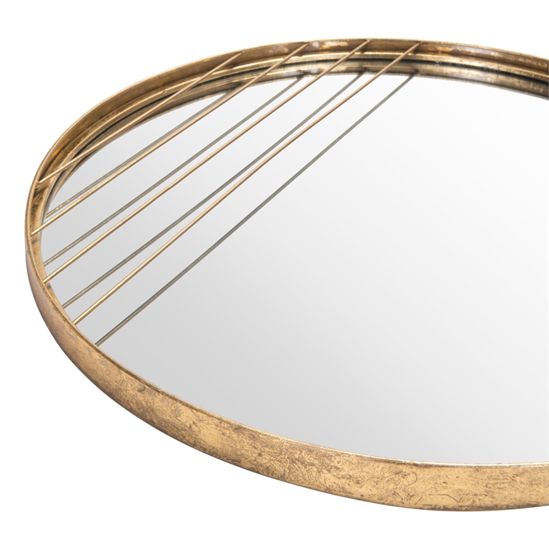 Antique gold mirror with linear design details to one side. It measures 60 cm in diameter.