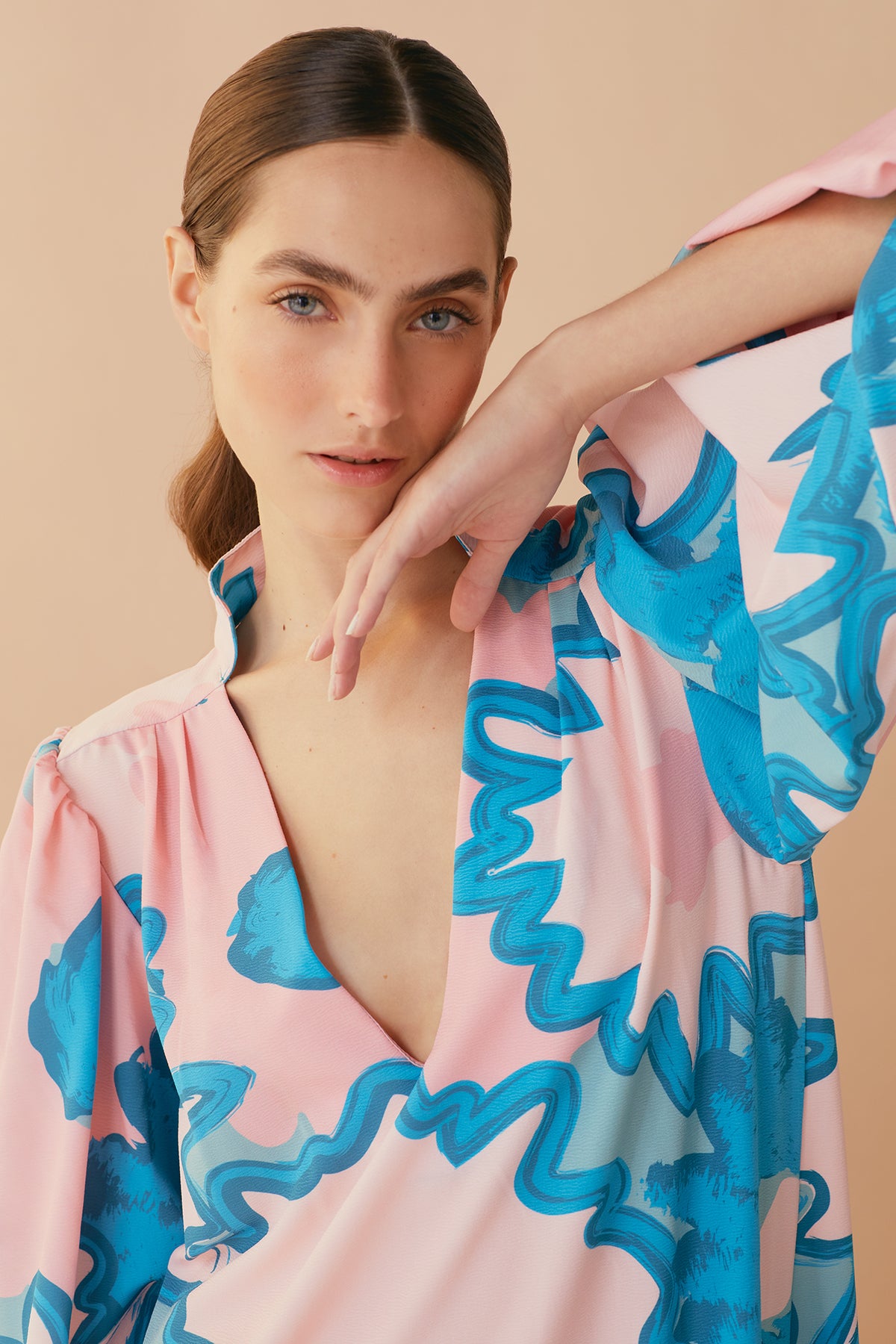Vestido cuello en V de manga larga con abertura a los costado estampado de flores asimétricas azules y rosadas.
