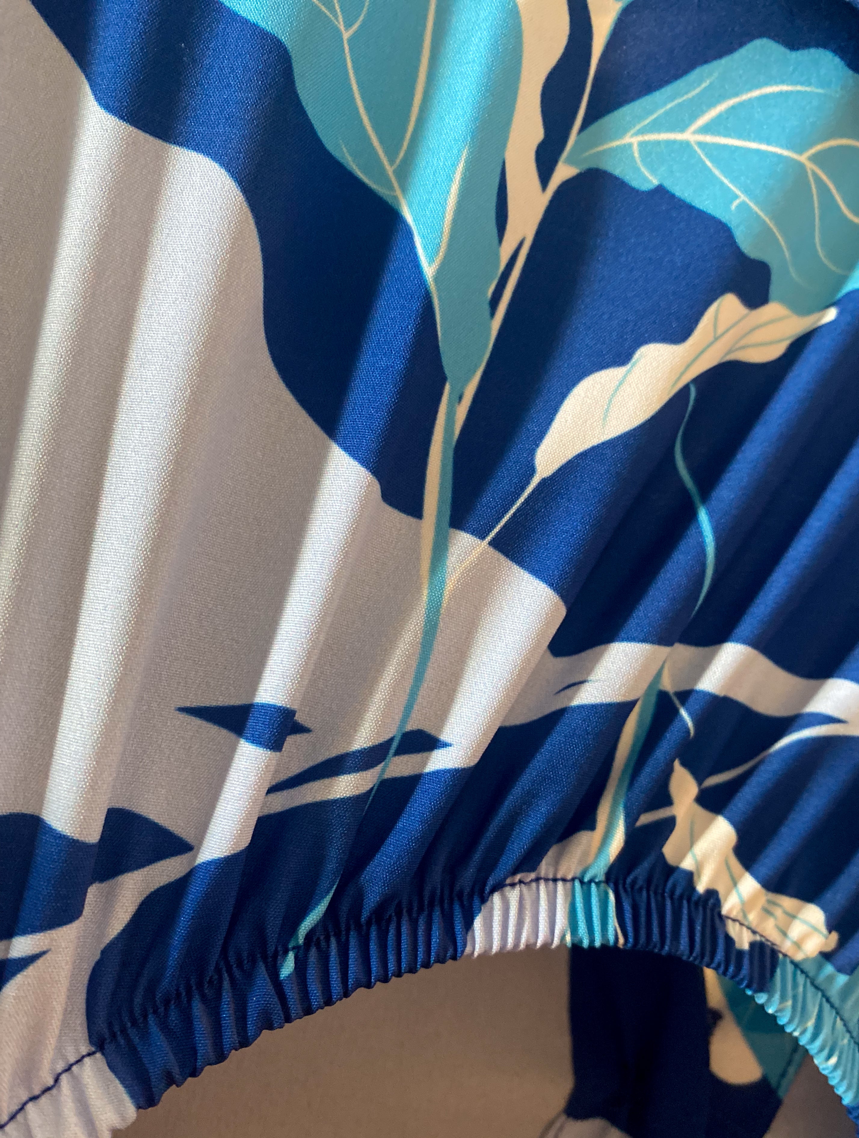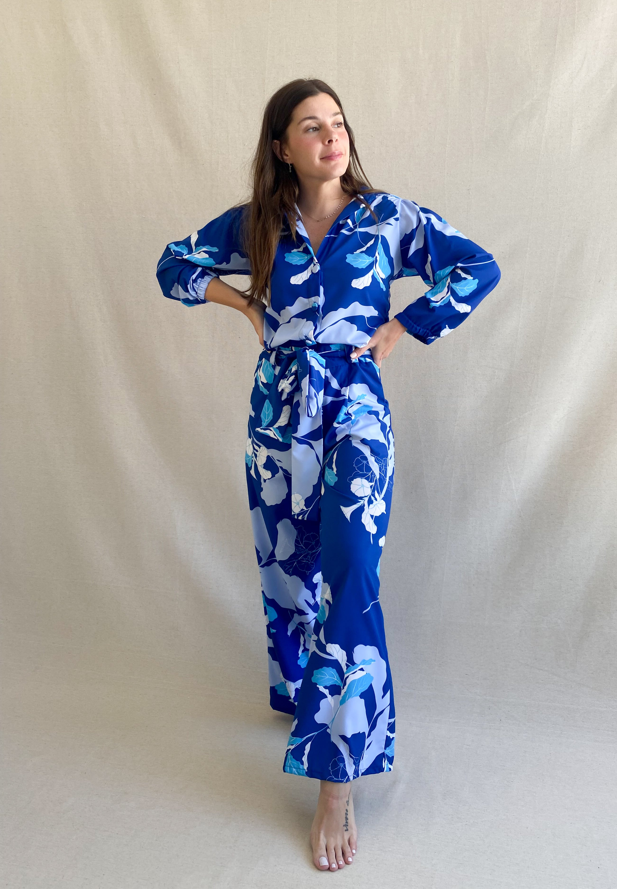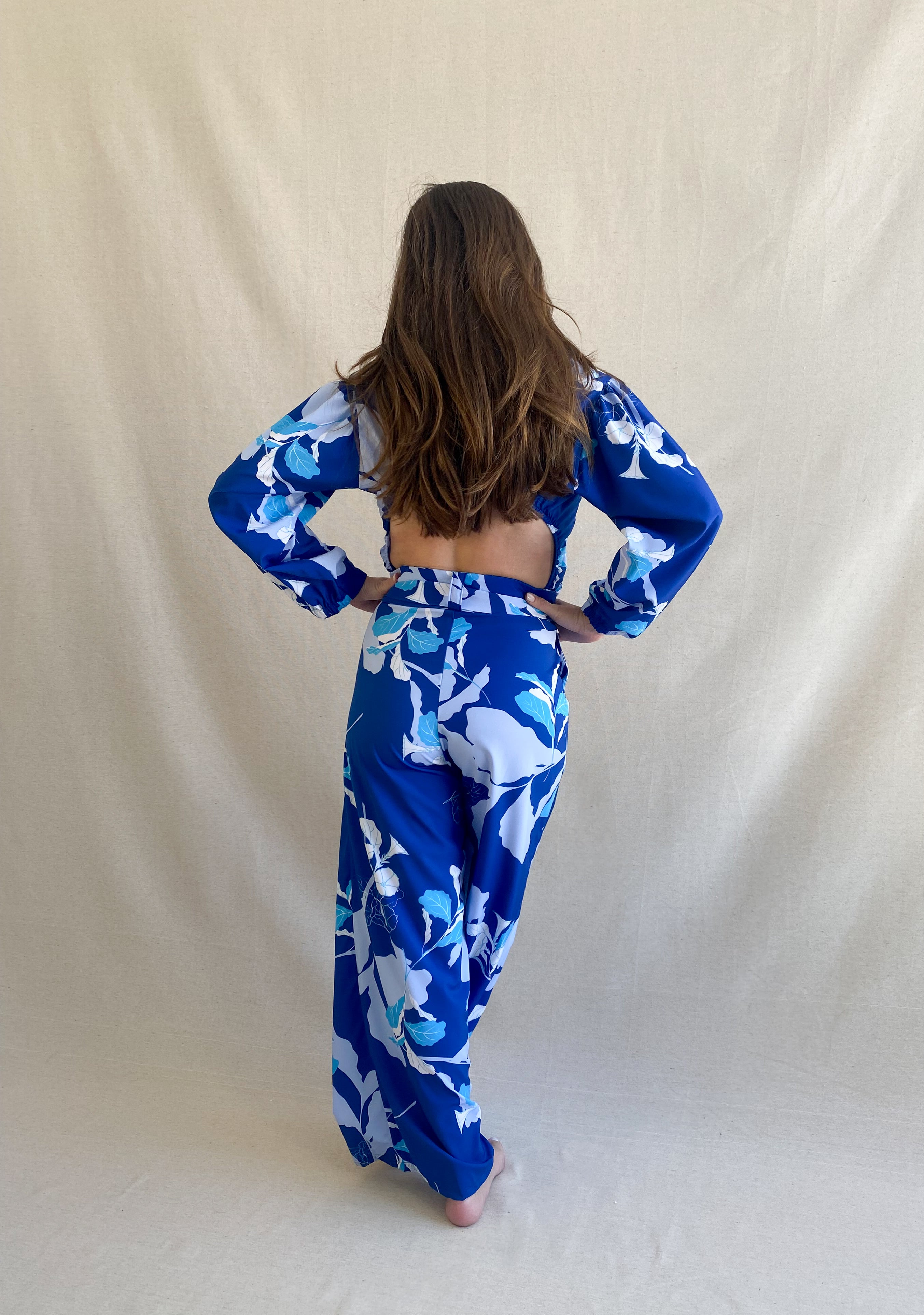 Este Jumpsuit esta disenado para una mujer a la que le gusta voltear miradas. Definitivamente un statement piece con sus azules intensos y su apertura en la espalda!