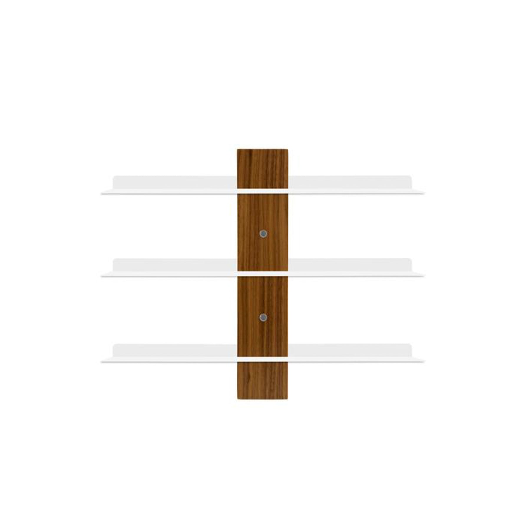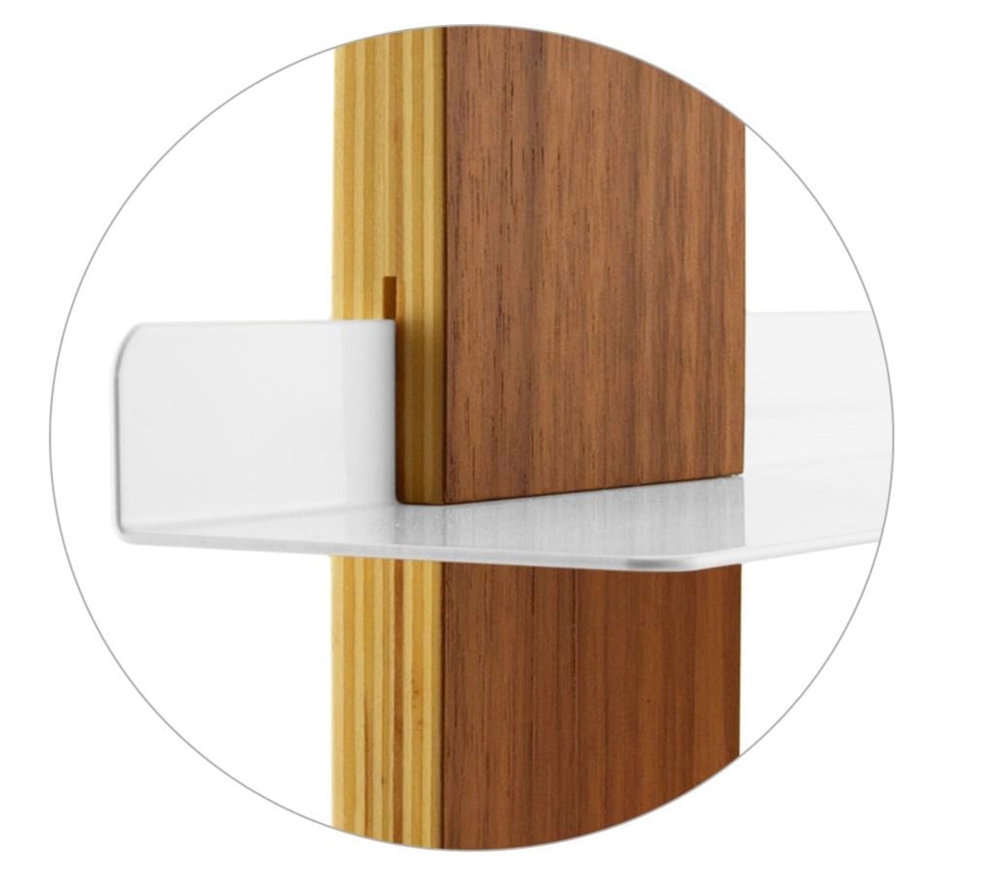 Thanks to hidden cutout grooves in the exposed-edge plywood base, three powder coated metal shelves can freely slide at any time for versatile display options; shelves can shift aside to allow tall items to sit on lower shelves or to accommodate odd-shaped wall areas.