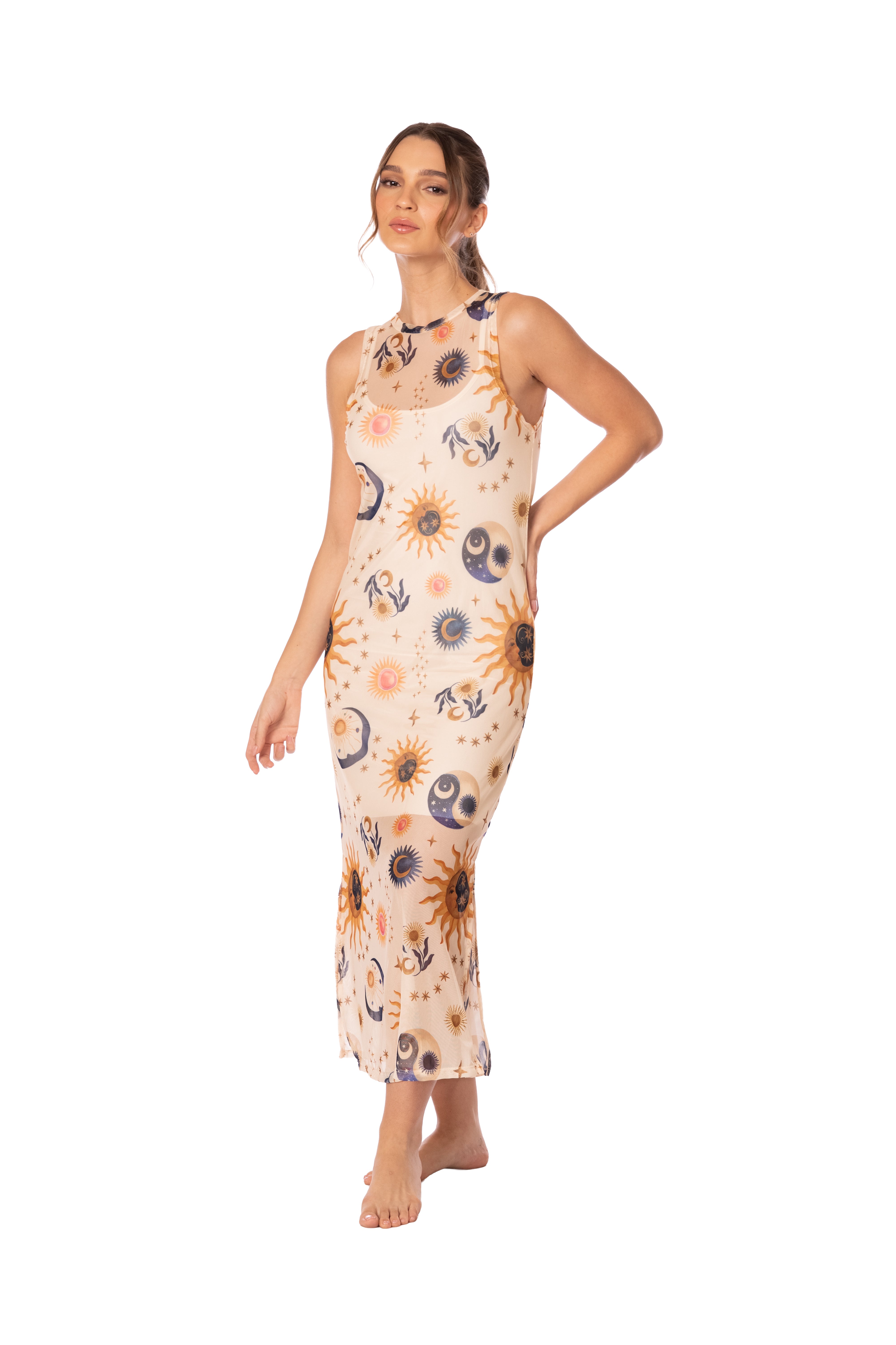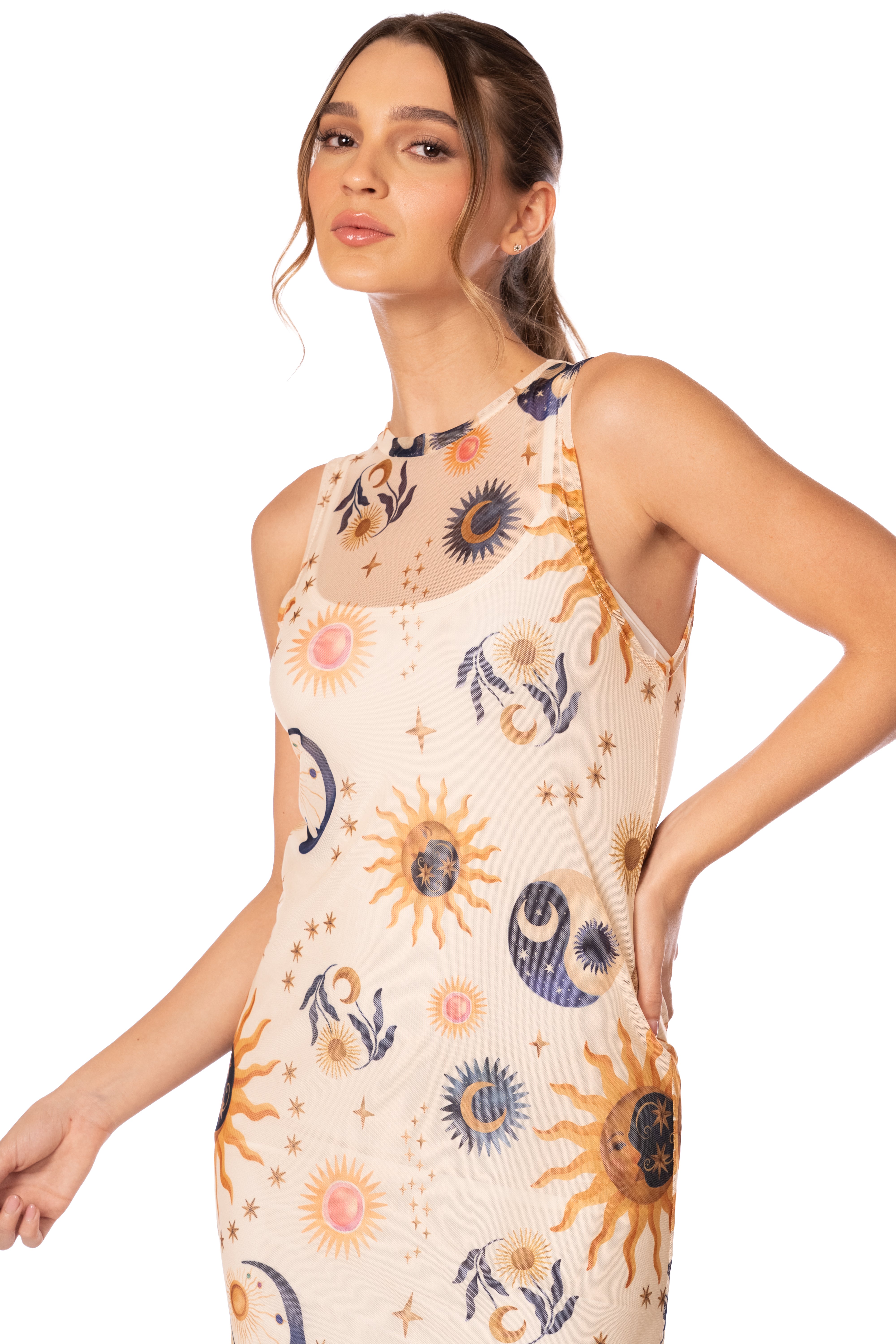Vestidos manga corta en Mesh (malla transparente) con estampado SOL Y LUNA lleno de amuletos, buena vibra, magia y versatilidad para tu día a día