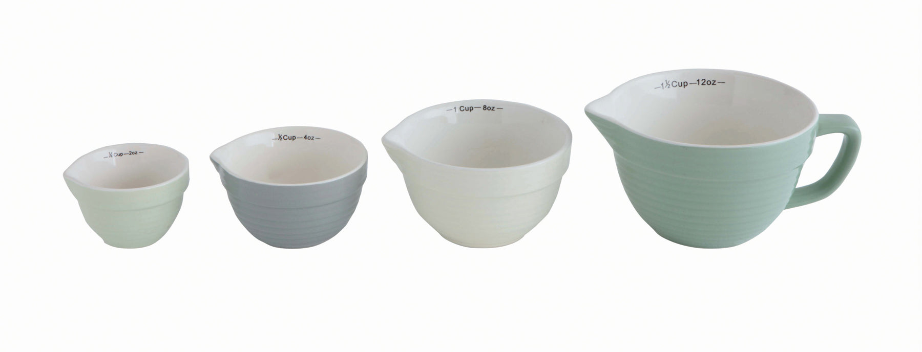 Stoneware Batter Bowl Measuring Cups - Includes 4 pieces, all with measurements in cups and ounces! Comes in a lovely mix of colors !