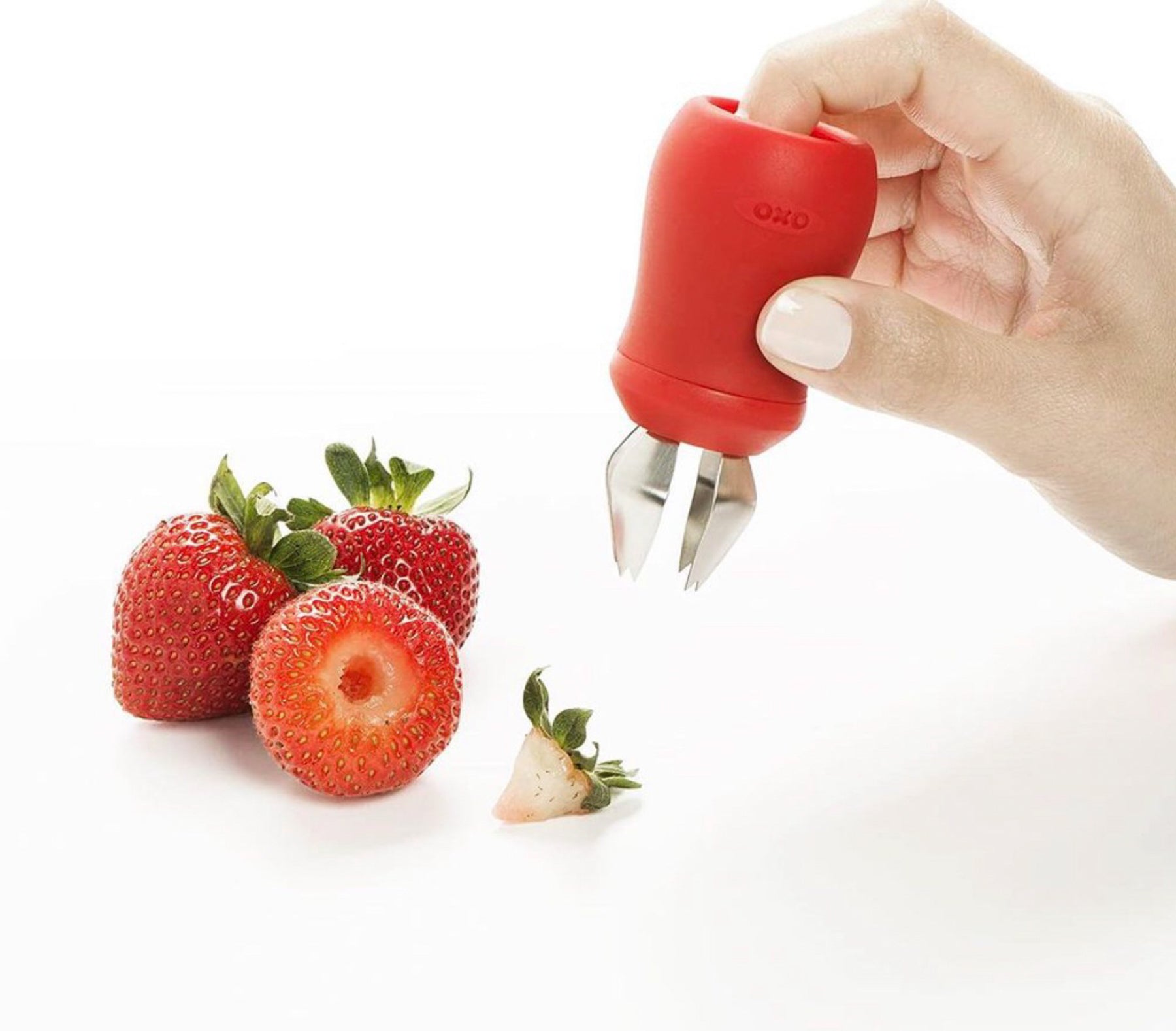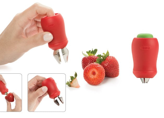 Prep pounds of strawberries quickly and easily. The OXO Good Grips Strawberry Huller is designed with stainless steel, which helps make quick work of strawberry hulls without wasting any precious fruit, so you stay comfortable whether hulling strawberries for snacks or baking. The Huller works with strawberries of all shapes and sizes and is also great for tomatoes. Dishwasher safe.