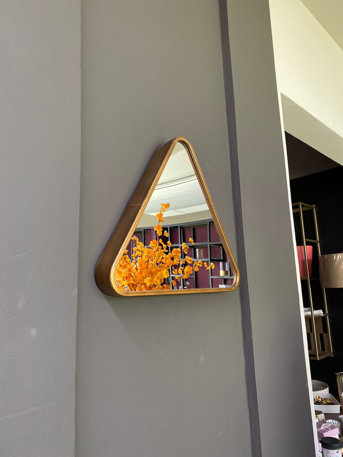 Espejo triangular tamano pequeno. Cada lado mide aproximdamente 43cm. Tiene un marco dorado antiguo!