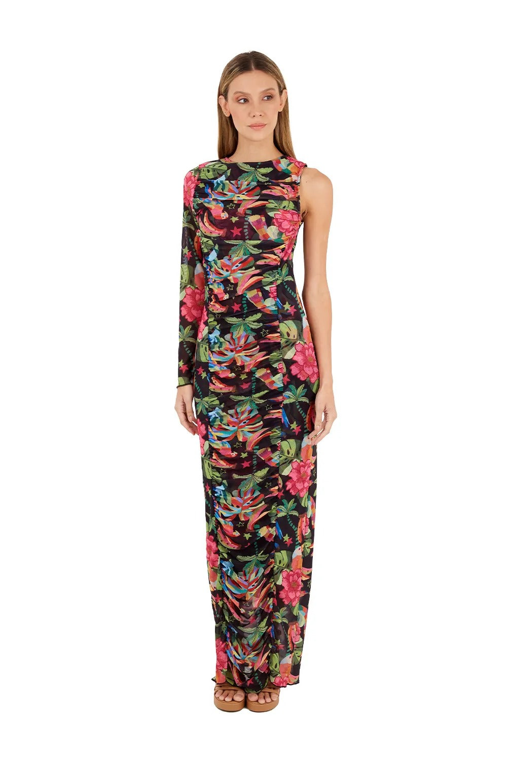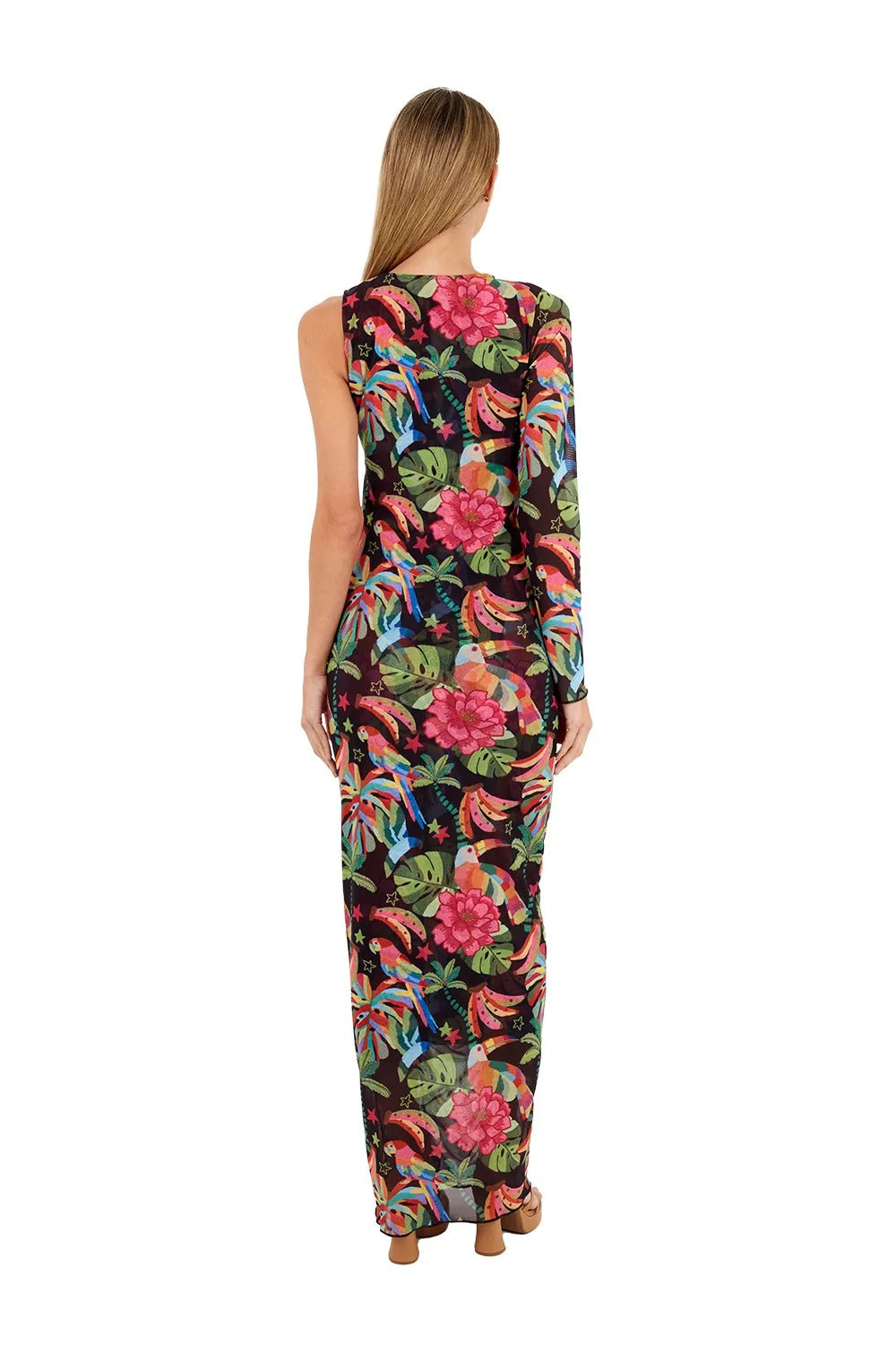 Vestido de un hombro, en tela de estampado unico de Mercedes Campuzano.