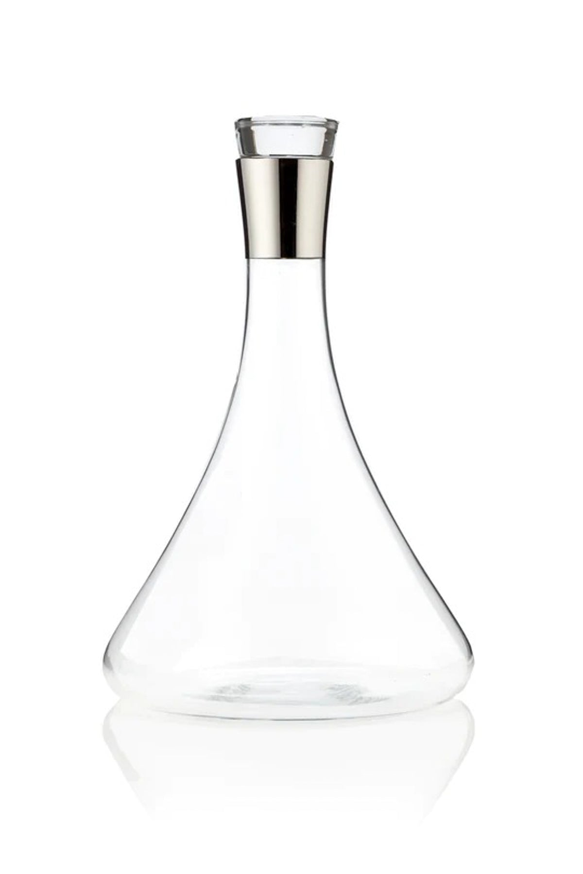 Add a sleek chrome band to an already streamlined decanter and play mixologist from your home bar cart, or sommelier in your dining room. The pyramidal bottle holds 60 ounces of fine wine or liquor and allows a precise, clean pour into every glass.